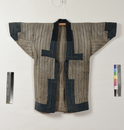 収集地:樺太,もじり袖 紺縞 襟・裾・袖口に紺木綿切伏・文様刺繍(紺木綿糸・織入緯縞地