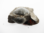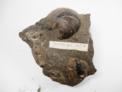 細粒均質な黒色硬砂岩中に含まれるふくらみの強い卵三角形殻を示す。 産地不明