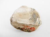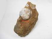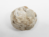 黄灰色な細粒砂岩に含まれる厚質類円殻で、同心円状の成長輪脈がある。 産地不明
