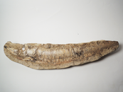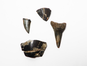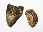 俗称を「天狗の爪」とも呼ばれる肉食性のサメ(ホオジロサメ科)の化石歯で,表面は滑らかなエナメル質,青磁色をおびて美しい。歯先まで約7㎝(標本2個),先端がノミの刃先のように鋭くとがり,切縁は細鋸歯状を呈する。 宮城県泉市七北田町(旧宮城県七北田村) 産