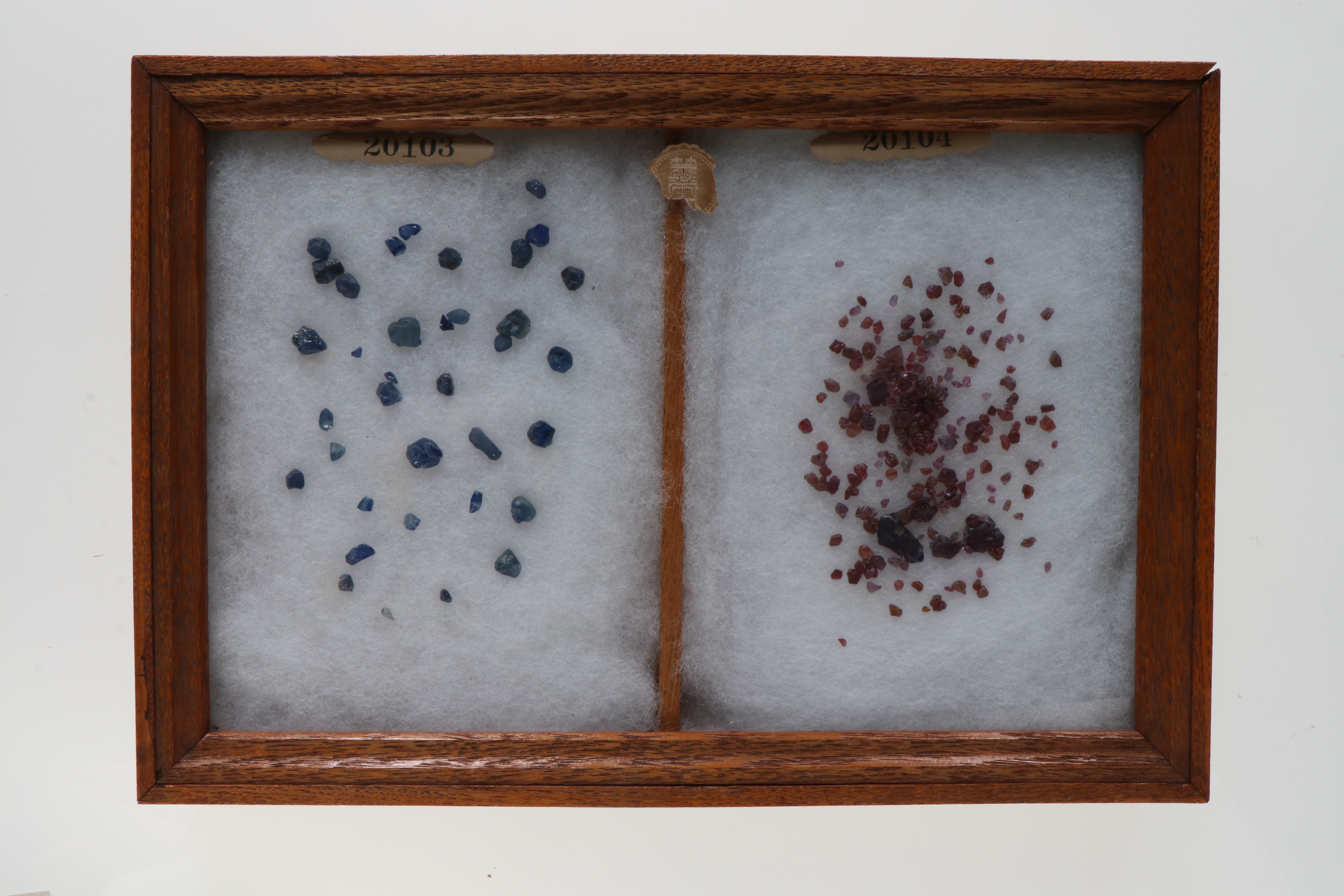 砂鉱から採取した直径2~3㎜大の結晶粒で円みをもつものが多い。赤紫色からピンク色,鮭肉色,フジ色をおびるが,濃色な紅玉では黒紫を呈する。シャム産。