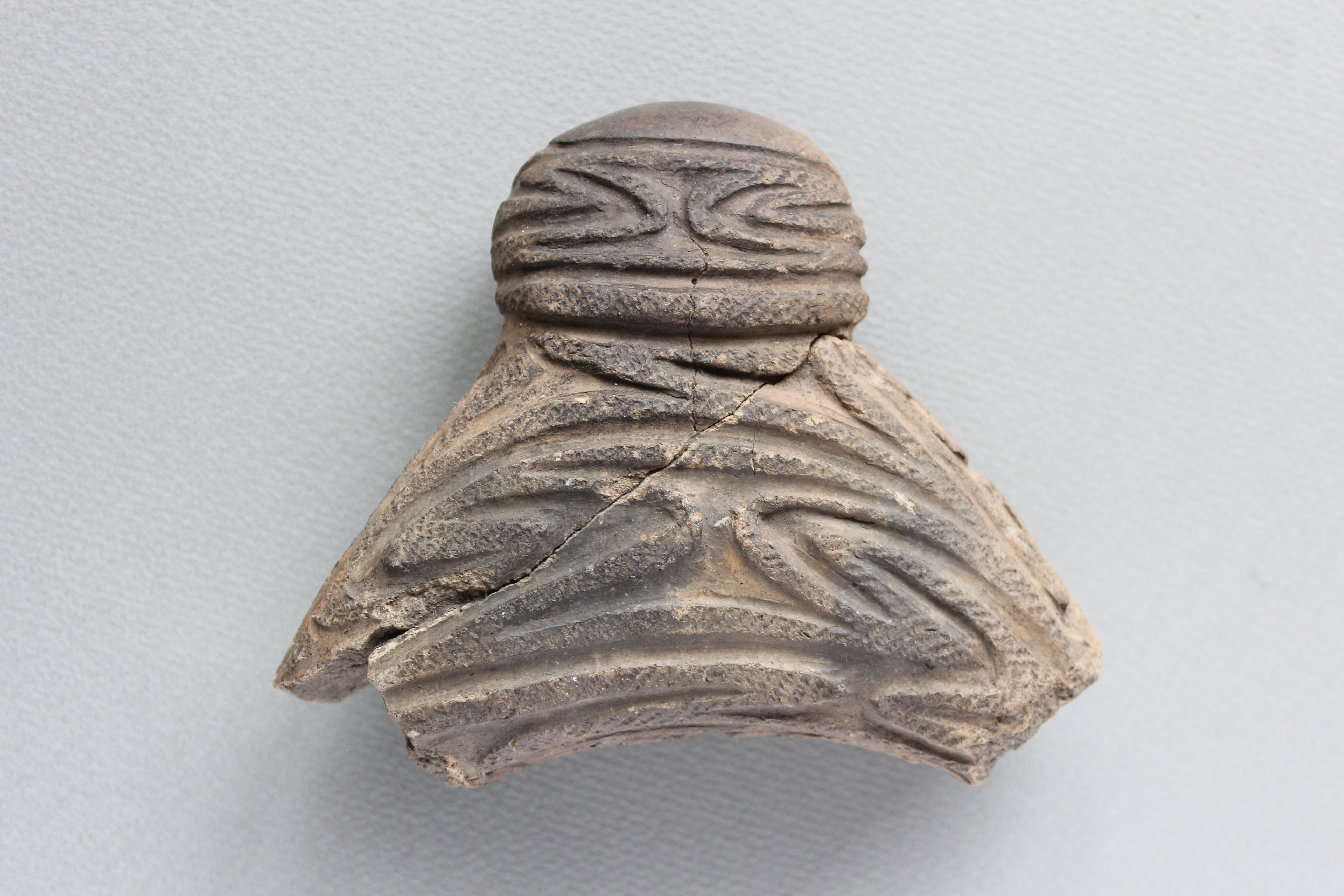 中実の土製品。上の頂部が把手状で、下に三角形状に広がり、底面は広く中央がやや抉れる。この資料は下端の両端が破損。剥落はあるが頂部を含む全面に入組み文様が施される。文様は道南ローカルで日の浜あるいは聖山にみられる。