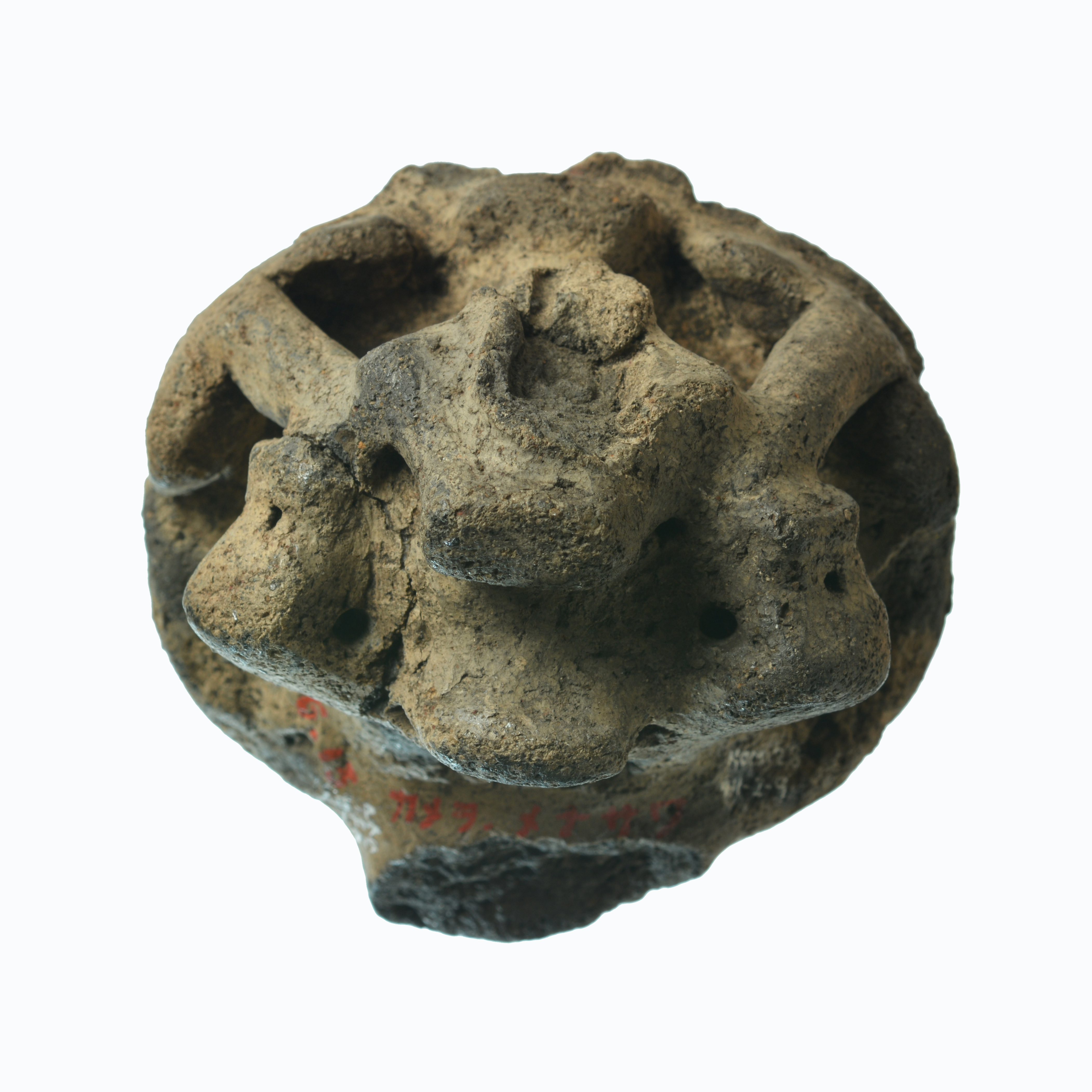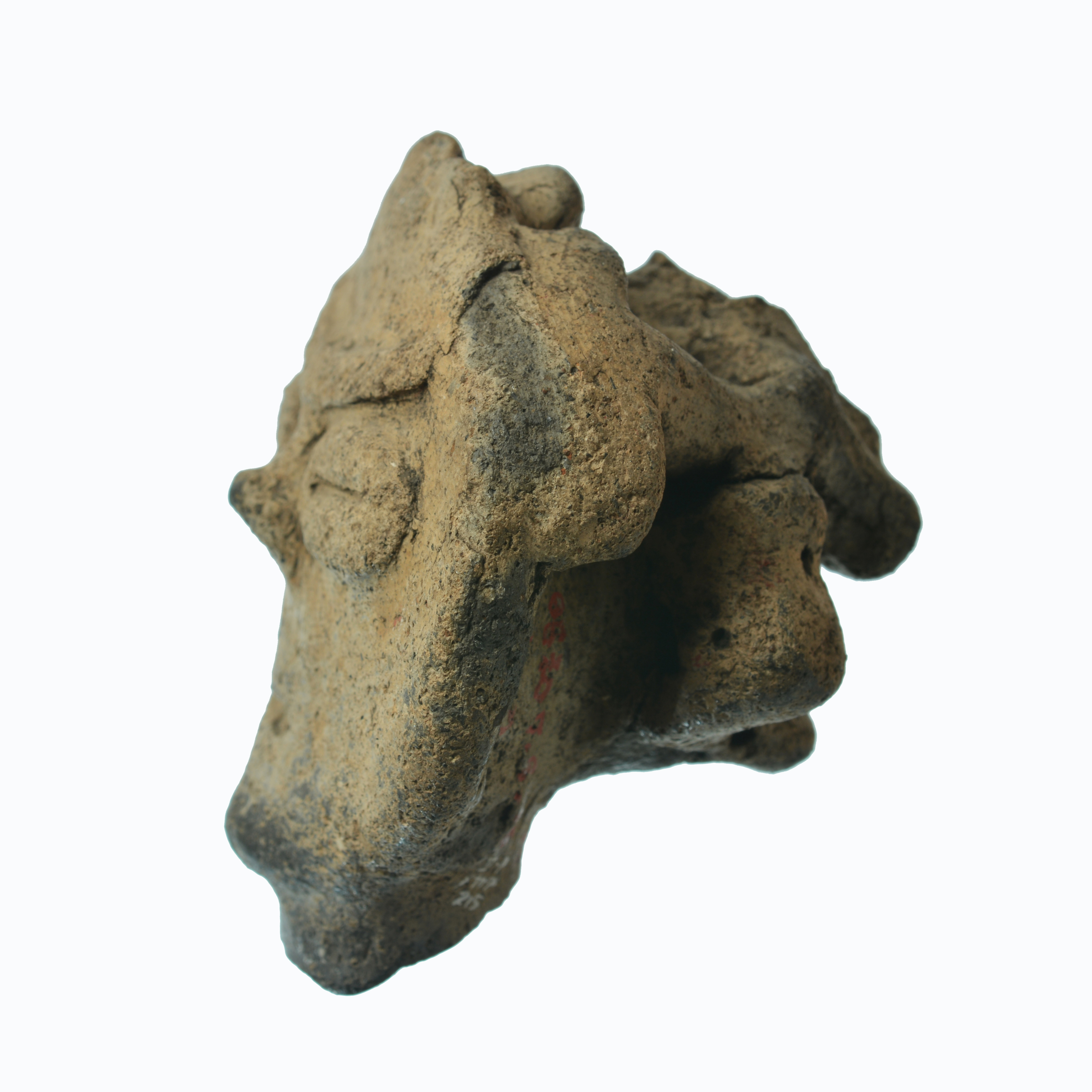 大型中実土偶の頭部。顔面と宝冠状の後頭部に分かれる。顔面は横に広がった楕円形の板状で顎が少し前に出、頭頂部には粘土ヒモの貼り付け。一本眉に鼻が付けられ鼻腔が2か所刻まれている。目は楕円形のコーヒー豆状で貼り付け後細かな縄文が施文され線状の刻みが横に入る。口は篦により刻まれている。後頭部は粘土ヒモによる宝冠状で髷を結っているようにも見える。胎土は火山灰粒含む黒色。