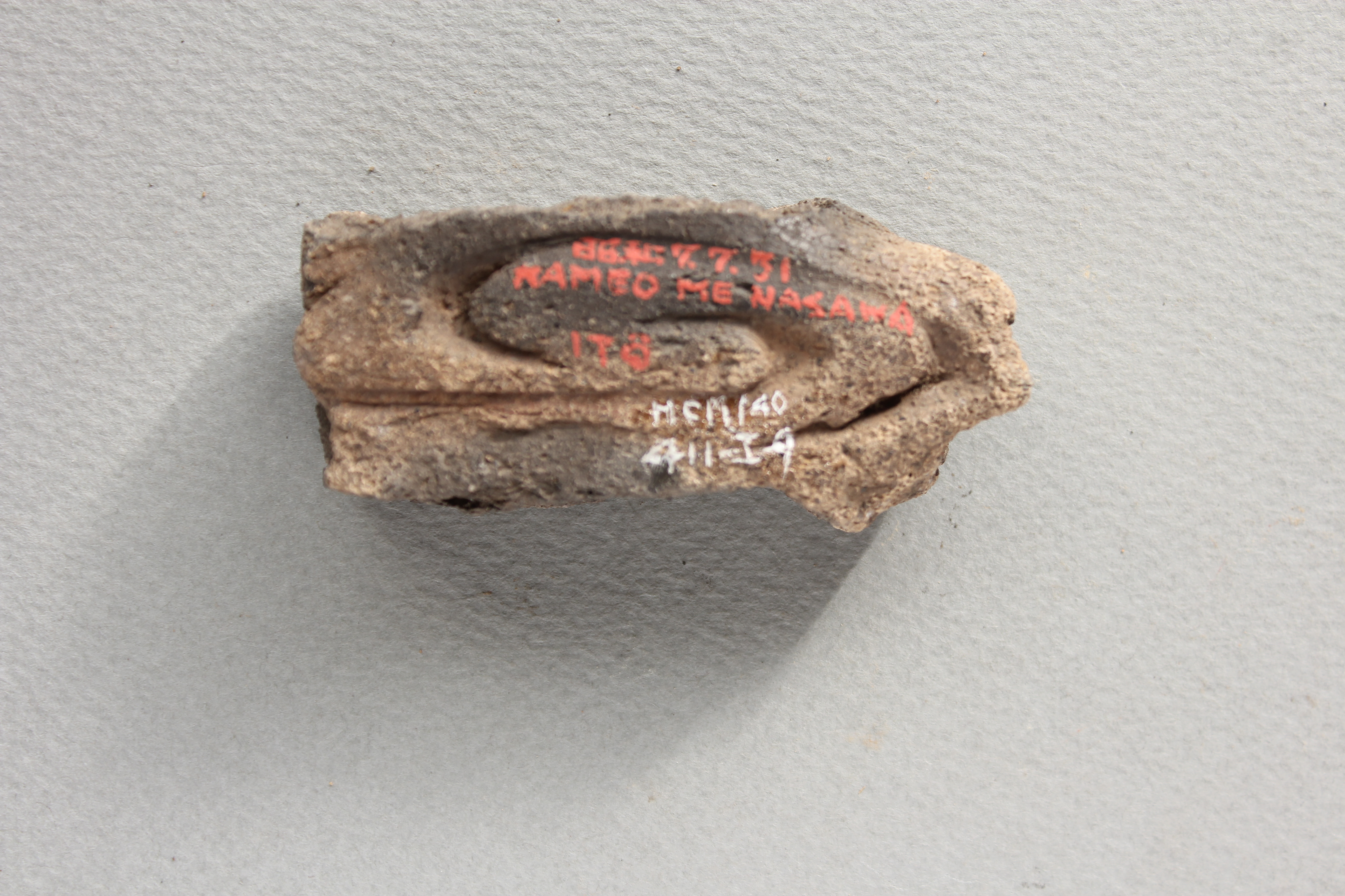 目録では土製品。X字状土偶の脚部とみられる。入組み文、下部に二本一組の沈線紋。
