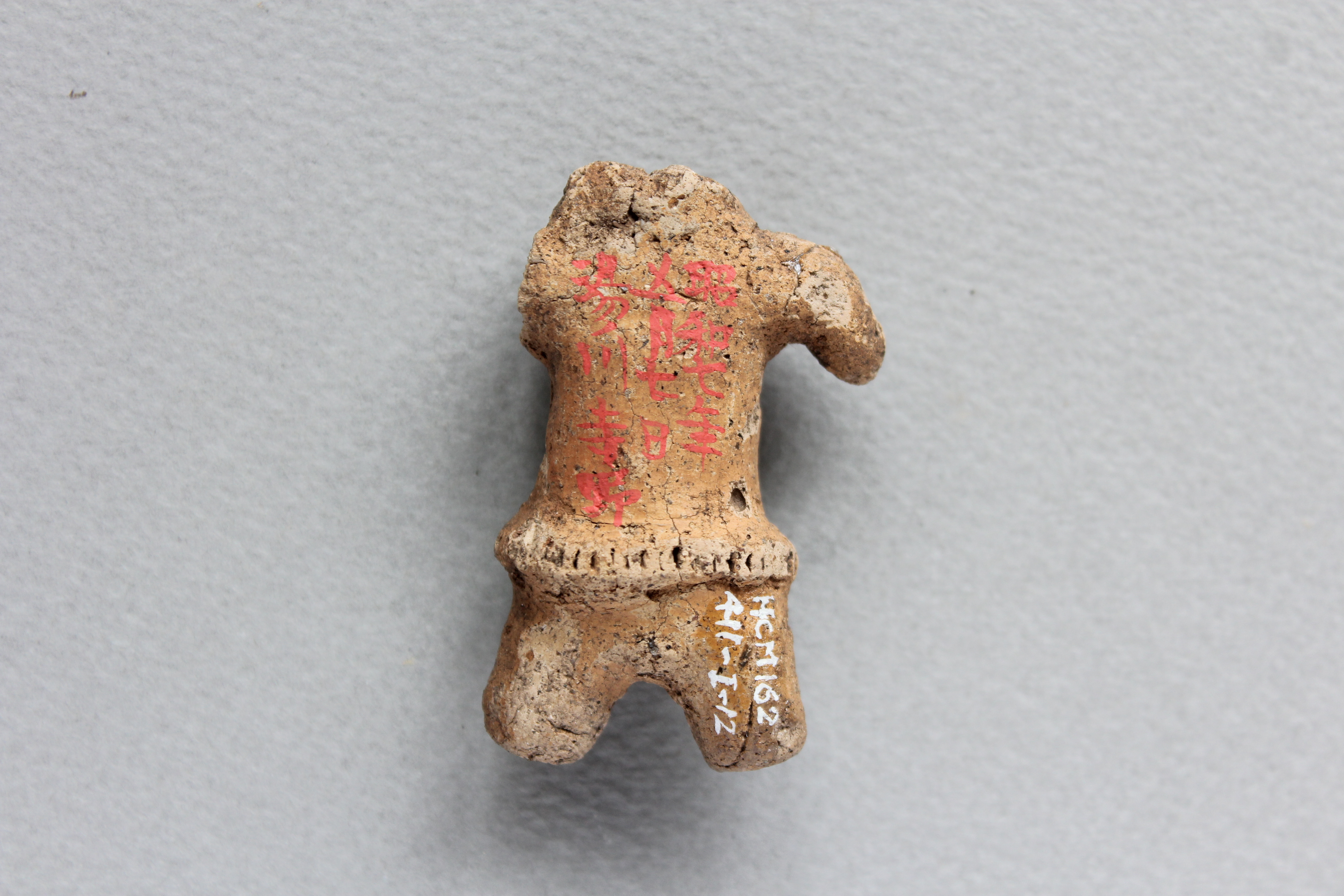ごく小形の土偶。中実。乳房の表現あり。腰下はズボンか。頭部・左腕欠。寺野は湯川2丁目鮫川を見下ろす坂の上公園周辺。「昭和7年5月7日湯川寺野」の朱書き