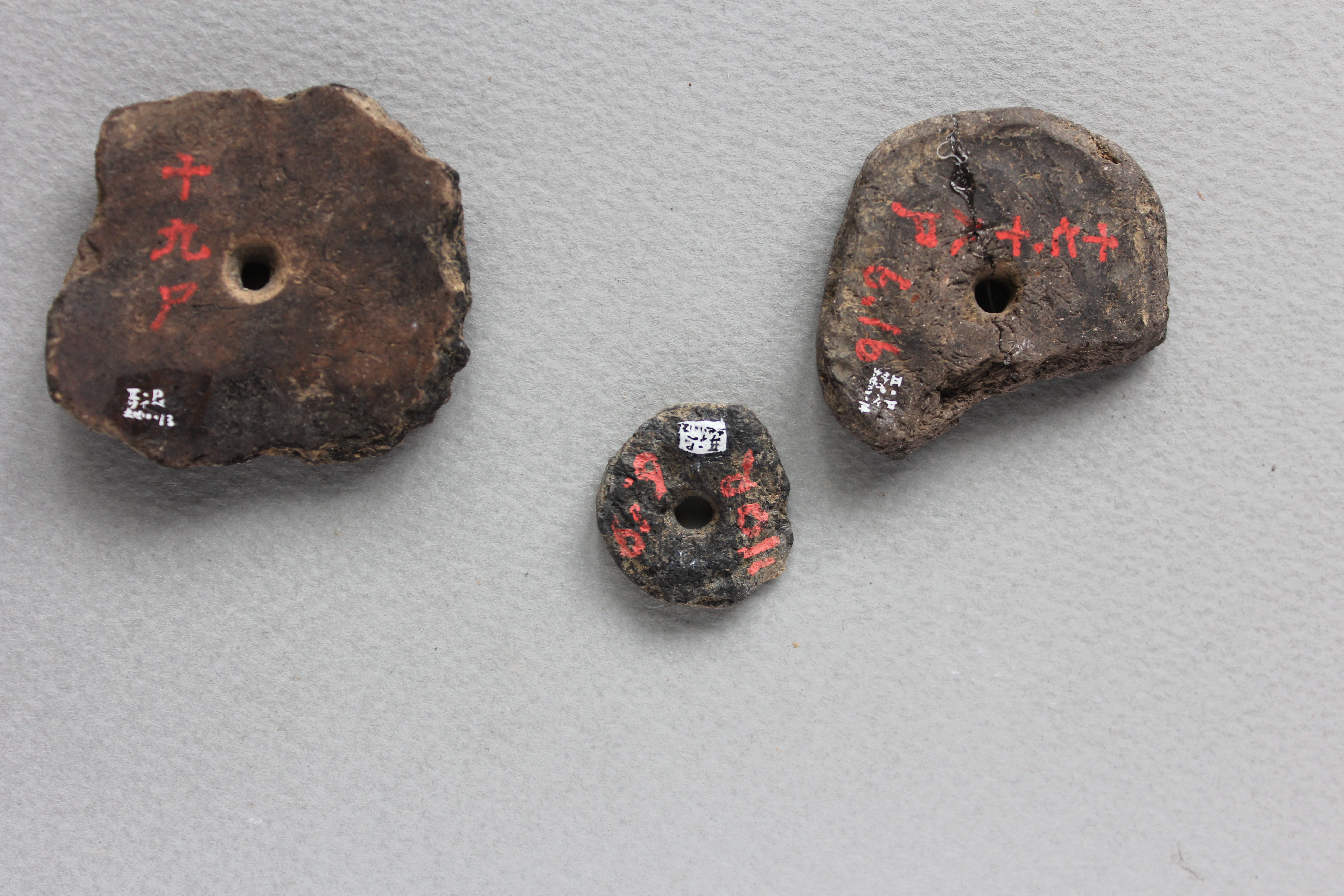 使用した土器を削って作っている。中央に孔のあるものとない物がある。