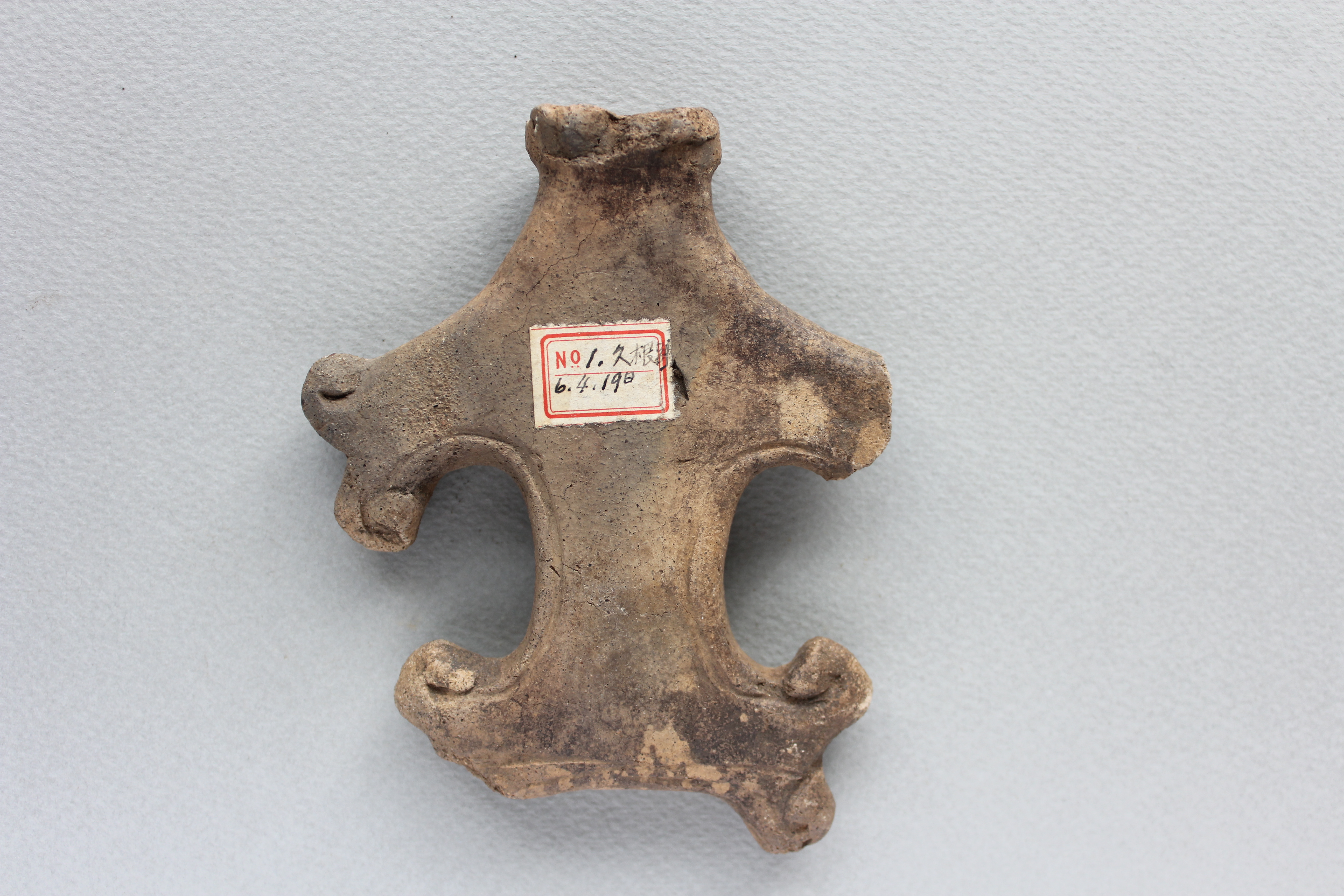 X字状の土偶。大型。四肢と頭部を突出させ人体をシンボリックに表現。胸2箇所に乳の剥落痕。右腕と左足部の端の一部を欠く。板状。胸から下まで中心に刺突列で正中線。退部の輪郭線に沿って沈線が引かれる。胎土は緻密。大洞C2式期。