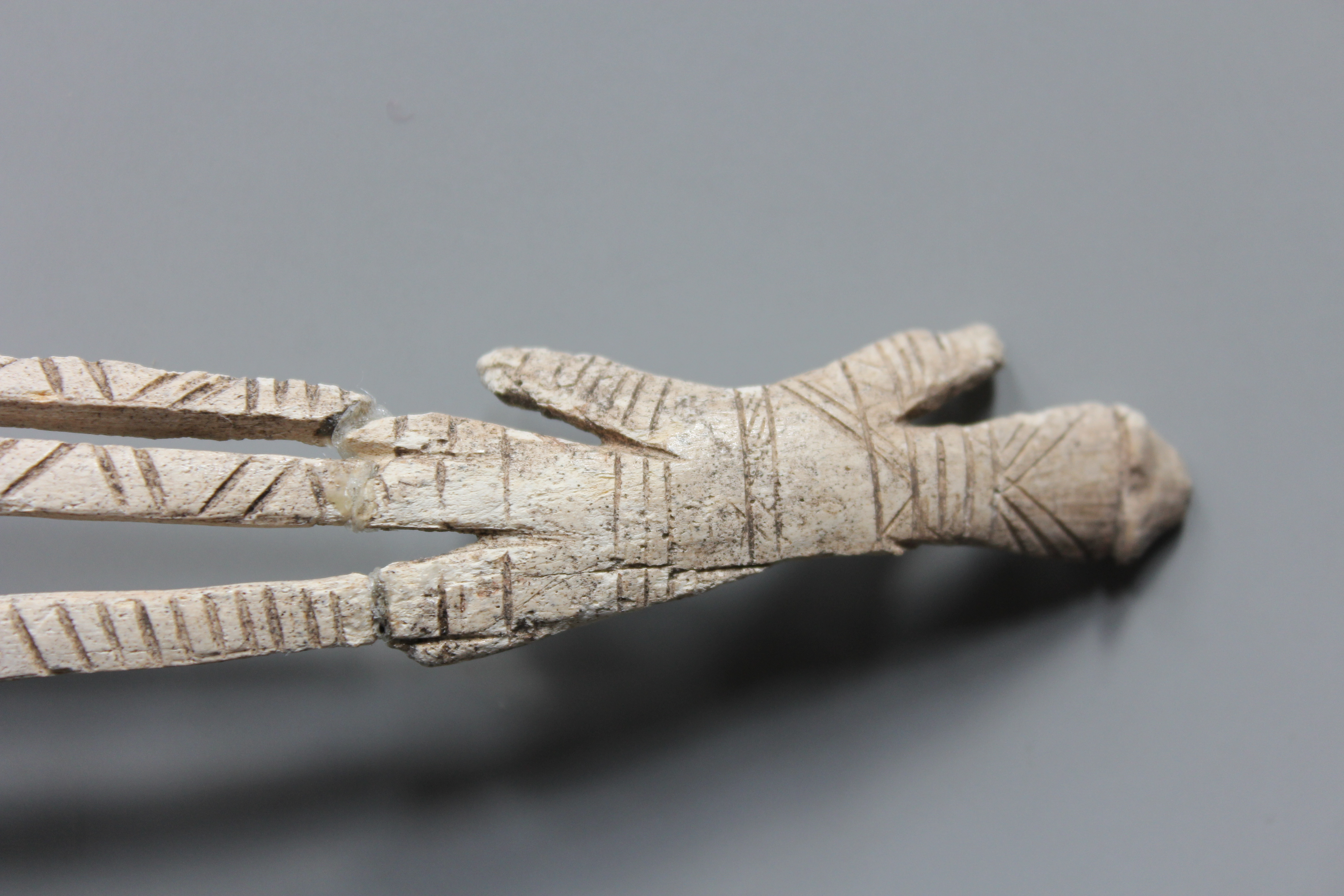 動物意匠がつけられた鹿角製のさじ。全体が内側に大きく湾曲している。柄尻にはクマの全身を板状に切り出して頭部をレリーフ状に彫りだしている。柄の表面には,2本一組で鋸歯状の刻線で装飾が施されている。柄は三角あるいはレンズ状の透かしとなっている。さじ先には細かな欠けがある。全体に摩滅し風化している。副葬品とみられる。