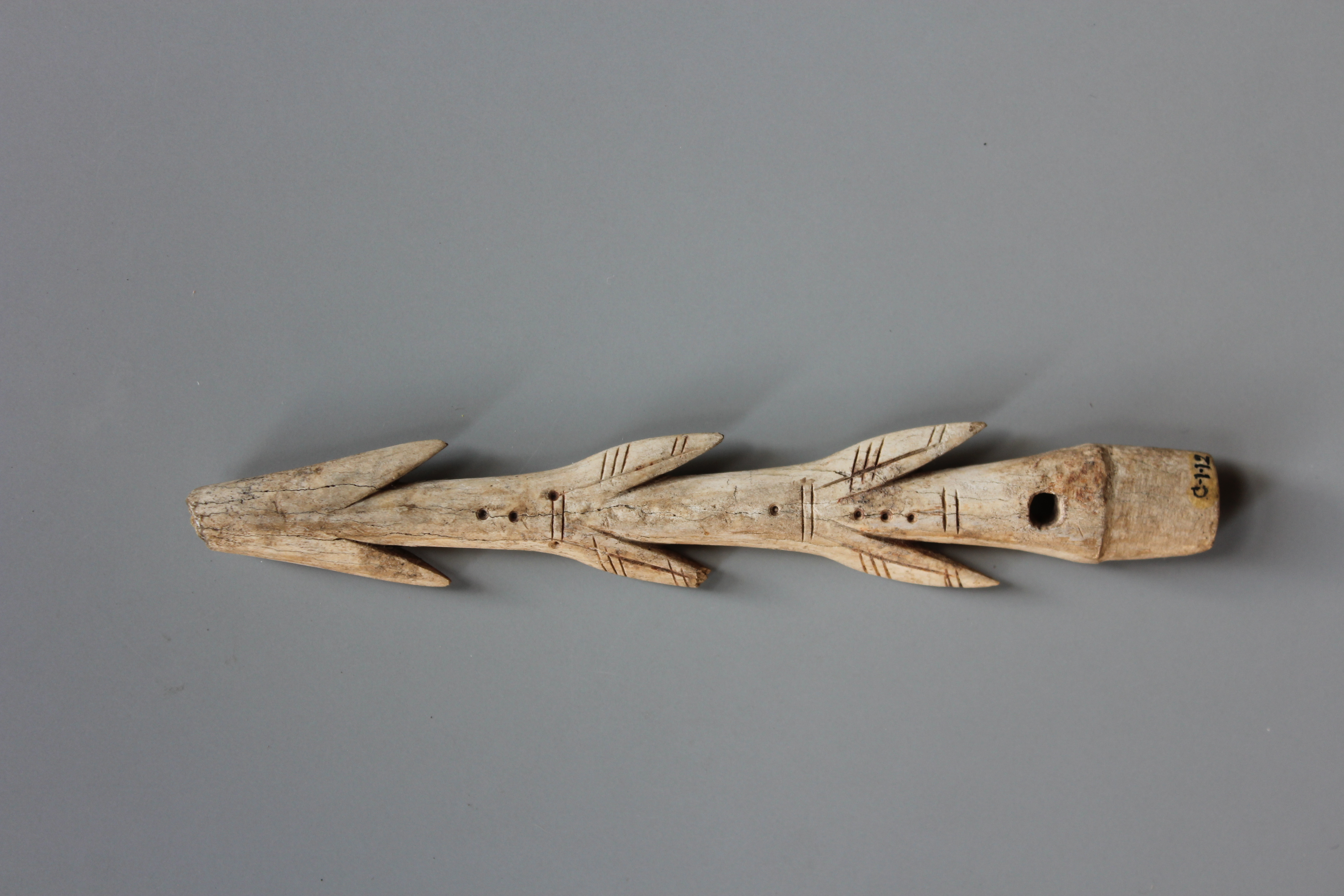 鹿角製の挿入式銛頭。メクラ孔と長軸の直交方向に施された浅い刻線で装飾されている。基部の近くに内面より索孔が穿孔されている。アグは軸の左右対称に3段の両アグ。装飾はアグの2段目より下に施され,銛の先端部は故意に切断されている。副葬品とするために切り落としたのかもしれない。副葬品とみられる。
