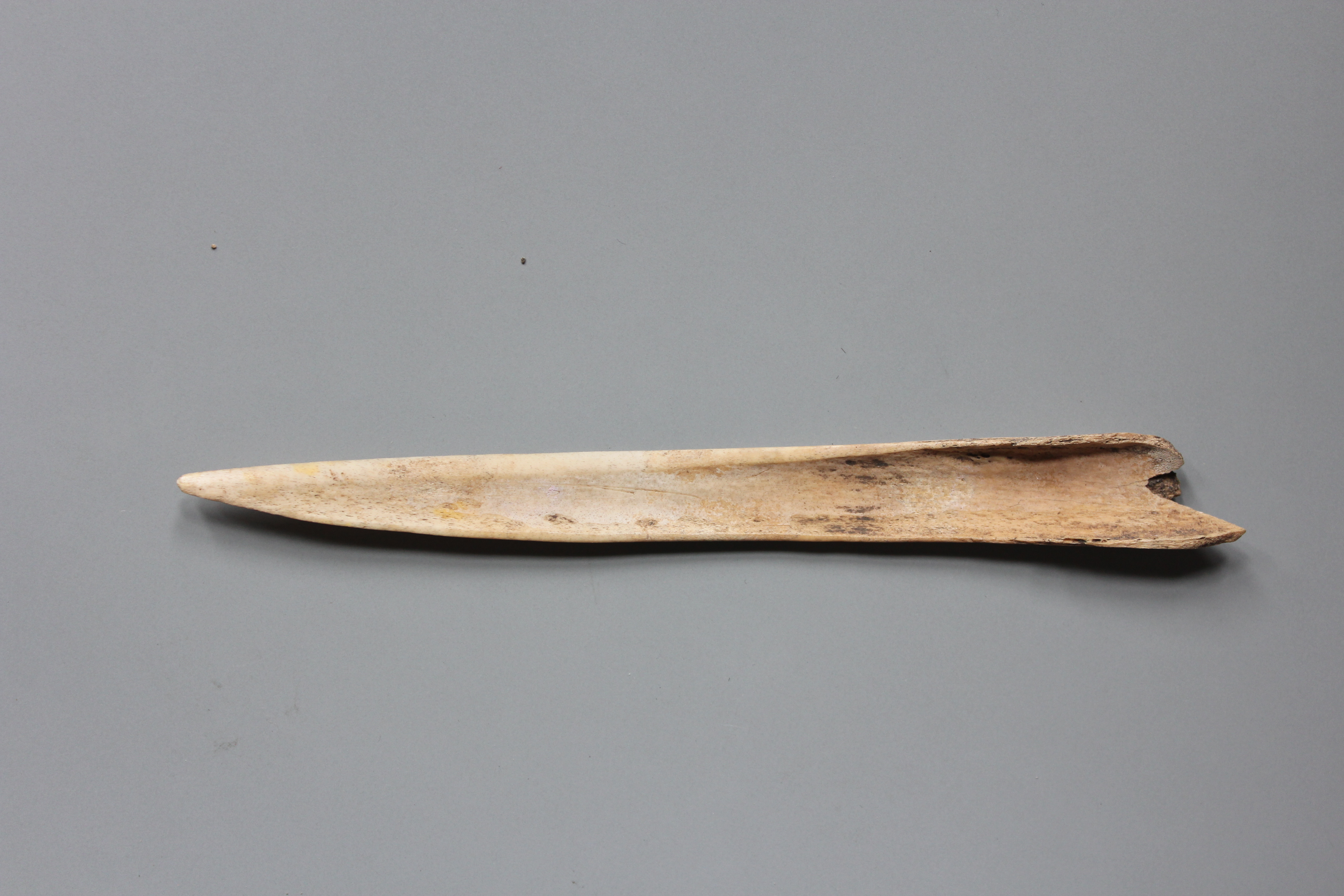 鳥上腕骨を反割りして周縁と先端に加工を施した篦。使用痕から刺突具としても使用しているが,測縁が長く,ヘラ類として解釈した。鳥類の上腕骨を反割りして利用している。使用痕跡によるものか表面に光沢がある。