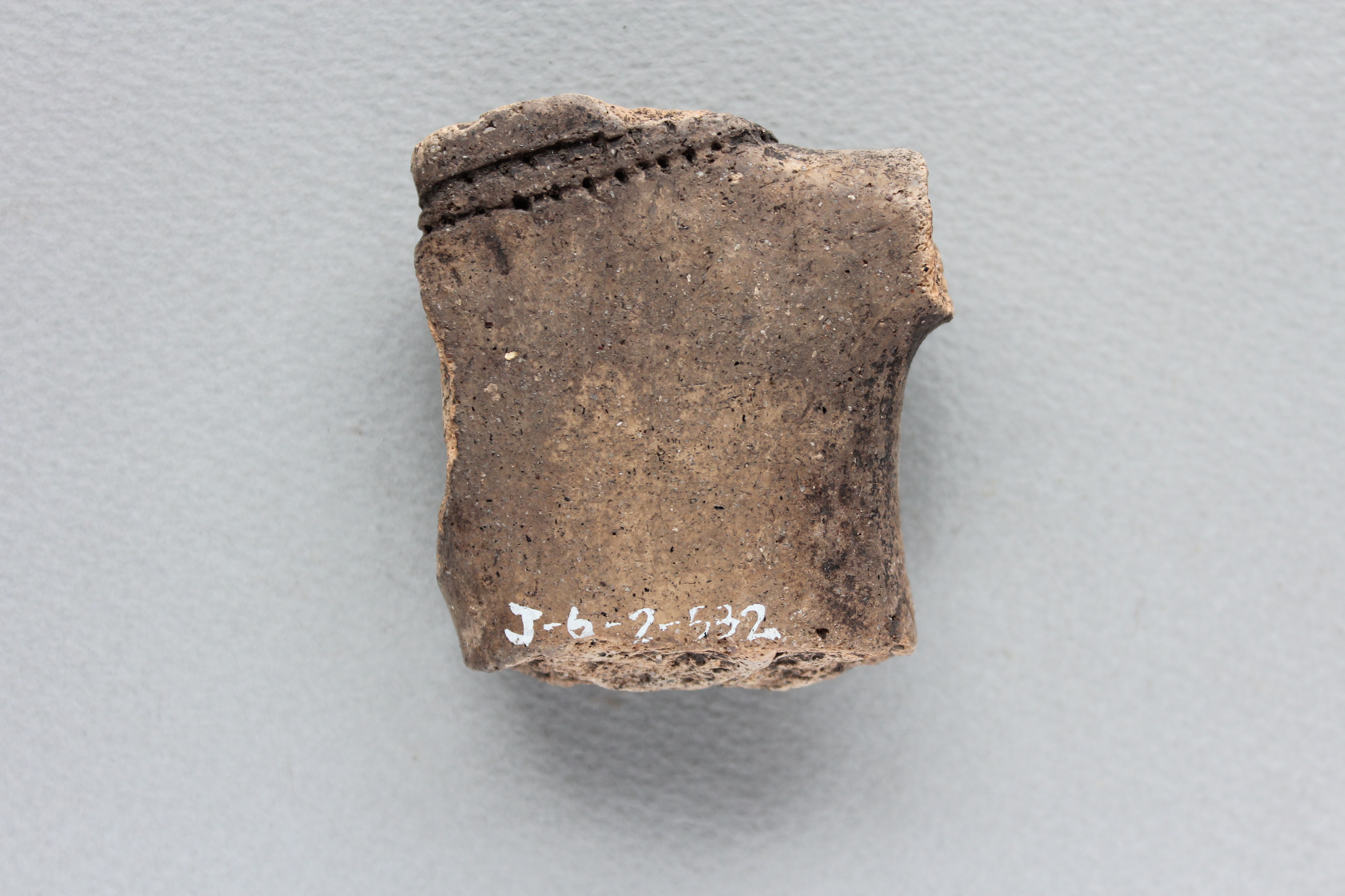 中実土偶の胴部。左腕と乳房が残る。鎖骨周りと身体の中心に沈線と連続した刺突があり,革を縫い合わせた縫い跡をと見られる。革の貫頭衣か。腹面に入り組み文。破損した断面すべてにアスファルト粉末付き。あらかじめ壊しておいたか。
