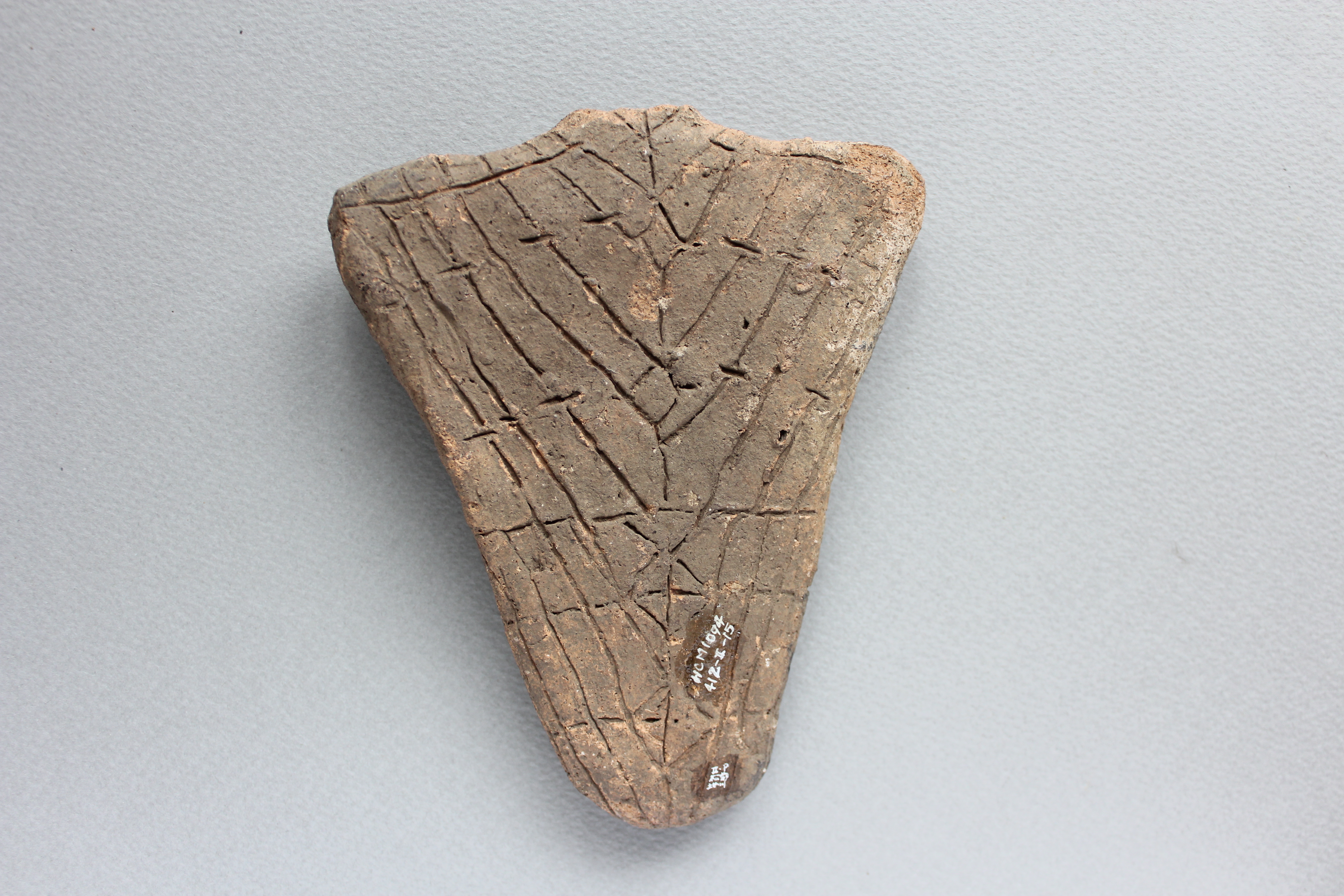 板状。頭部欠失。逆三角形の体部。胸の乳と陰部に貼り付け。下腹部はふくらむ。背面と腹面に沈線文(網状の刻線)。胴部左右より貫通孔。