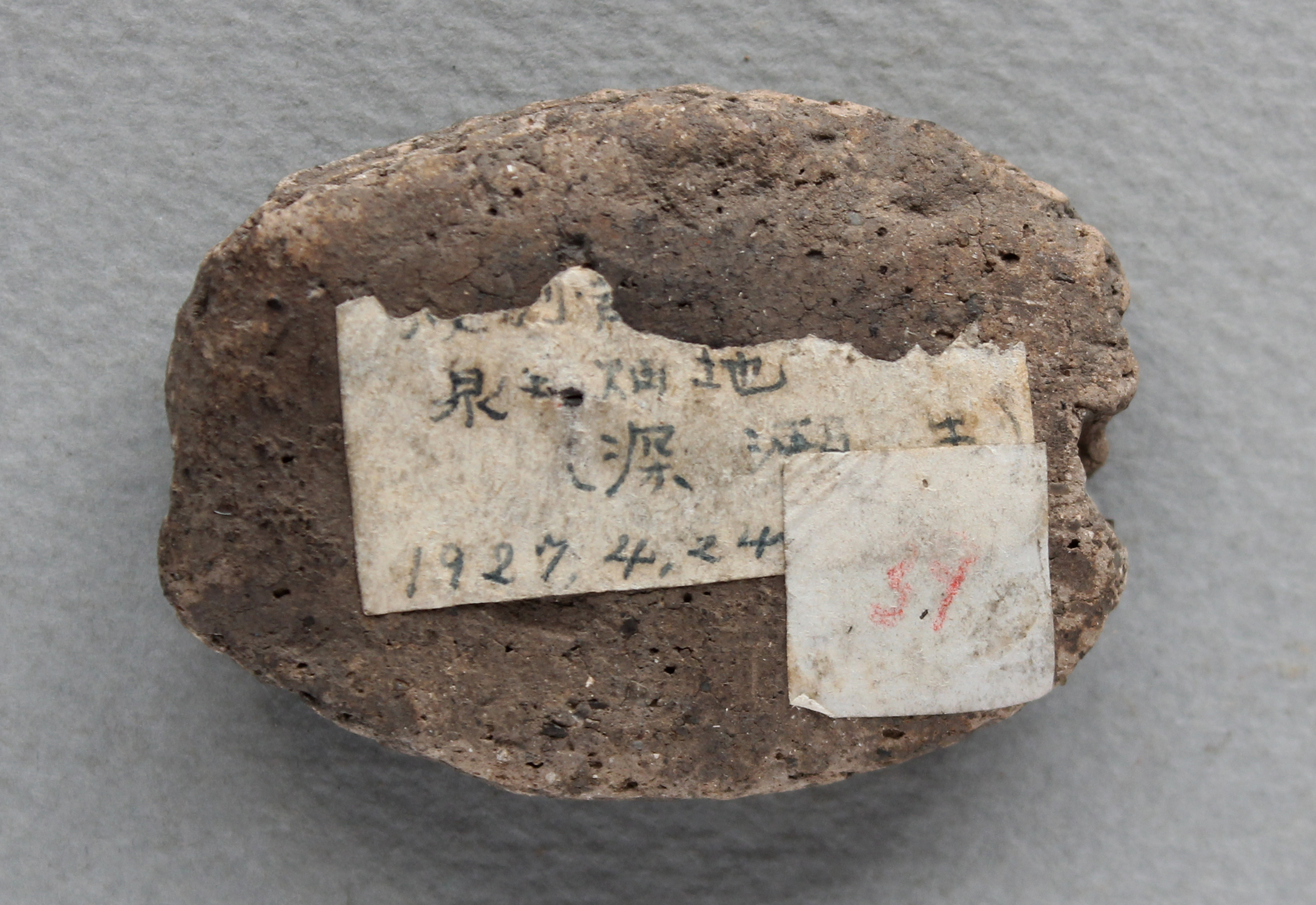 平面楕円形で長軸に貫通孔のある垂飾品。裏面付箋に「1927.4.24○○○泉畑地(深瀬○)」とある。