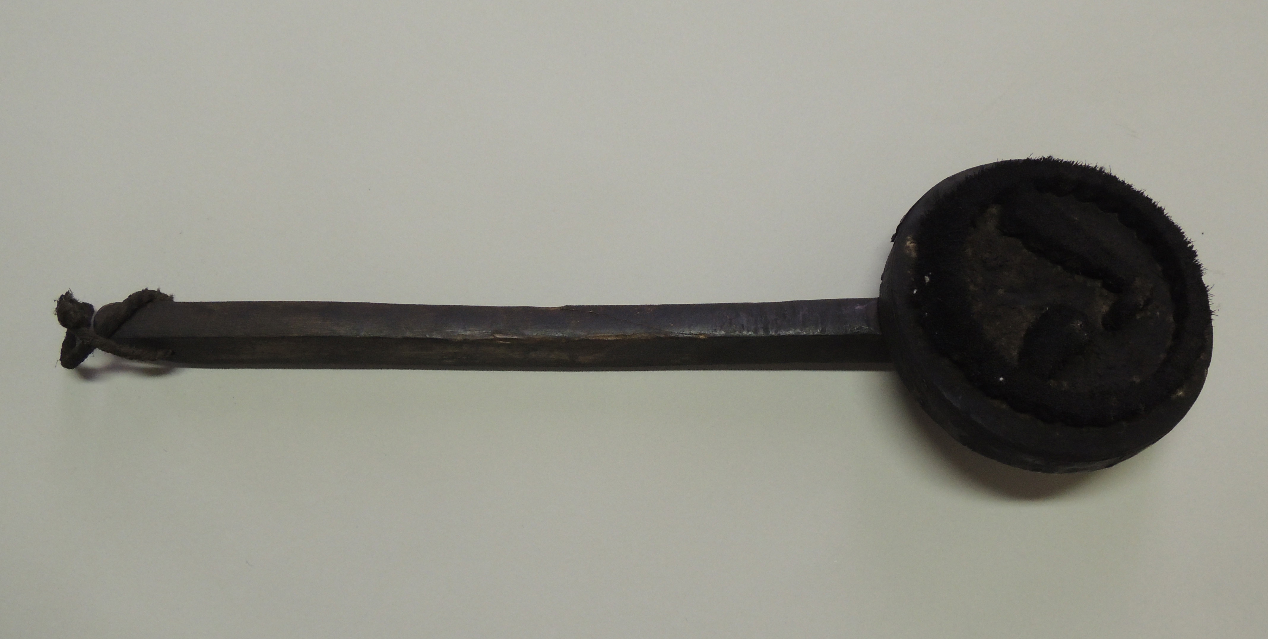 「ポンポン」は、商品を入れた俵や木箱などに屋号(家印)をスタンプする道具です。