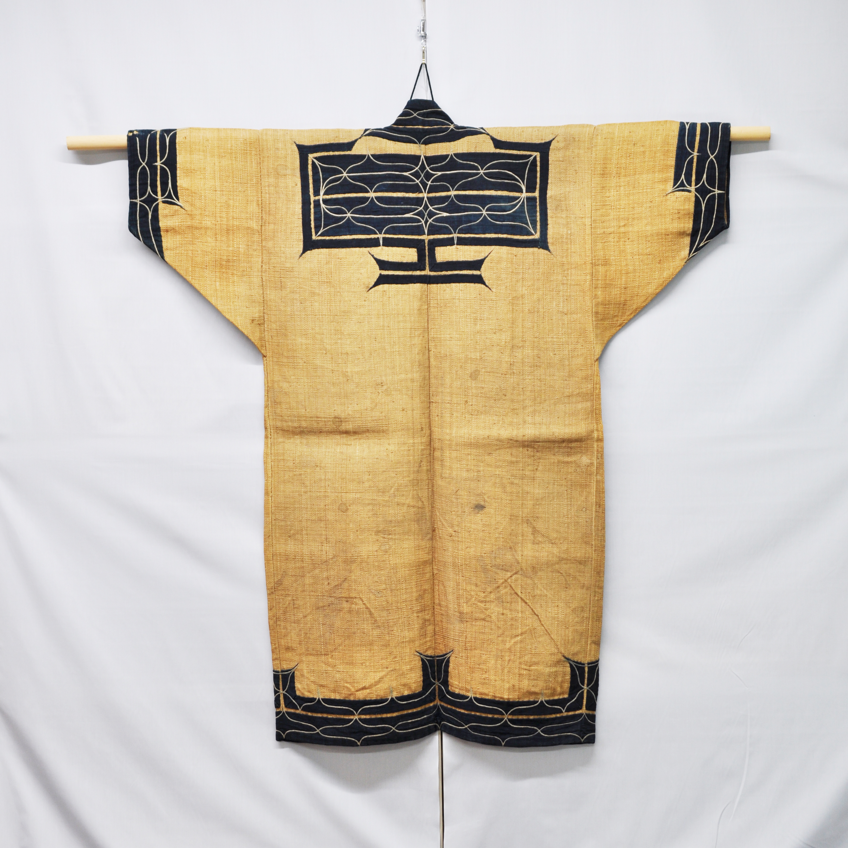 収集地:北海道 厚岸,もじり袖 襟・裾・袖口に紺木綿切伏・文様刺繍