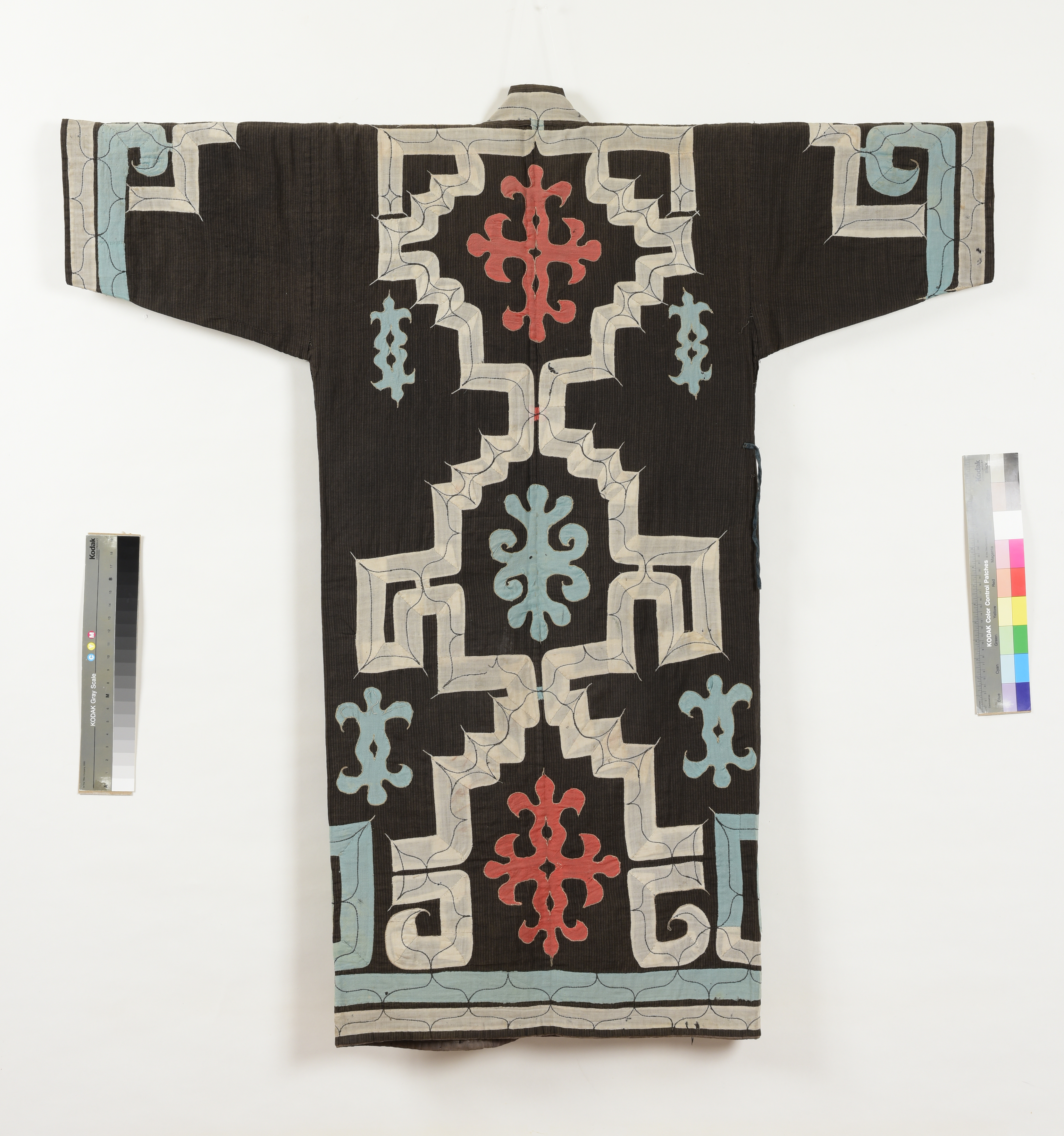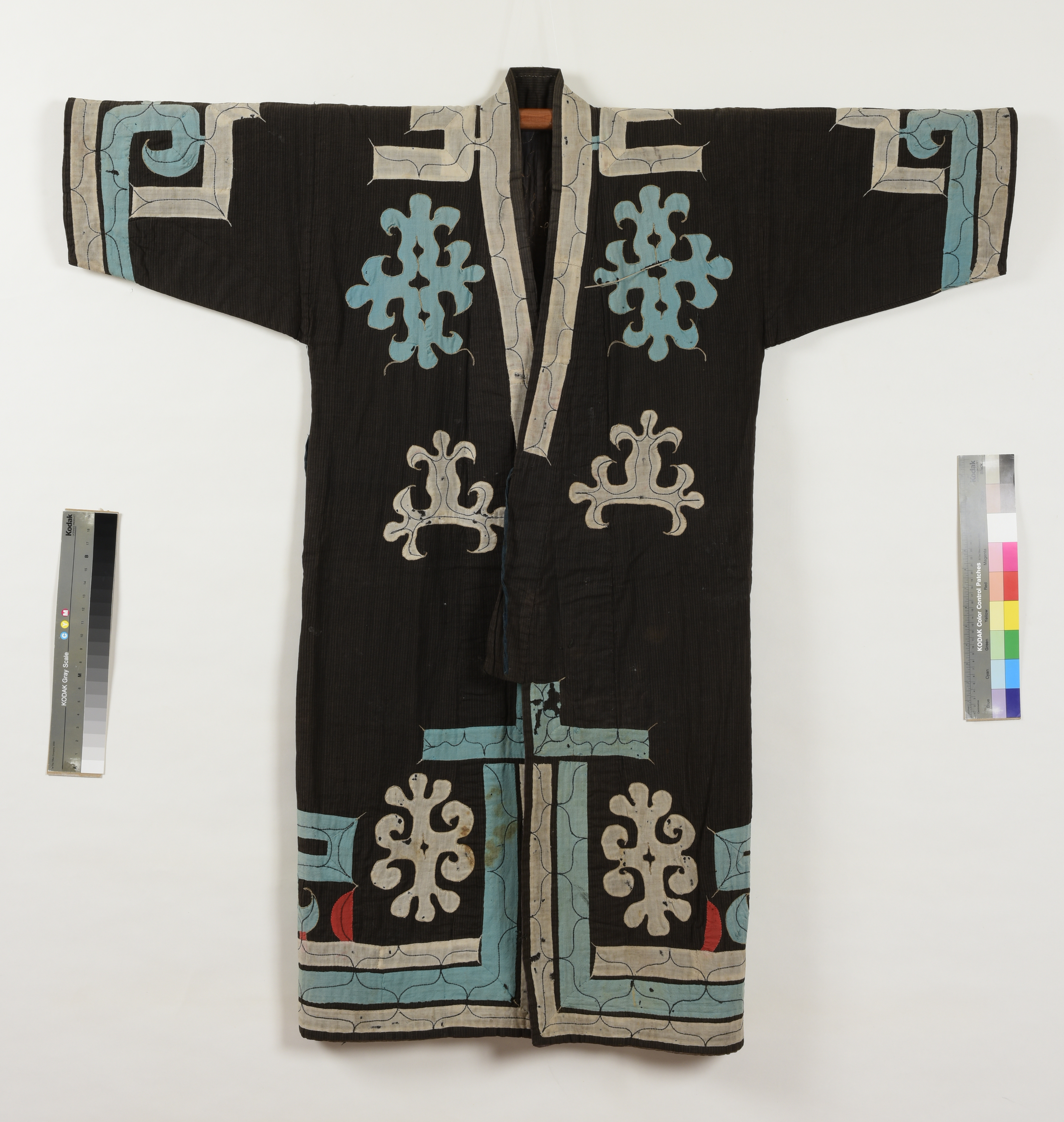 収集地:北海道 渡島 八雲ユーラップ, もじり袖 縞木綿地に赤布・青布・白布・水色メリンスによる切伏文様有り。椎久年蔵氏着用。
