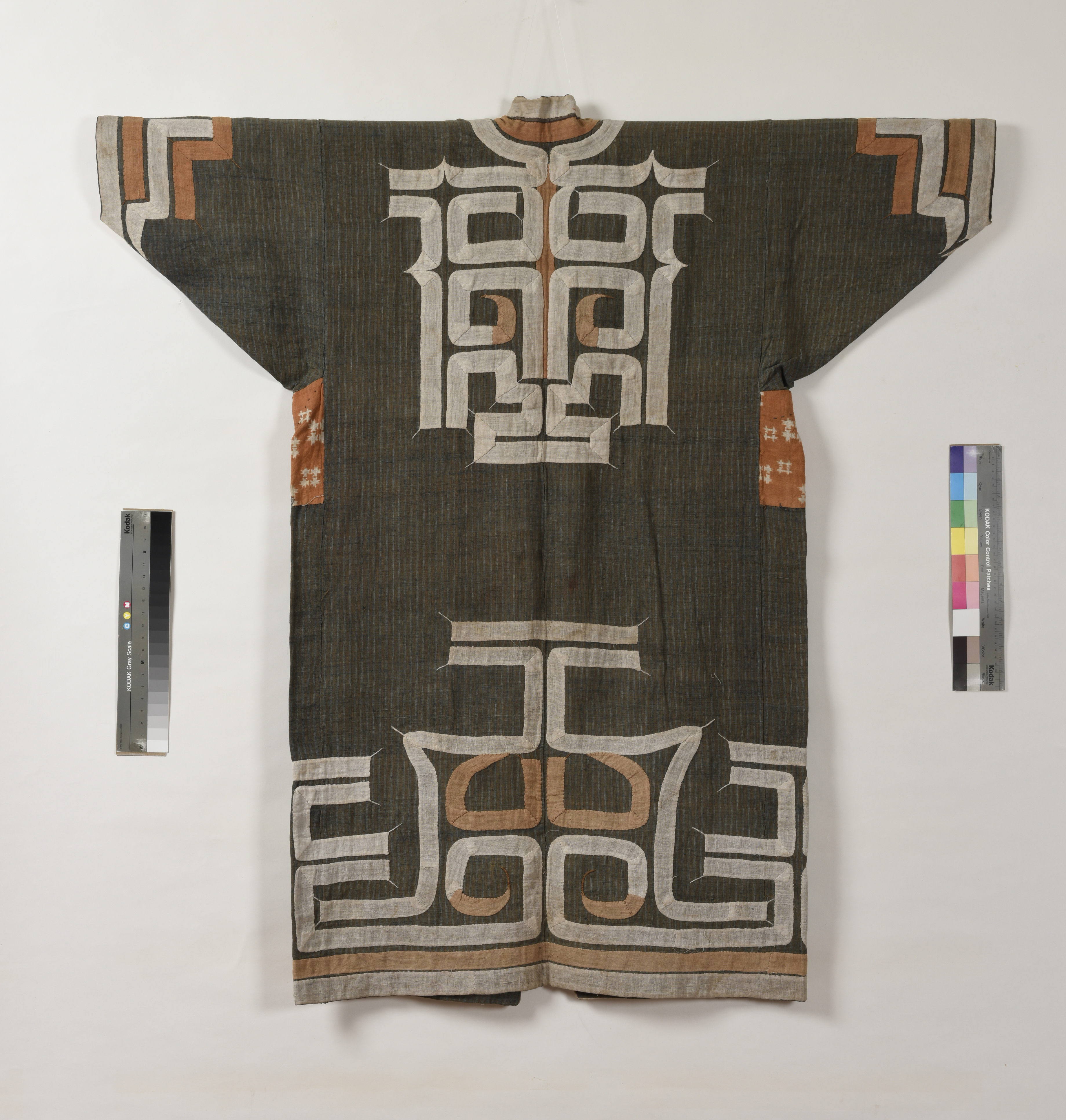 収集地:北海道 渡島 八雲ユーラップ,もじり袖 縞地茶縞木綿地に赤布・白布・赤地格子模様手ぬぐいによる切伏文様