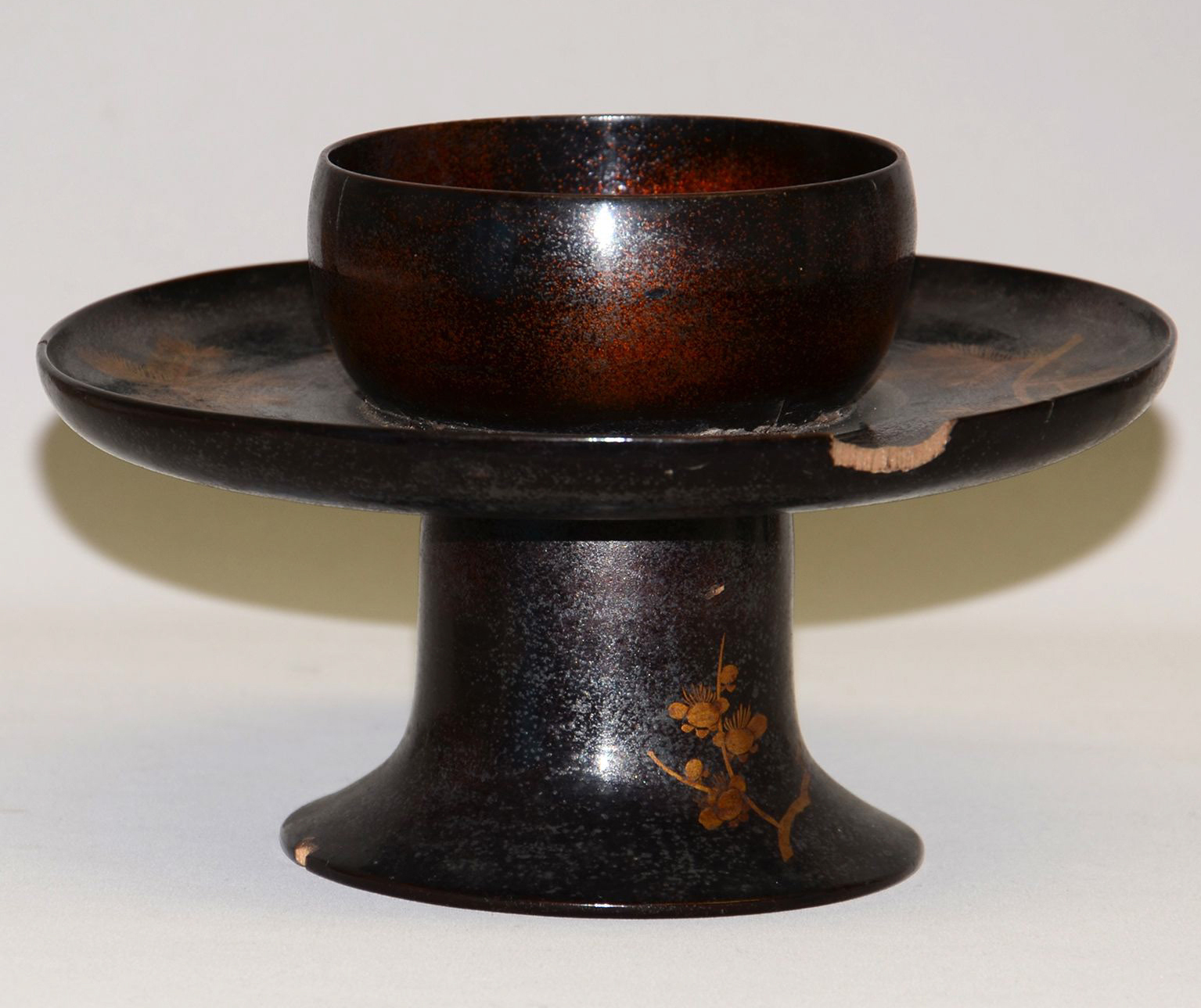 収集地:北海道 渡島 八雲ユーラップ,木製,椀:漆〔赤〕 七宝に花角(2ケ)に唐草〔金銀蒔絵〕 刻印2(高台内) 天目台:漆〔梨子〕 松梅〔金蒔絵〕 刻印2