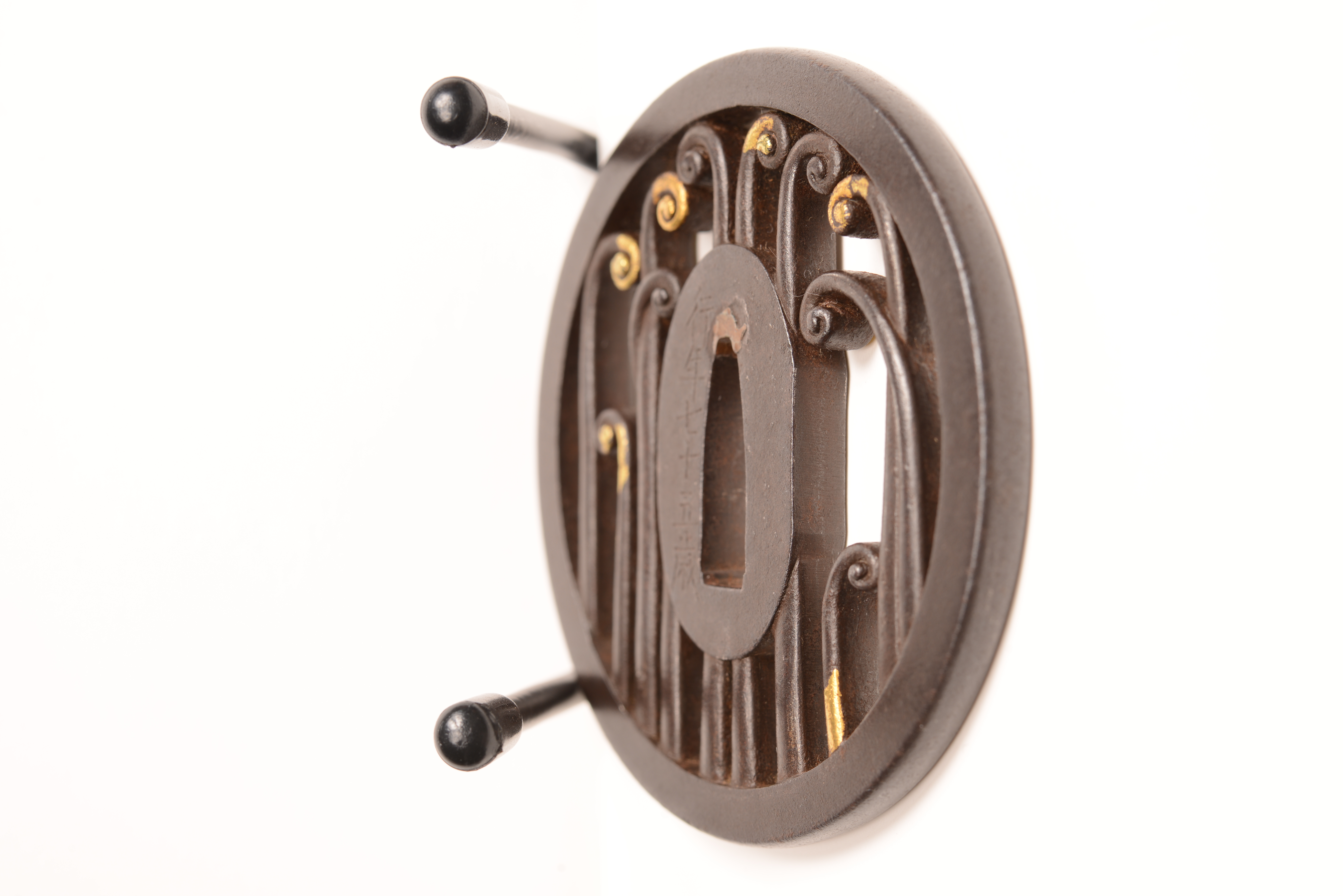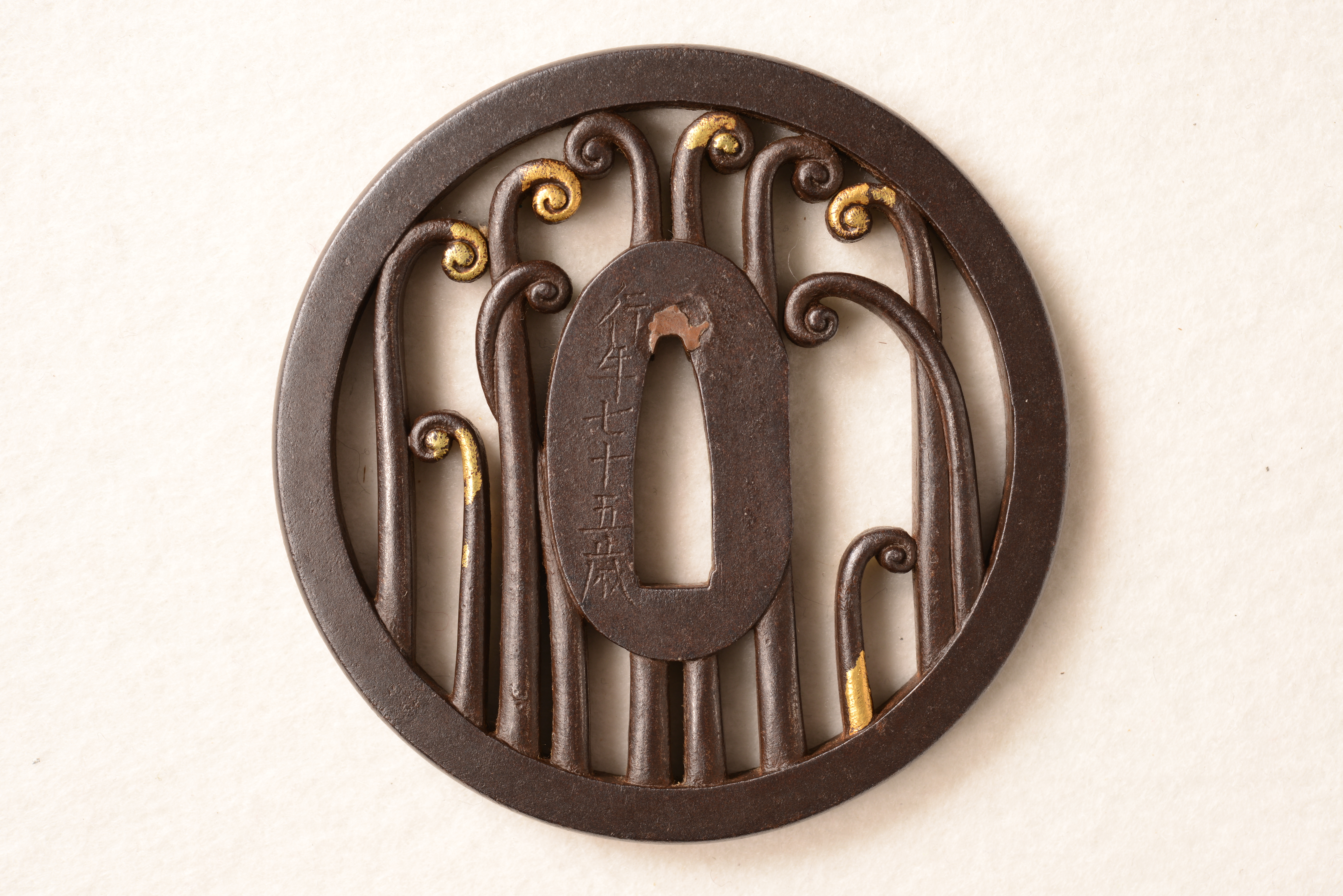 鉄地 丸形 透彫 金象嵌 銘:(表)秋田住正阿弥重常 (裏)行年七十五歳