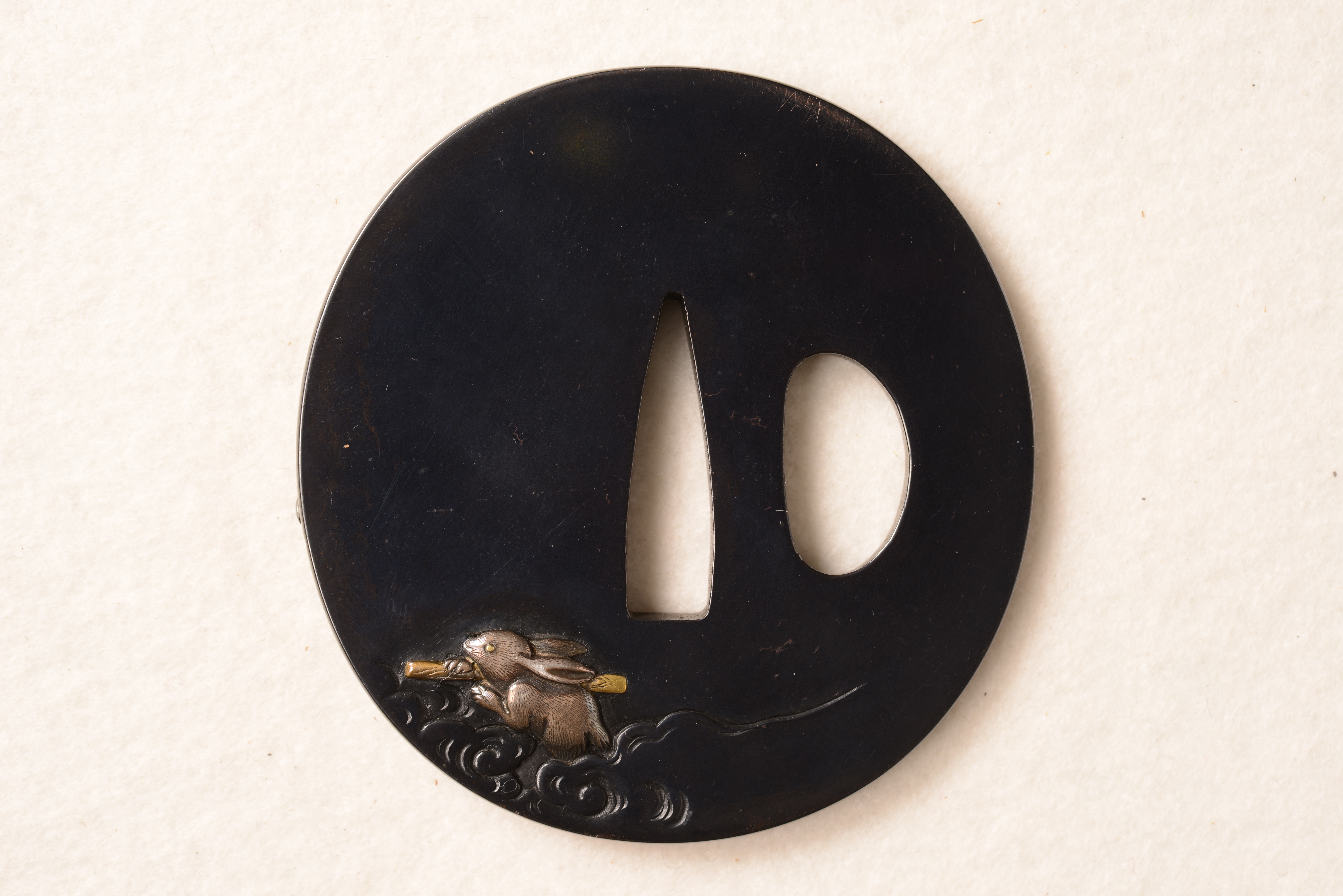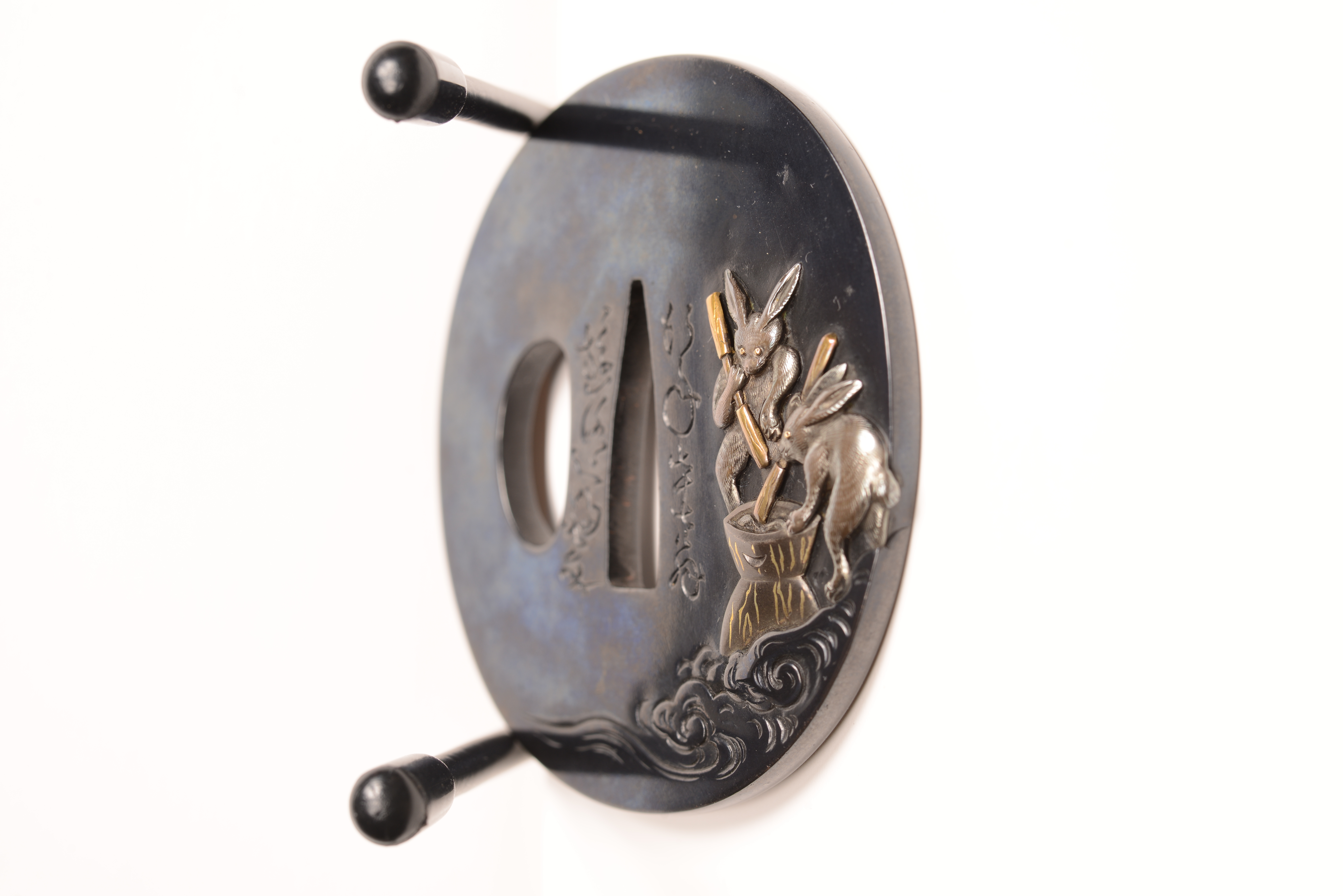 烏金地 長丸形 高彫色絵 銘:行年七十七才 遊洛斎赤文