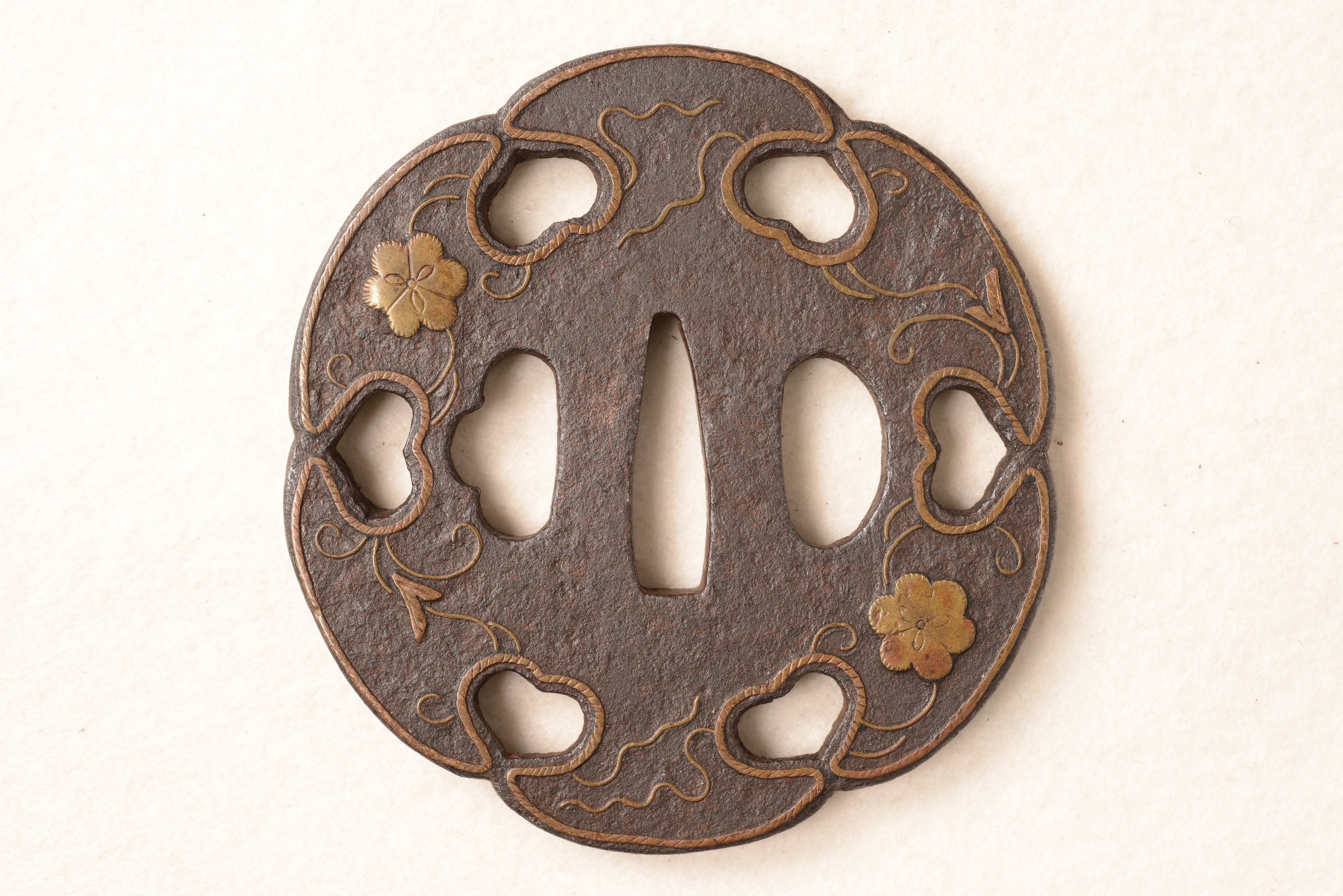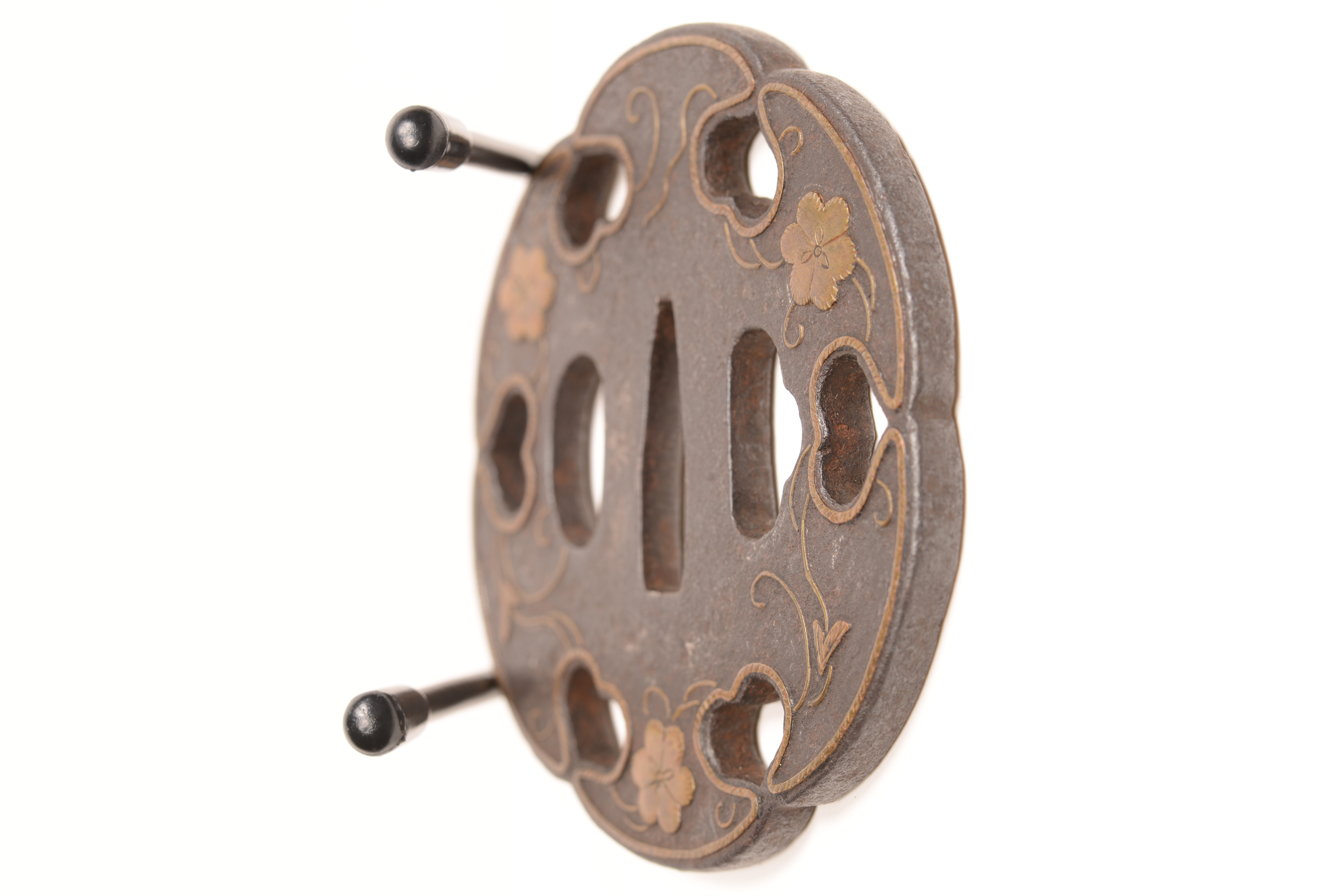 鉄地 六ツ木瓜形 小透 真鍮象嵌