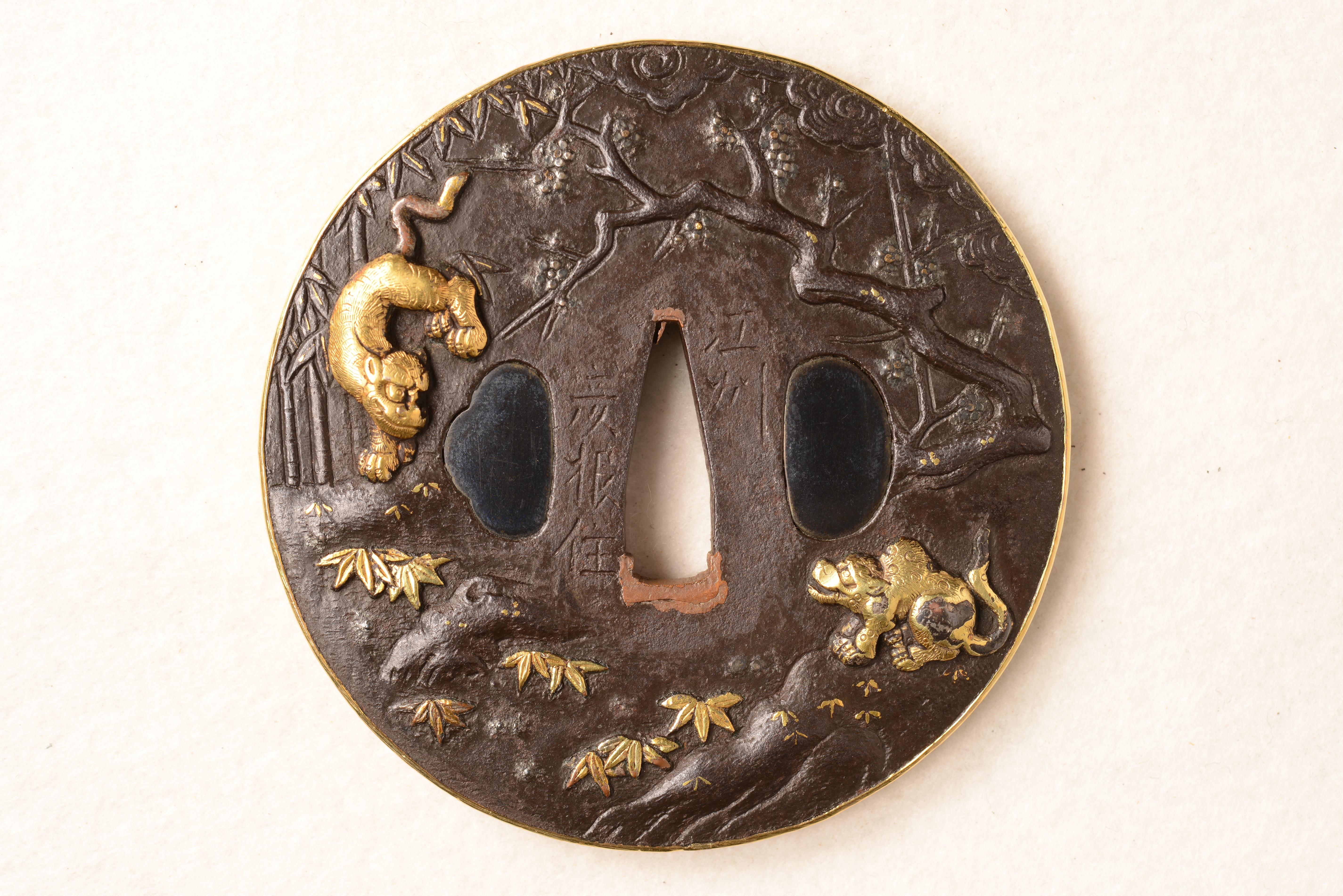 鉄地 丸形 高彫 金象嵌 銘:(表)藻柄子入道宗典製 (裏)江州彦根住
