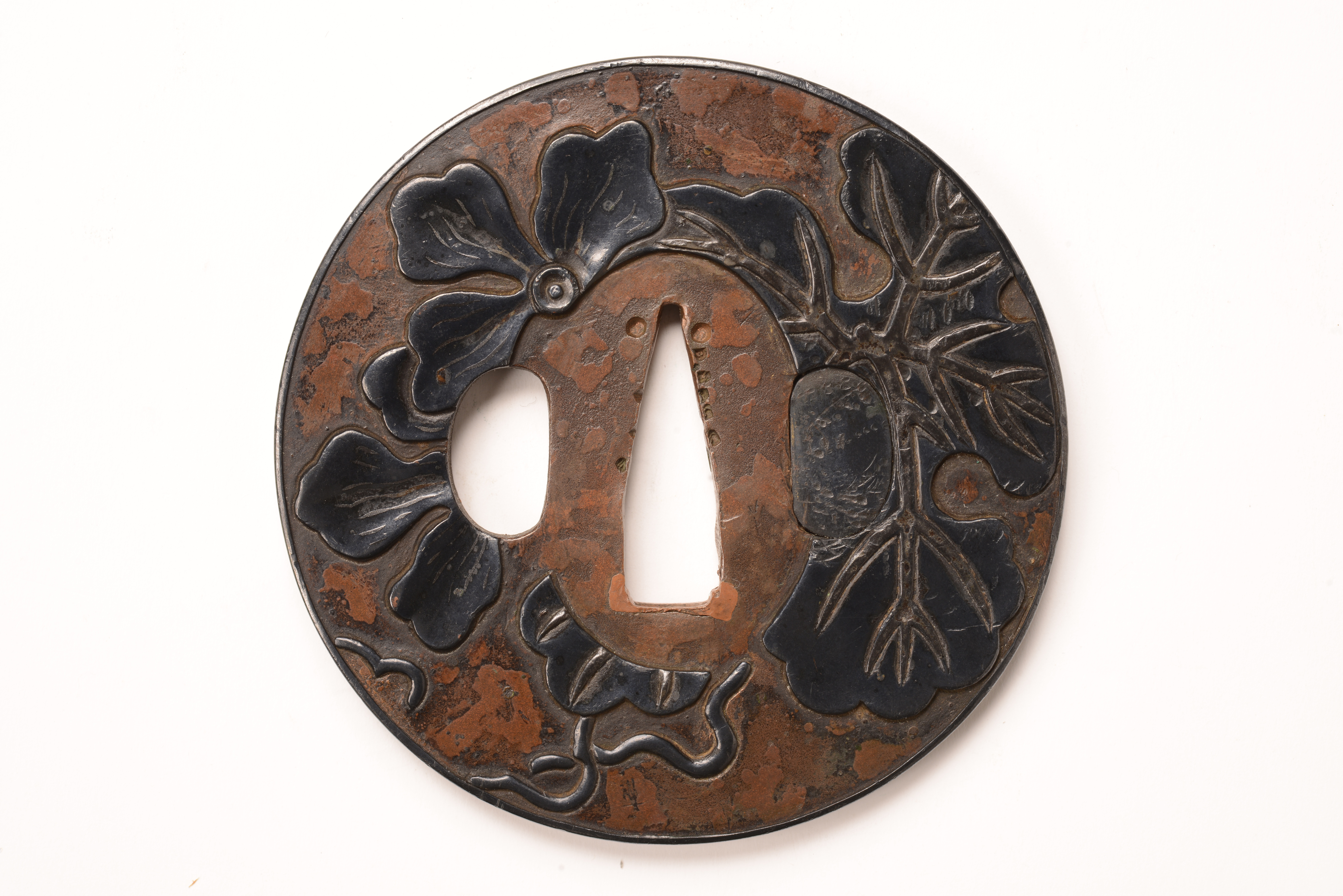 丸形 素銅地 高彫据文 烏金覆輪 函館市指定有形文化財