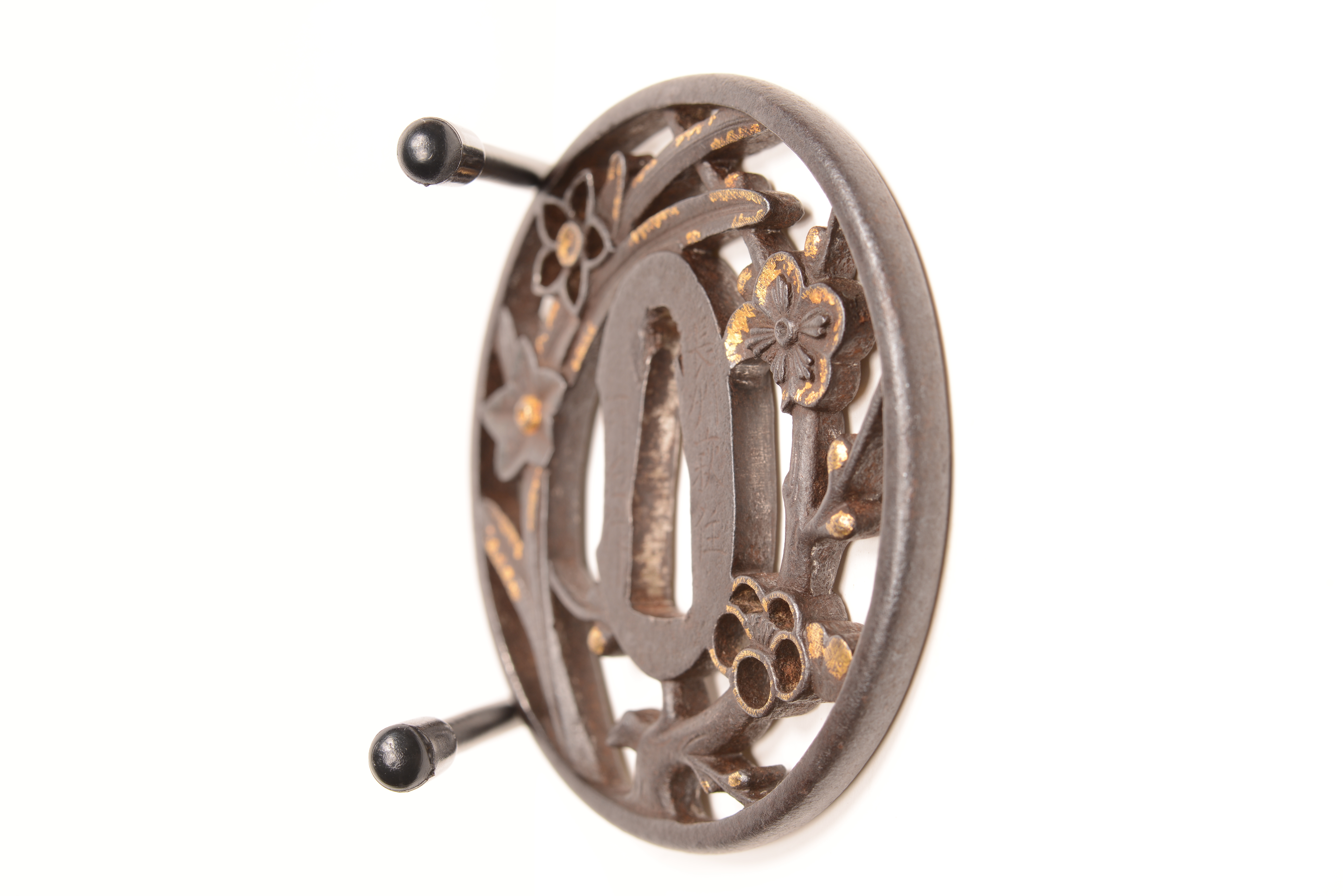 鉄地 丸形 透彫 金象嵌絵 銘:長州萩住河治作