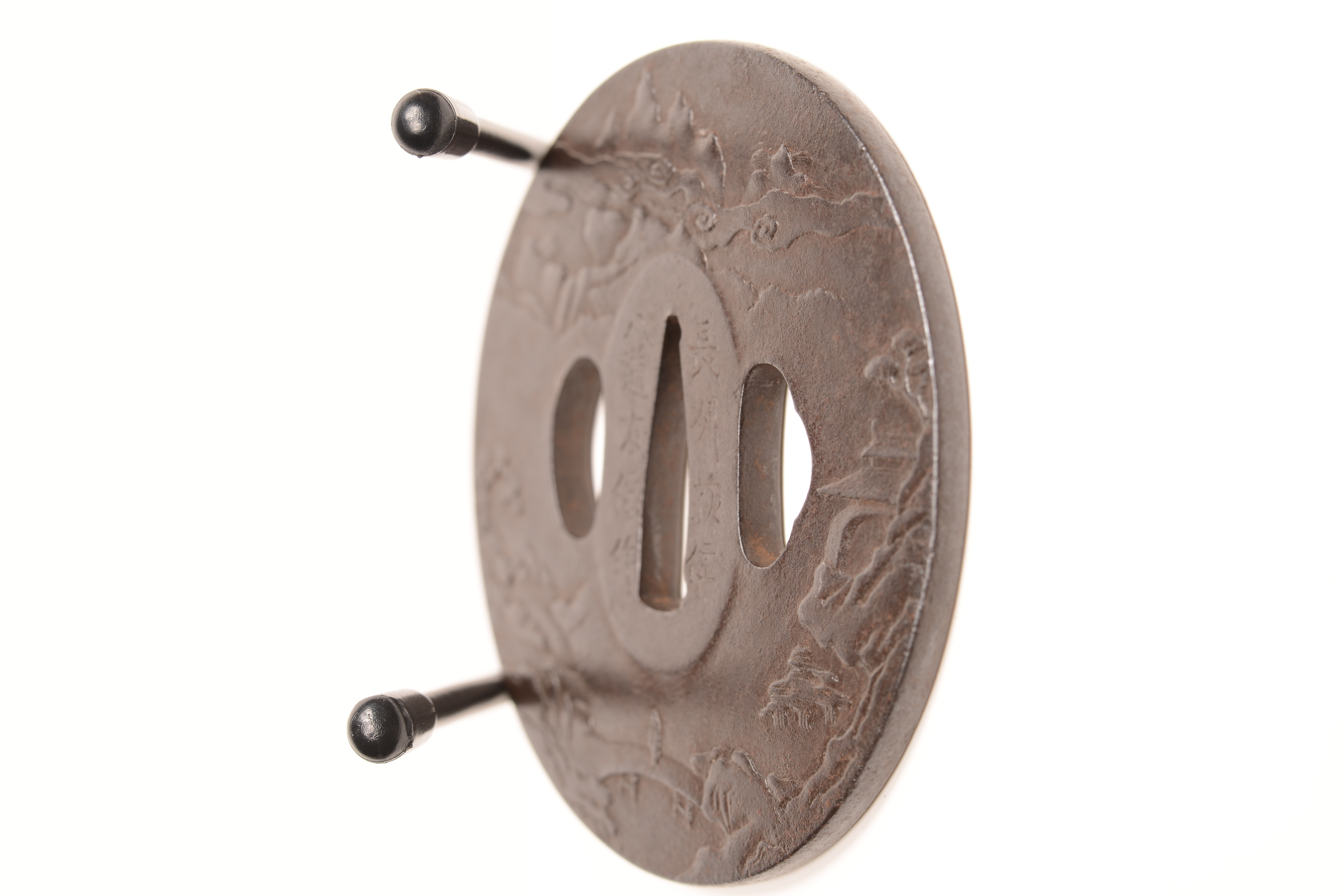 鉄地 竪丸形 肉彫 銘:長州萩住八道友信作