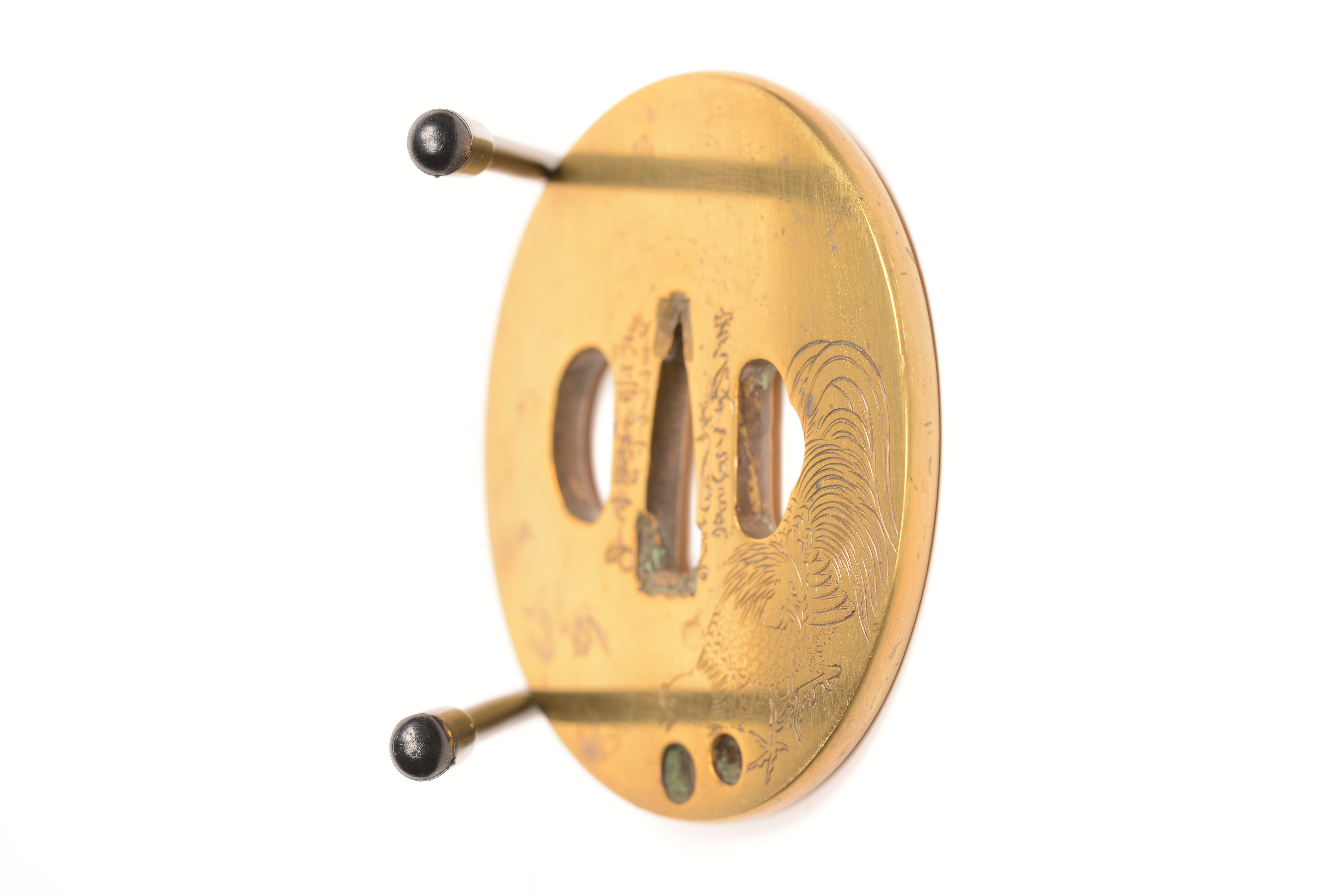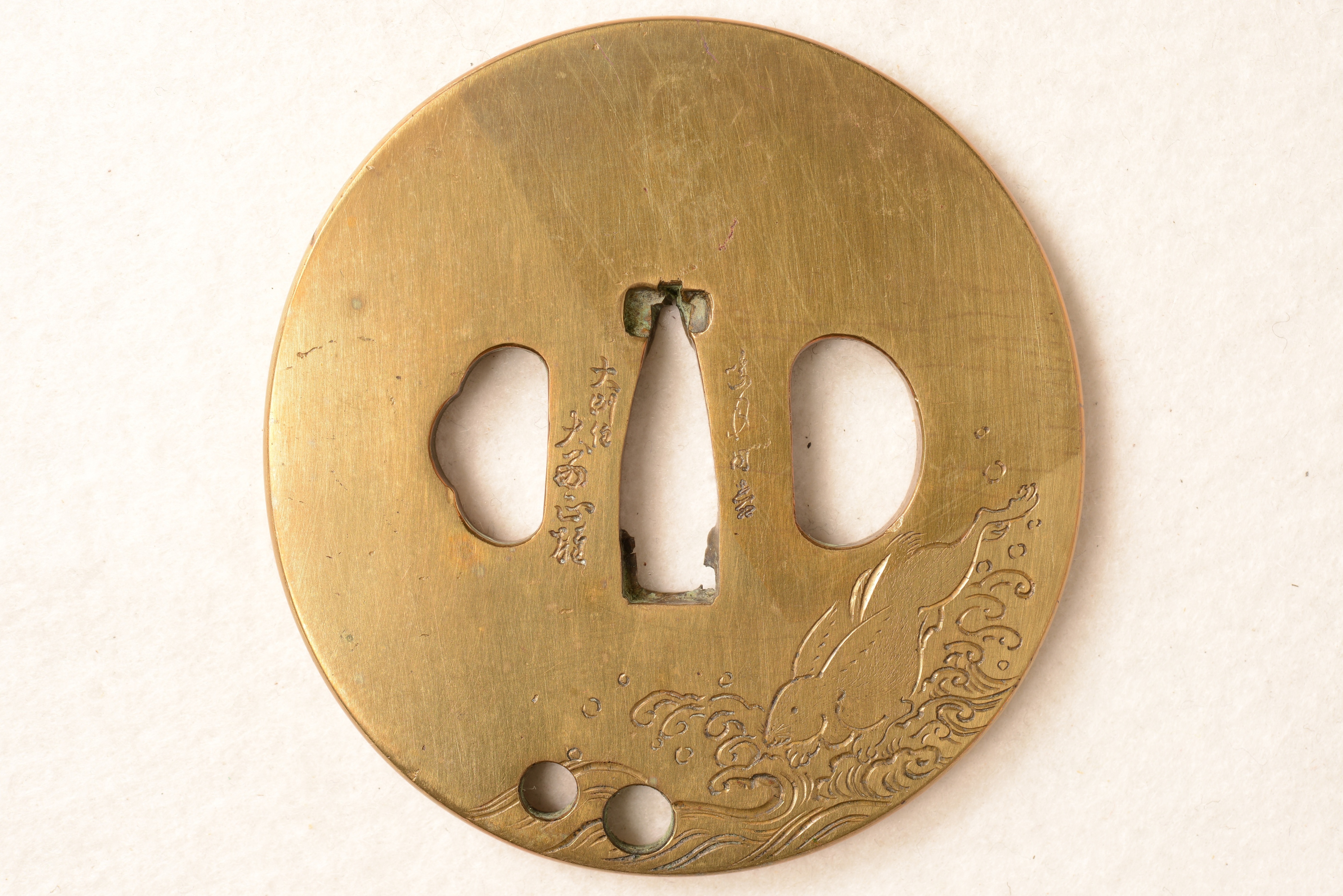 真鍮地 丸形 毛彫 銘:(表)寛政十一年己未葉月吉日 於大洲イヨマツヤマ正阿弥盛世(花押) (裏)■月■■ 大洲住大西正雄