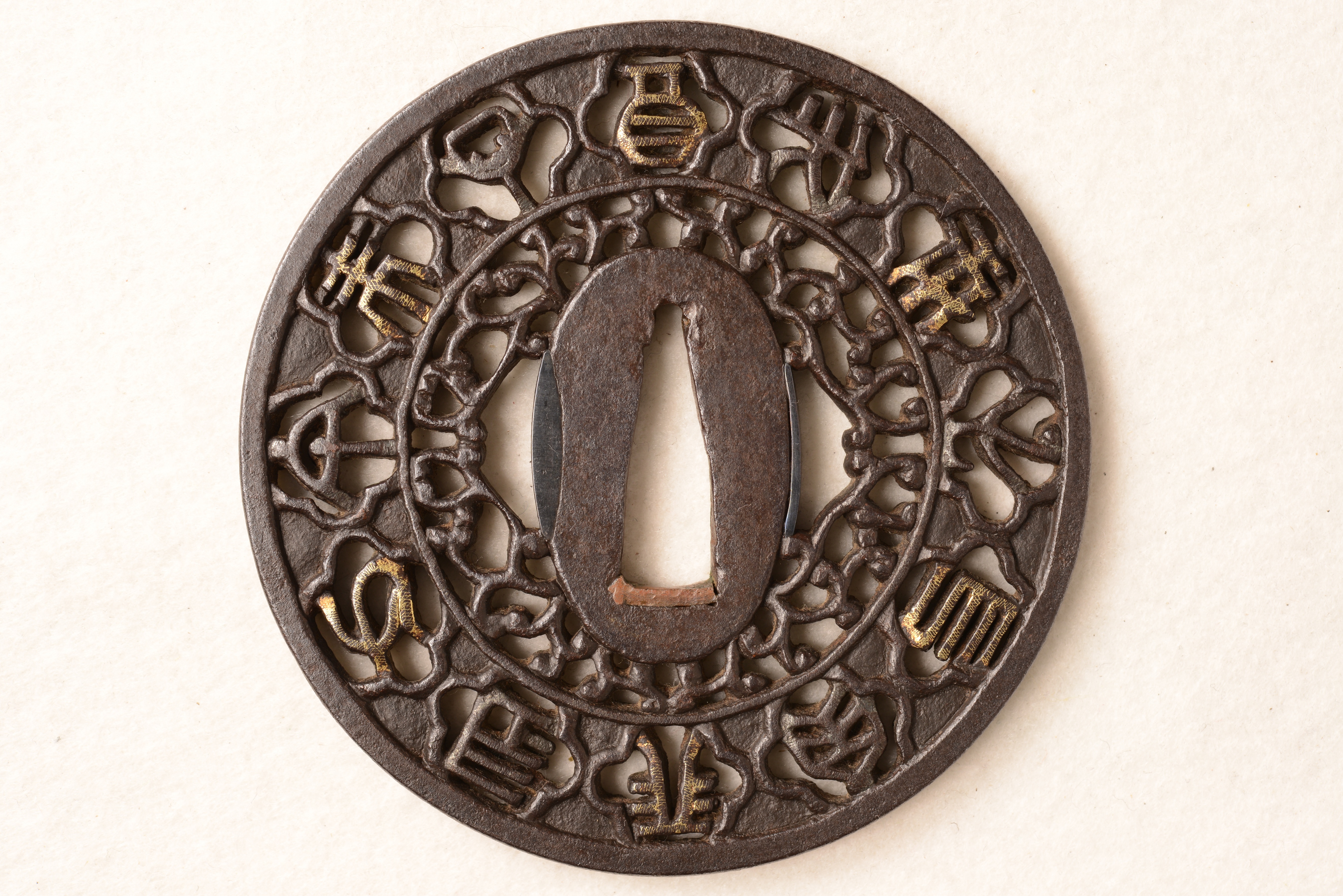 鉄地 南蛮鐔 丸形 透彫 金象嵌