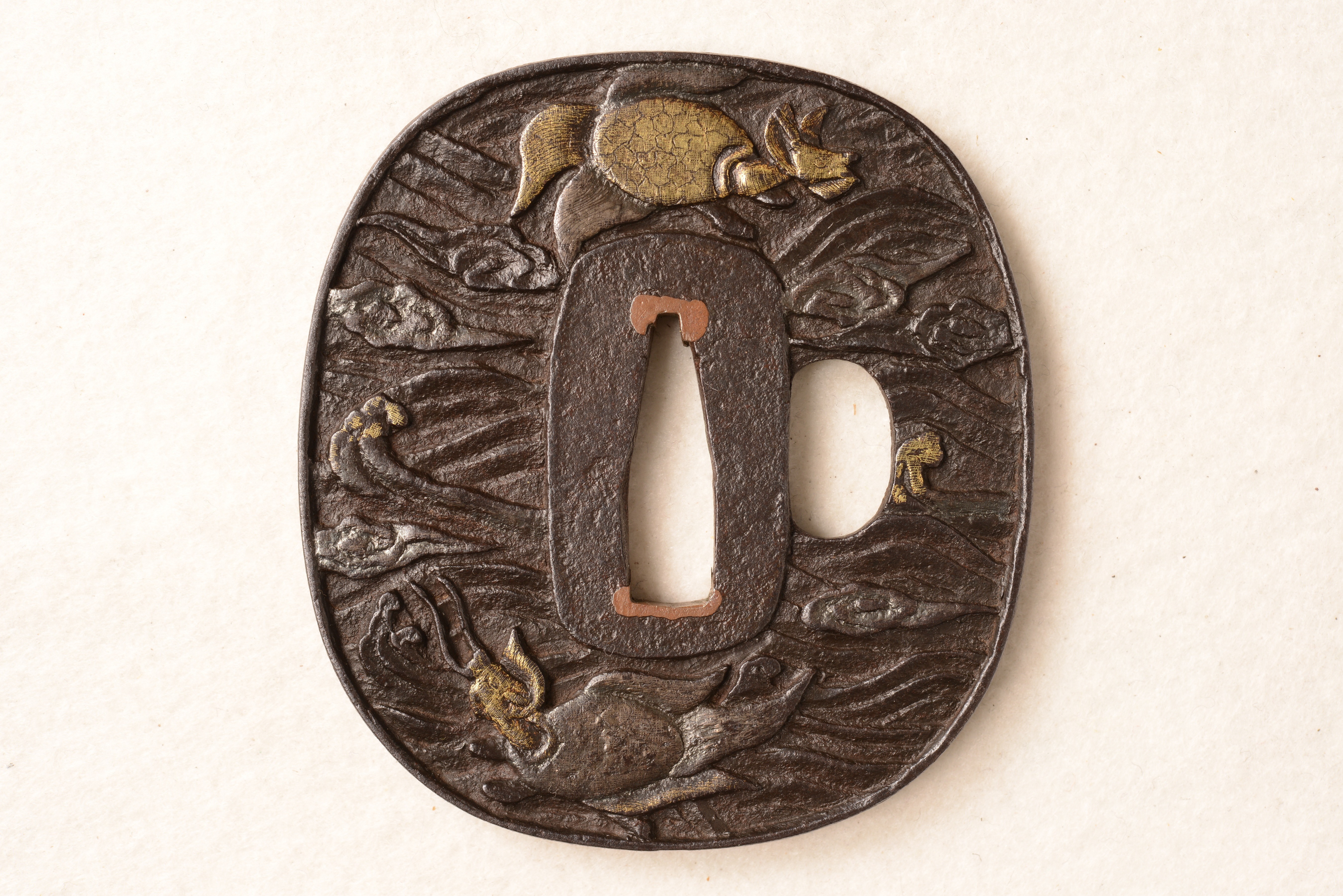 鉄地 広東鐔 撫角形 肉彫 金象嵌