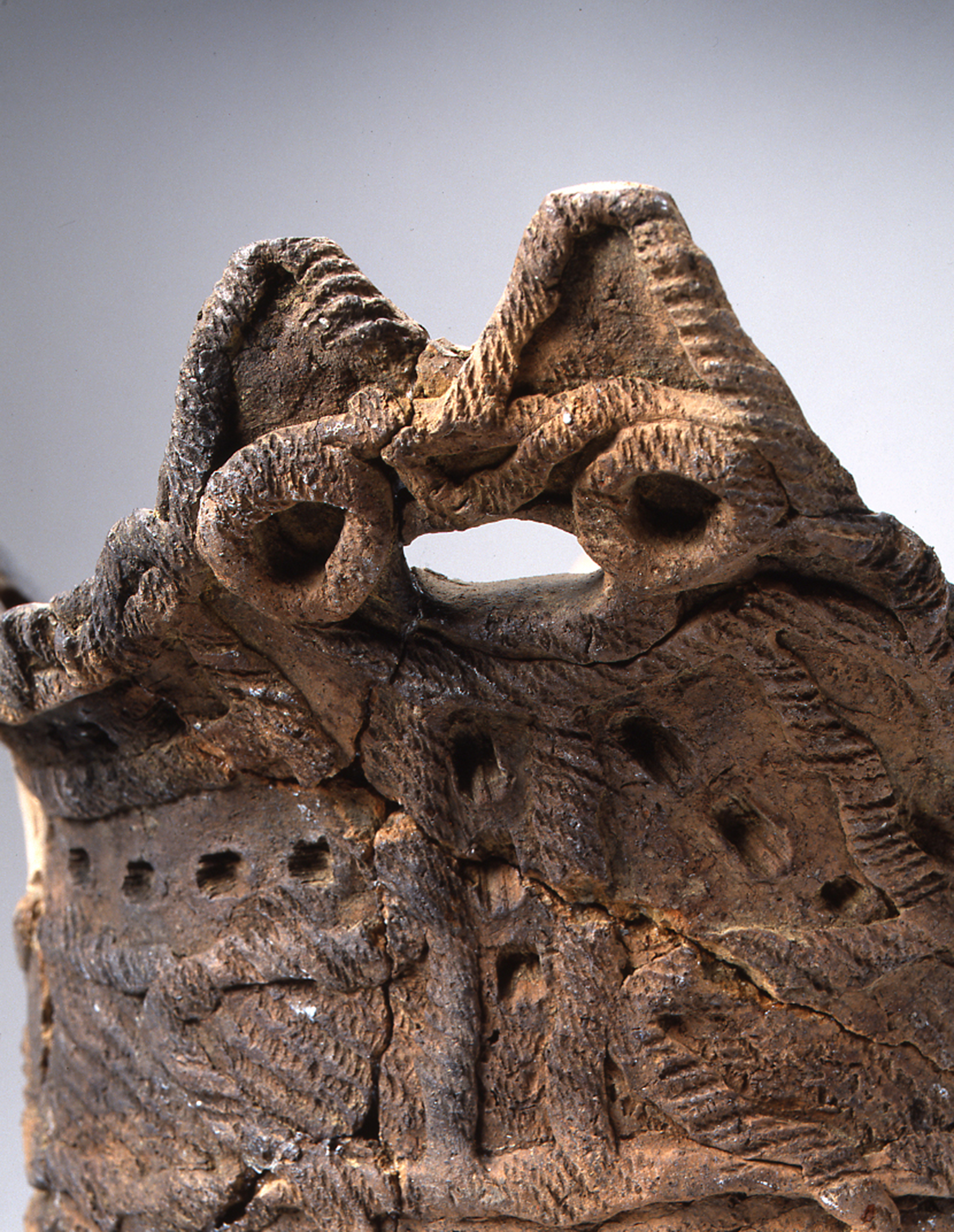 円筒上層C式。張りのある胴部に4か所の弁状突起文様体はやや広く隆帯で区画した中に長方形の刺突が入る。弁状突起を利用して隆帯で耳・目・口を描き獣面にしている。同形式の土器の装飾でこのモチーフの組み合わせは見受けられない。意図的な製作とみられる。