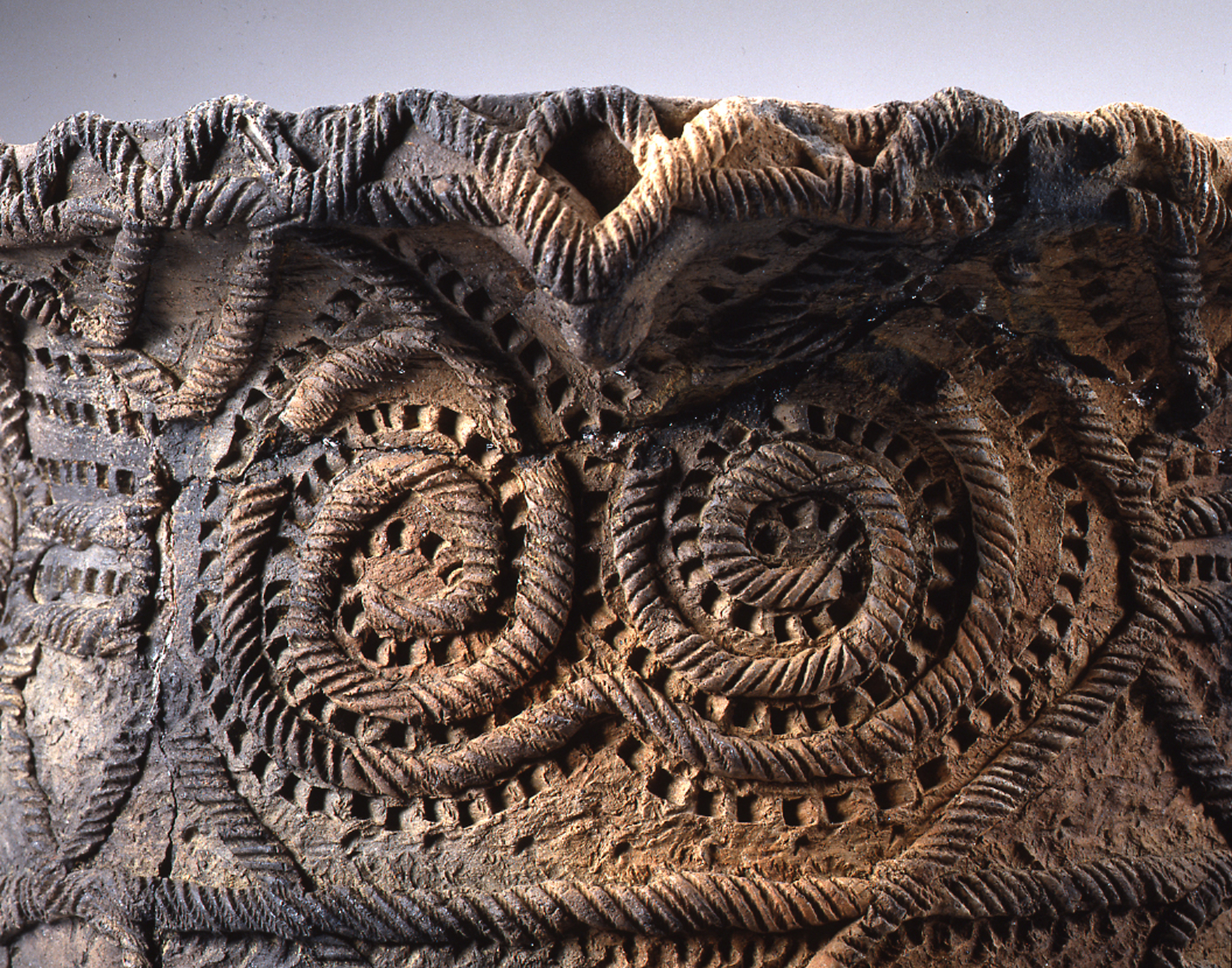 大型の円筒上層c式土器。平縁で4単位の文様がつけられる。沈線と刺突文様を組み合わせ、フクロウの顔のような印象に仕上げている。同型式の土器の装飾でこのモチーフの組み合わせは見受けられない。意図的な製作とみられる。