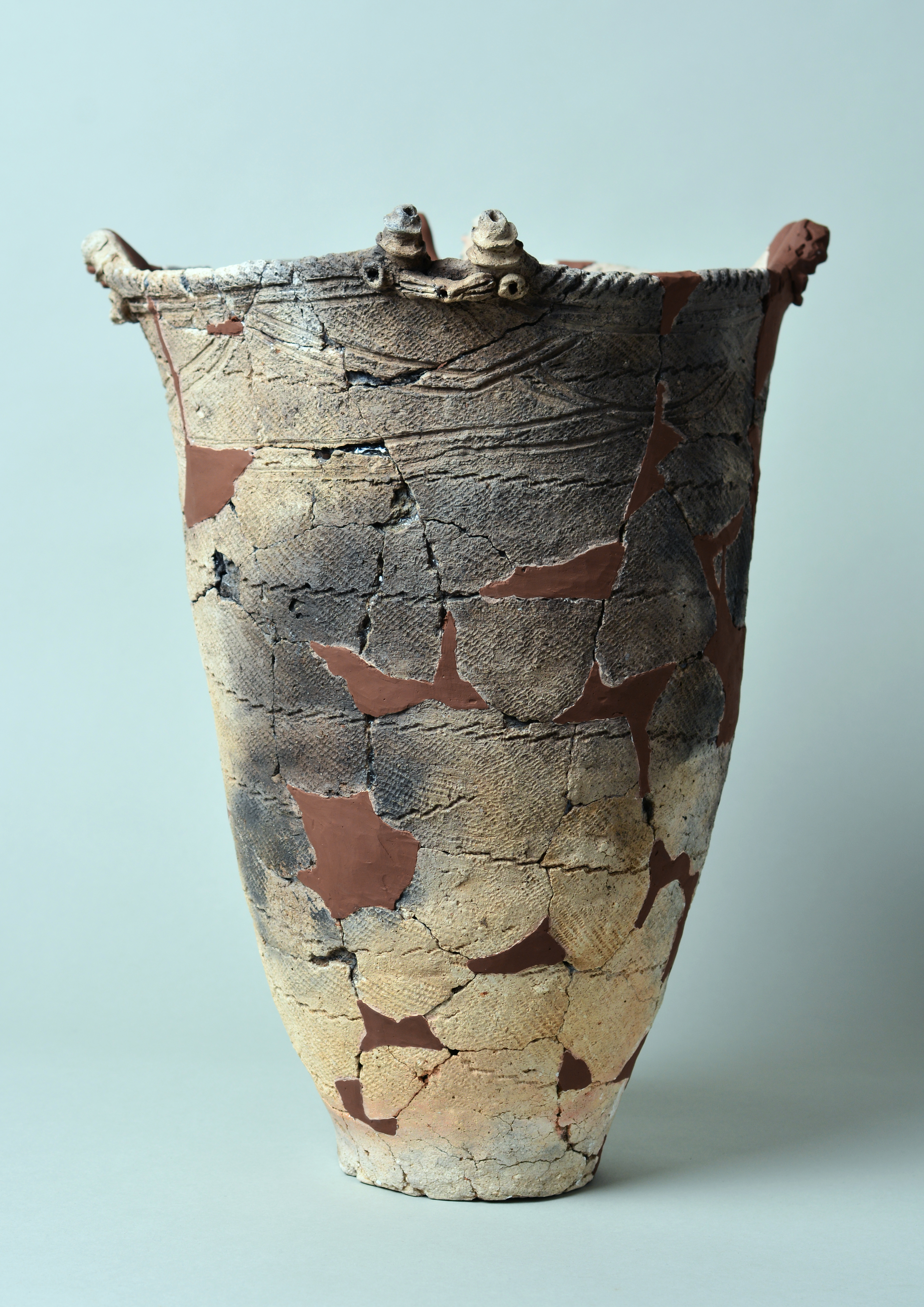 円筒上層e式土器。小さな底部に上張りのある胴部、さらに開いた口縁が翼のようにも見える。小波状となる口縁の頂部を利用して、角状の突起をつけ、角の下に小さく丸く貼り付けた目玉、横に張り付けられた鼻にはヒゲが描かれている。土器本体は地紋縄文に弧状の沈線が描かれる上層e式であるが、上記の装飾が同形式の土器に施文されることはない。意図的な意匠とみられる。