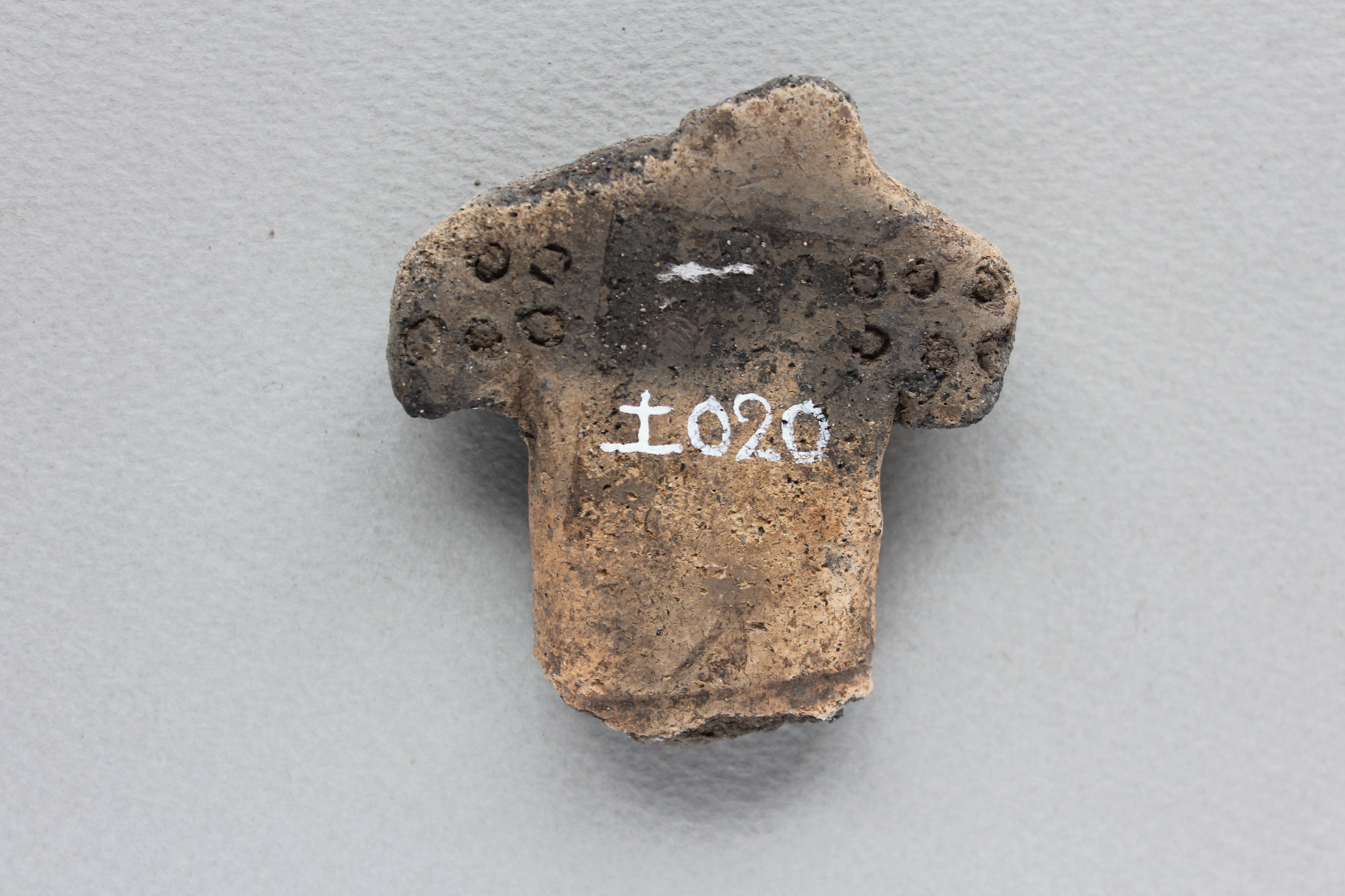 板状。頭部・肘から先の両腕,腰から下欠失。頸からY字状に正中線。肩袖口に鋸歯文様。背面袖に円形の刺突文様。腰回りに沈線。下帯か。胎土は黒く細やかで混入物少ない。
