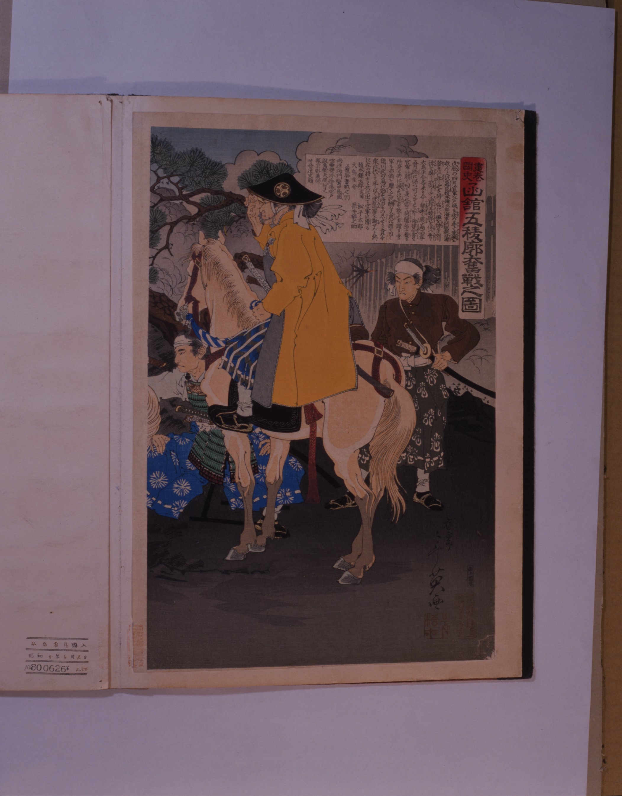 錦絵(三枚組) 箱館方面の戦況を馬上から見ている榎本武揚と松平太郎が描かれています。作者は右田年英という人物で、月岡芳年の門下に学びました。洋画を学ぶなど、幅の広い画風を身につけました。武者絵、役者絵、美人風俗画など多彩なジャンルの錦絵を制作するほか、新聞や雑誌の挿絵なども手がけています。