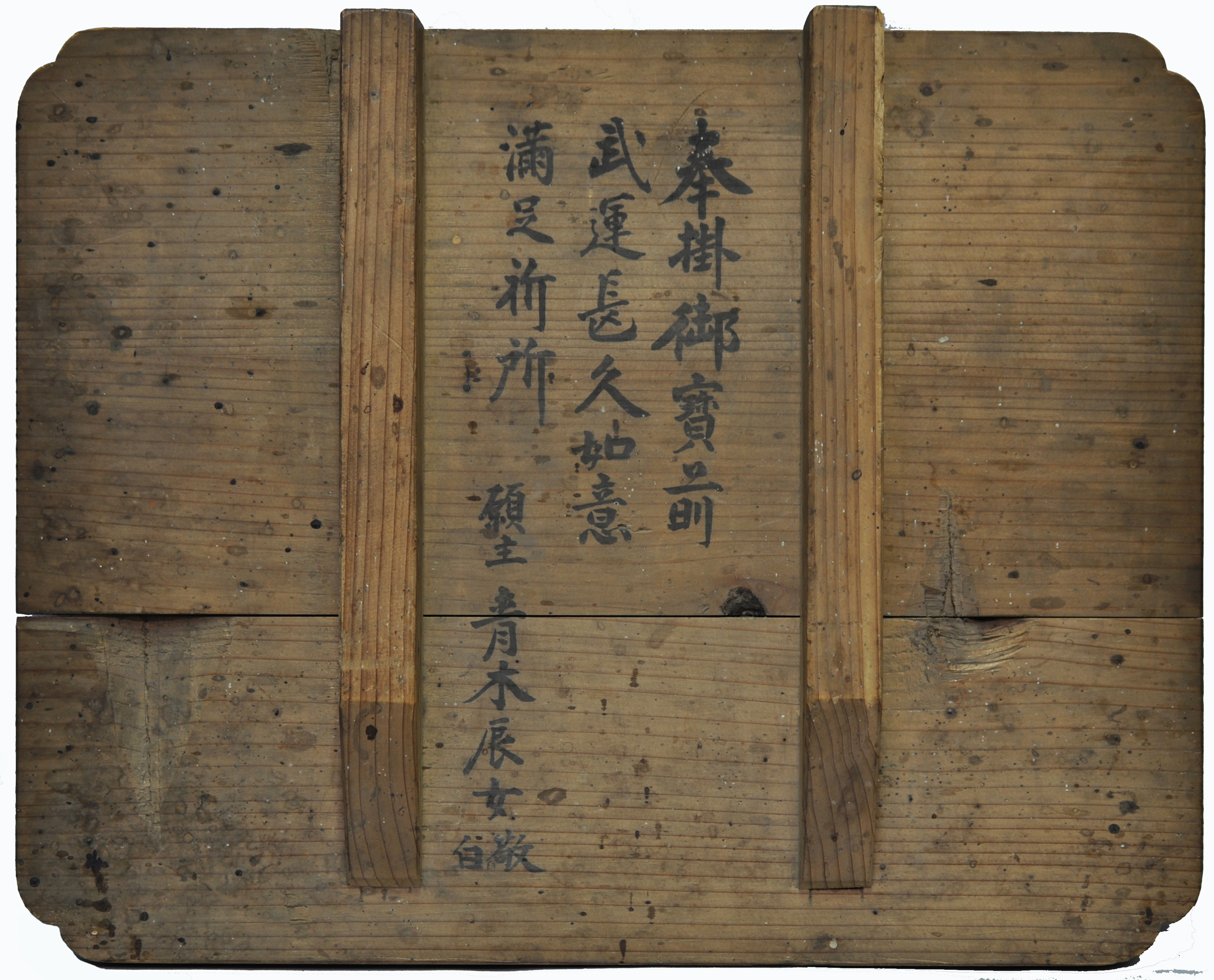 「元治元甲□(子)年三月吉旦(日カ) 青木蒼明□□葵源正□謹画之」 「願主 青木辰女敬白」とあり。絵馬の裏に「奉掛御宝前 武運長久如意 満足祈所 願主 青木辰女敬白」とあり。