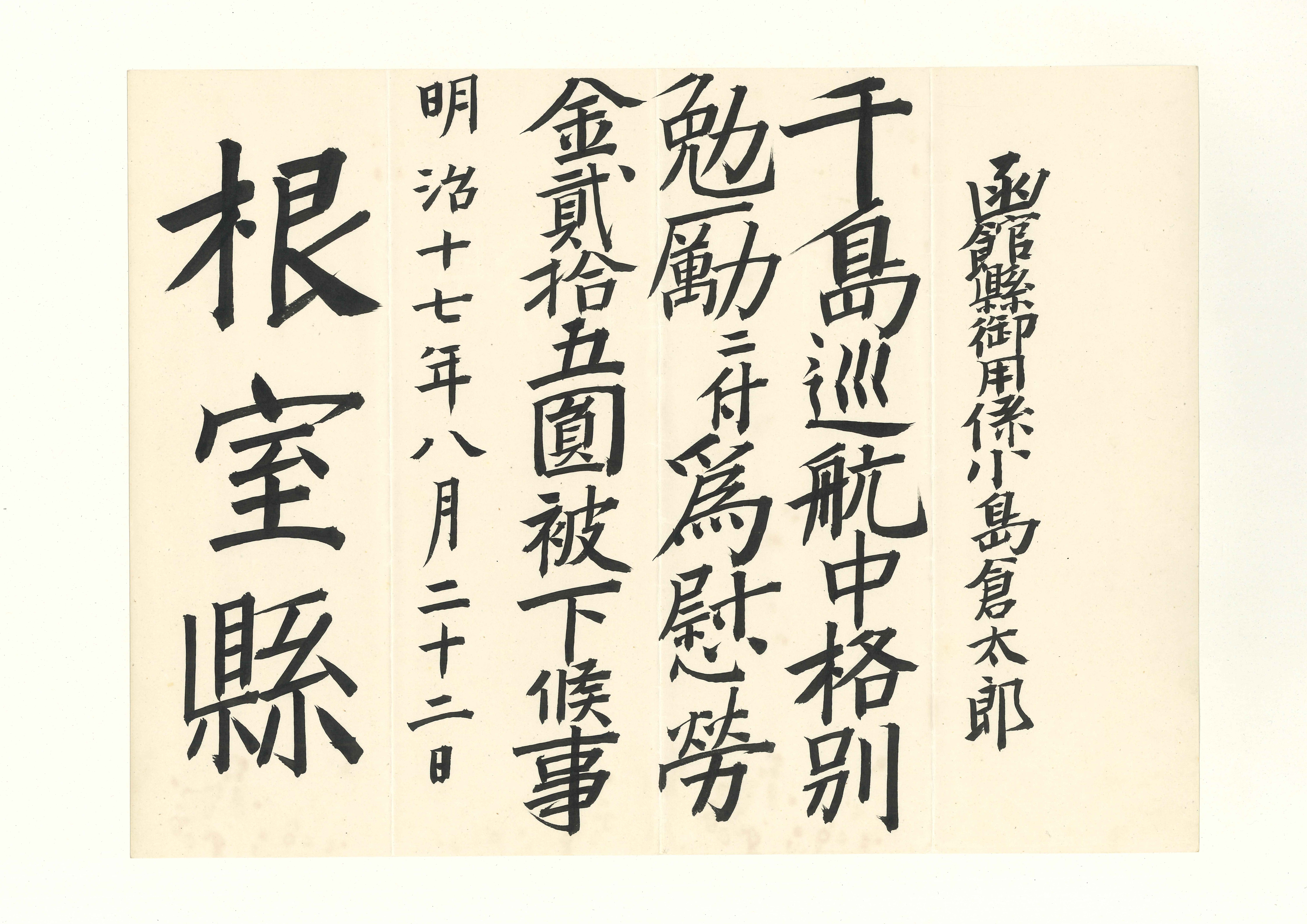 根室県から小島倉太郎に交付された辞令および文書類2通。