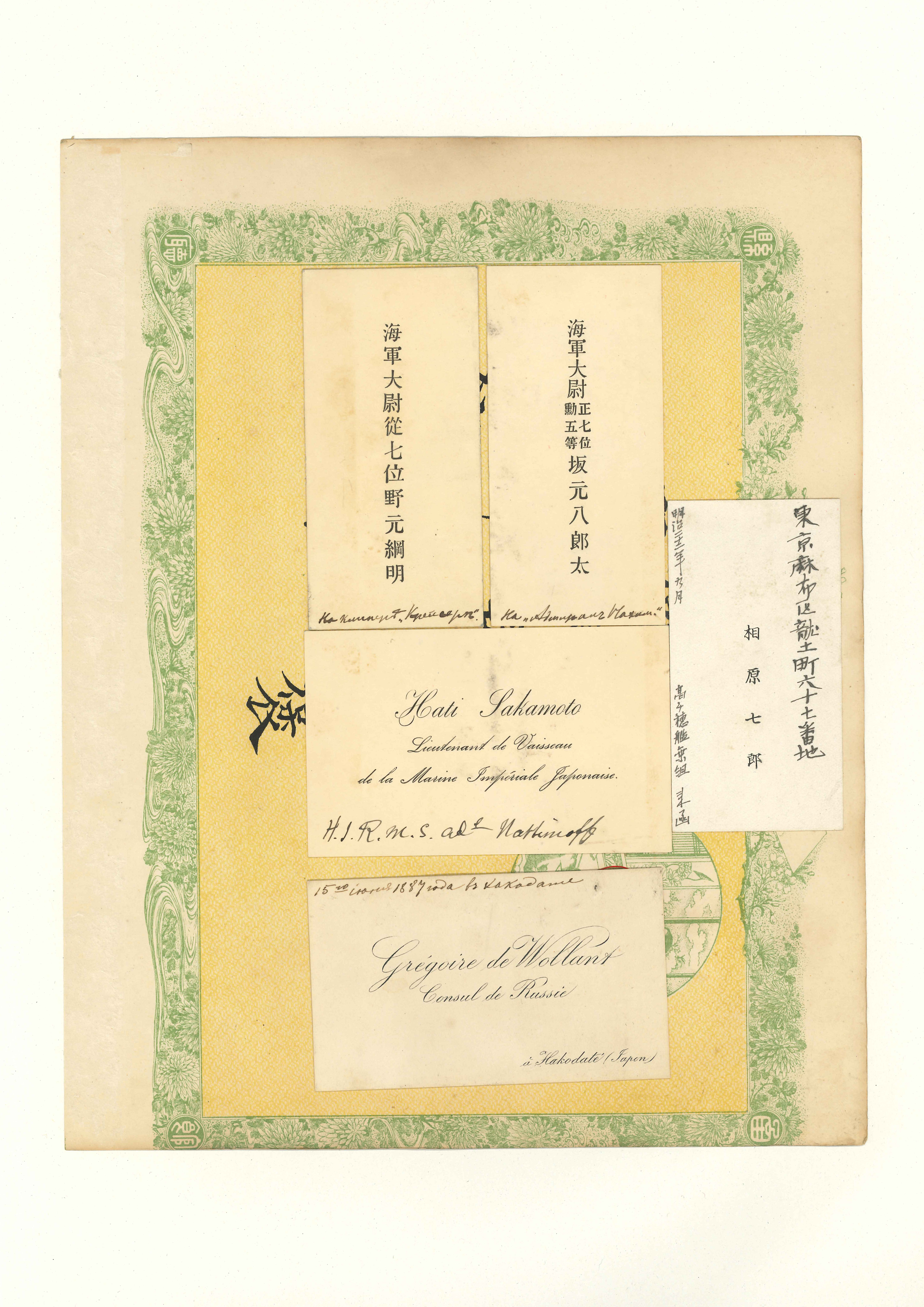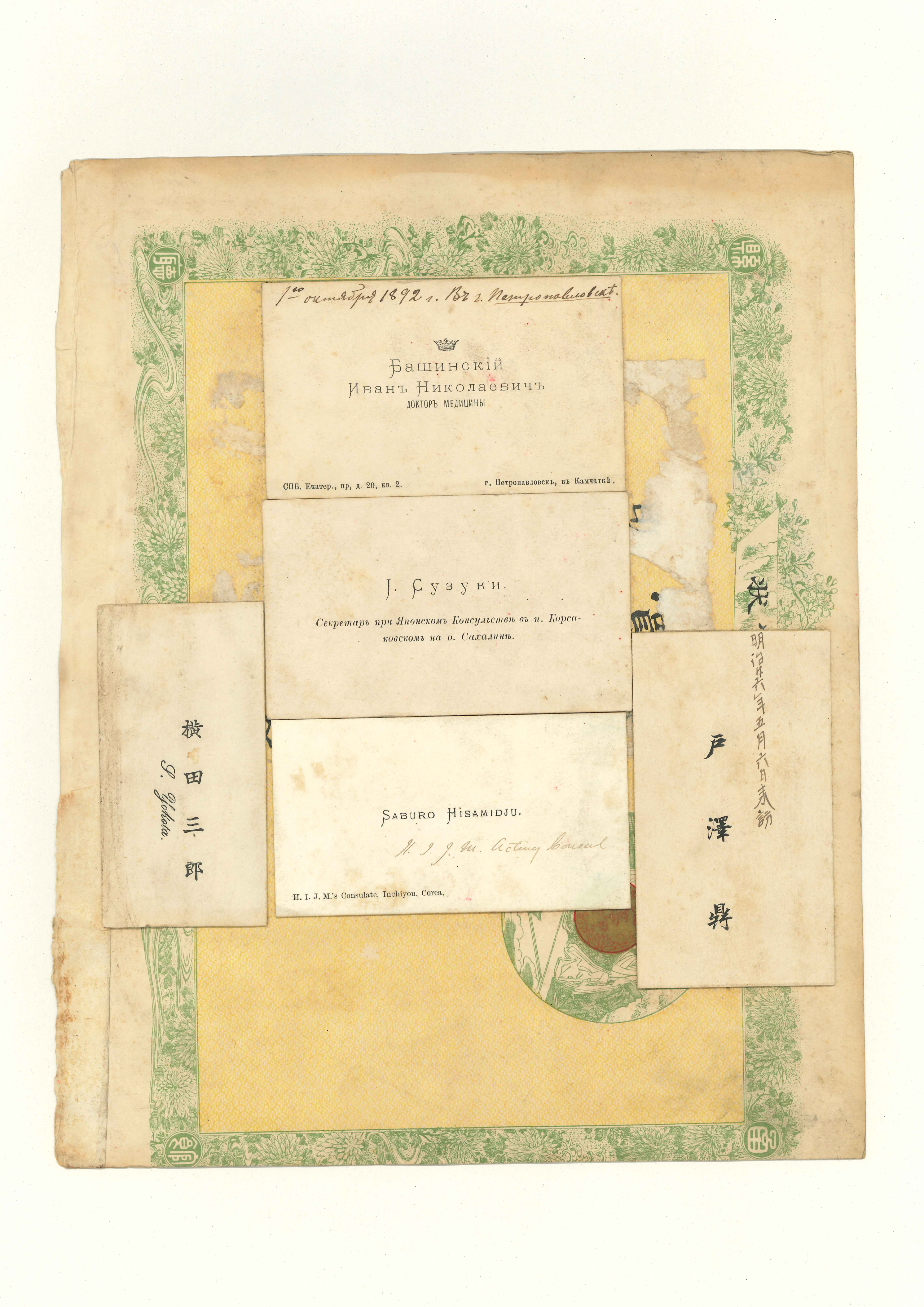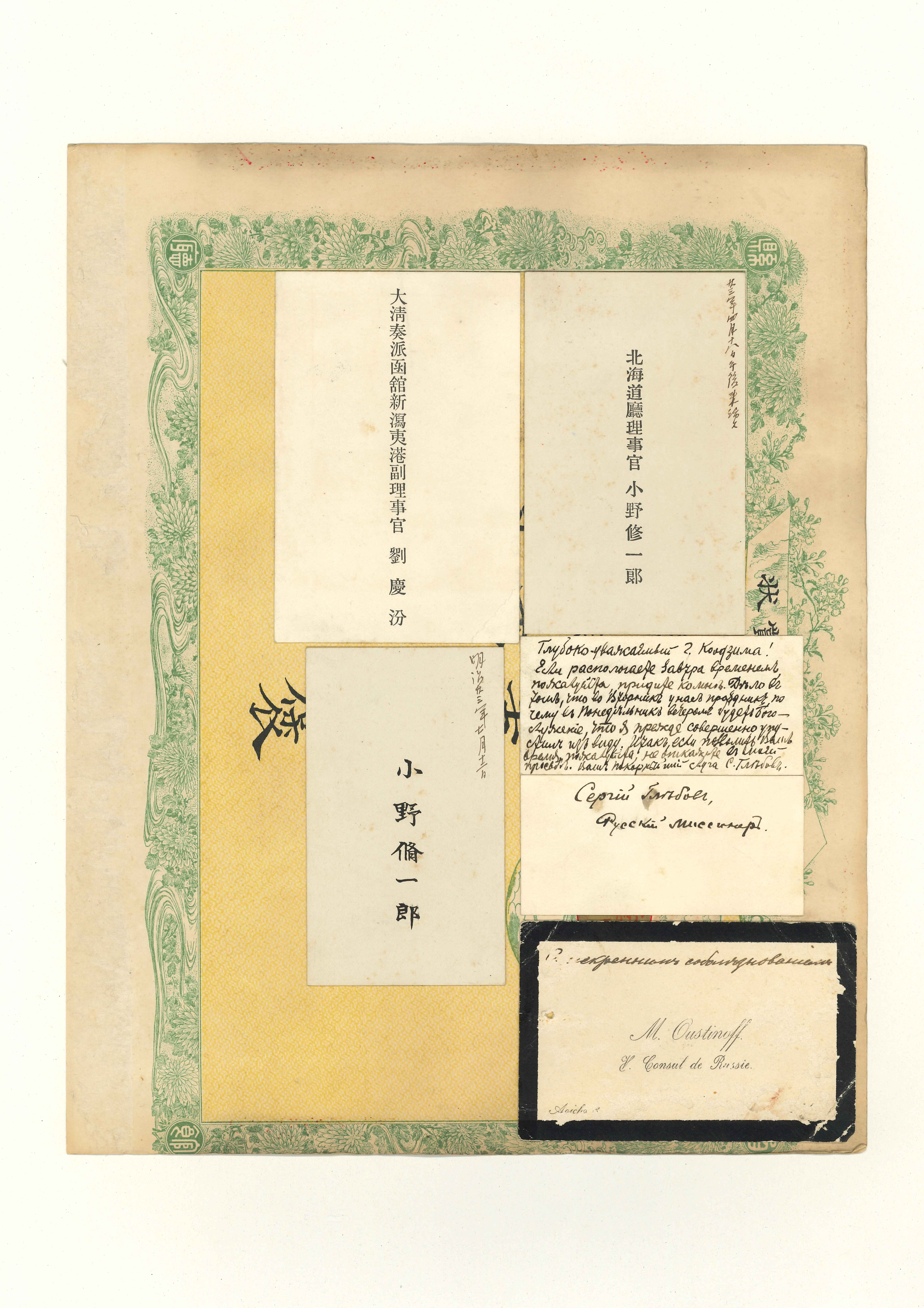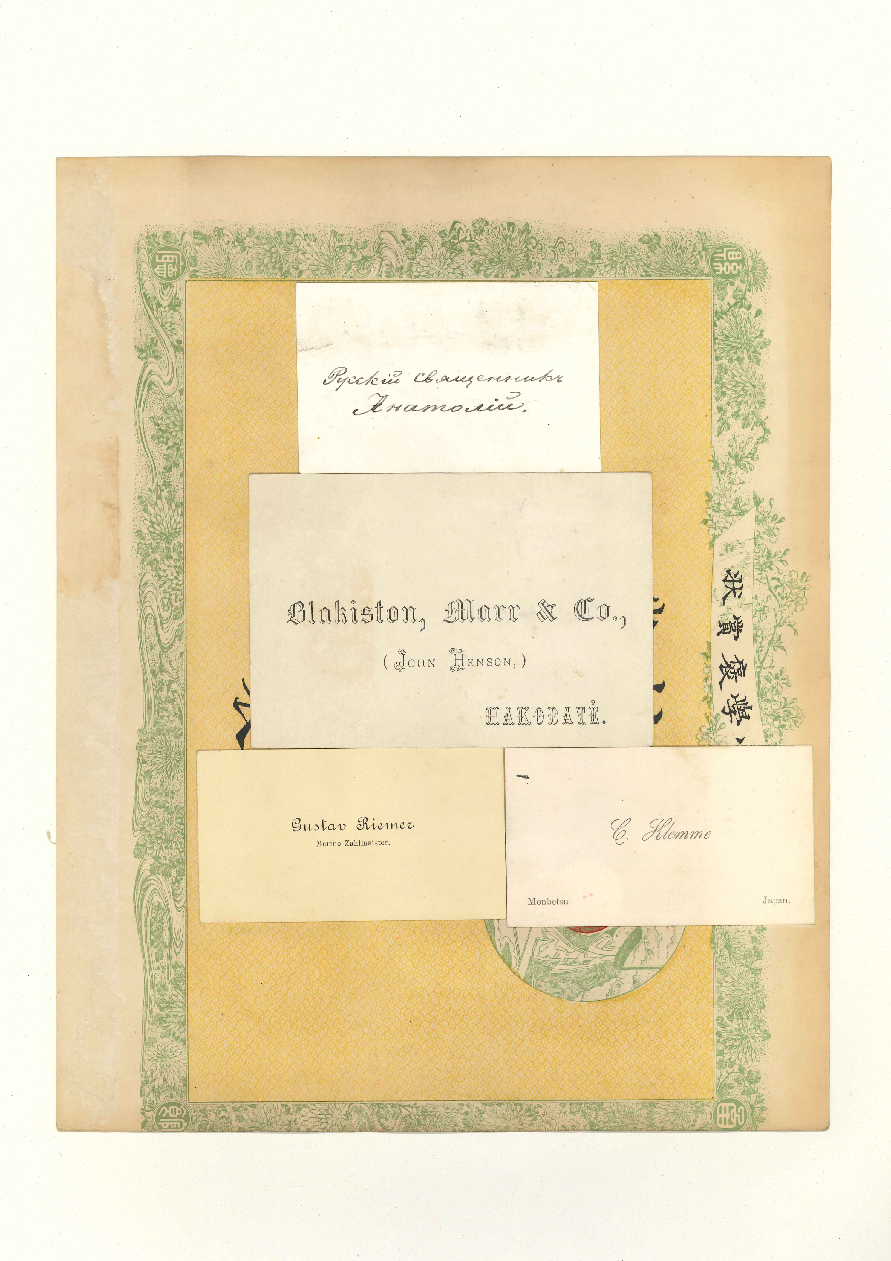 函館県の「小学褒賞状」11枚に,英人・仏人・中国人・日本人などの名刺50枚が分割貼付してある。中にはバチェラーやユースデンの名刺や,ブラキストン商会の名刺なども含まれている。