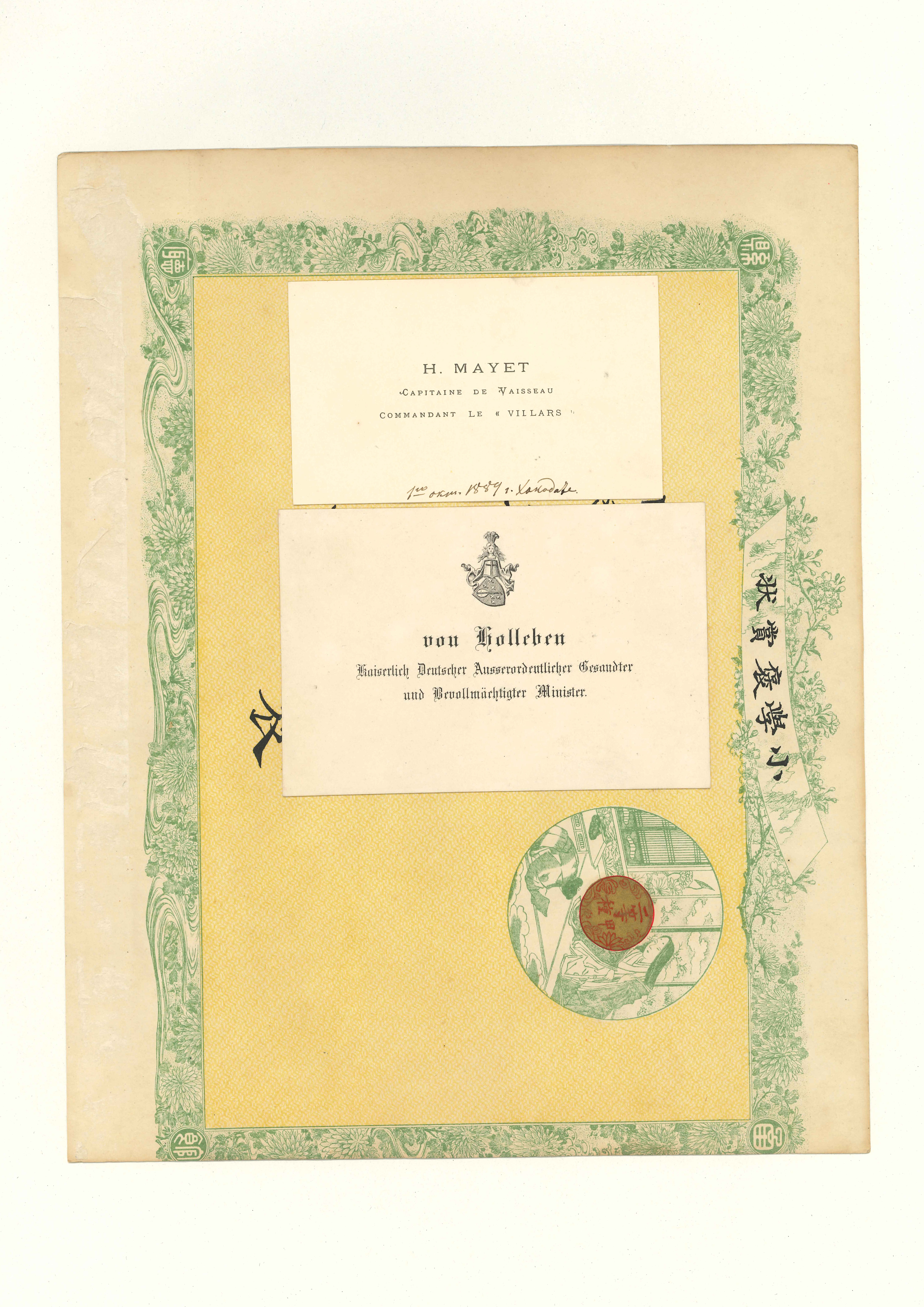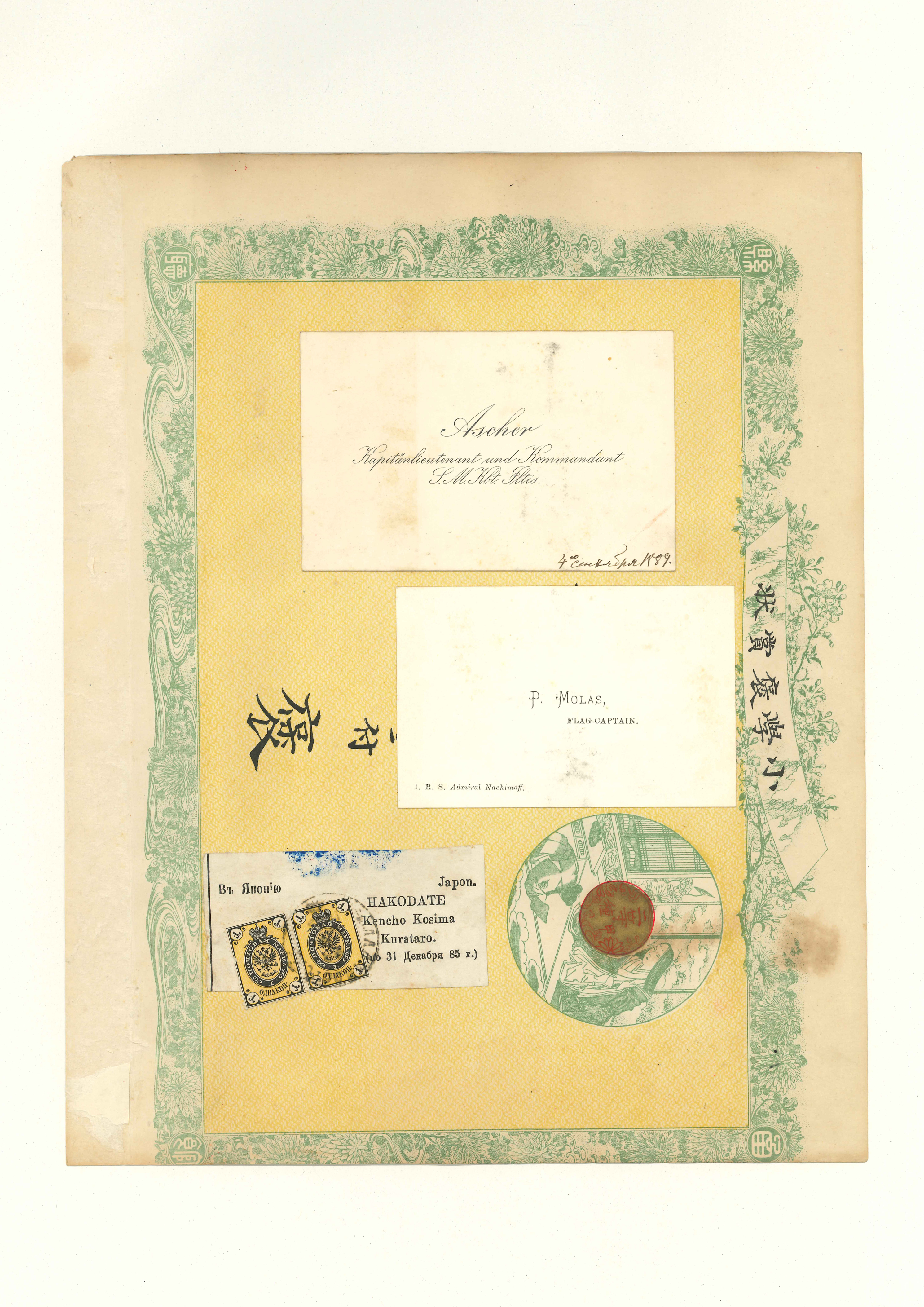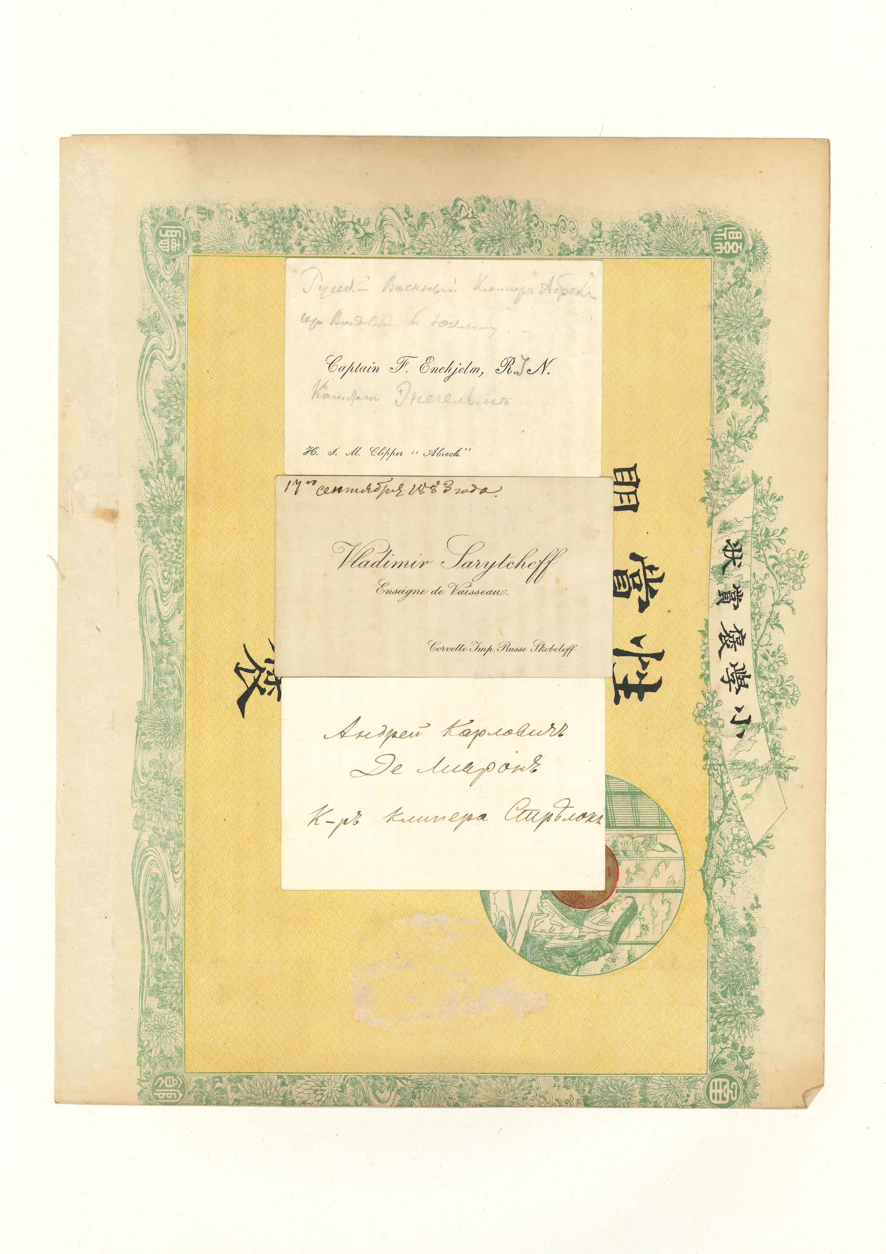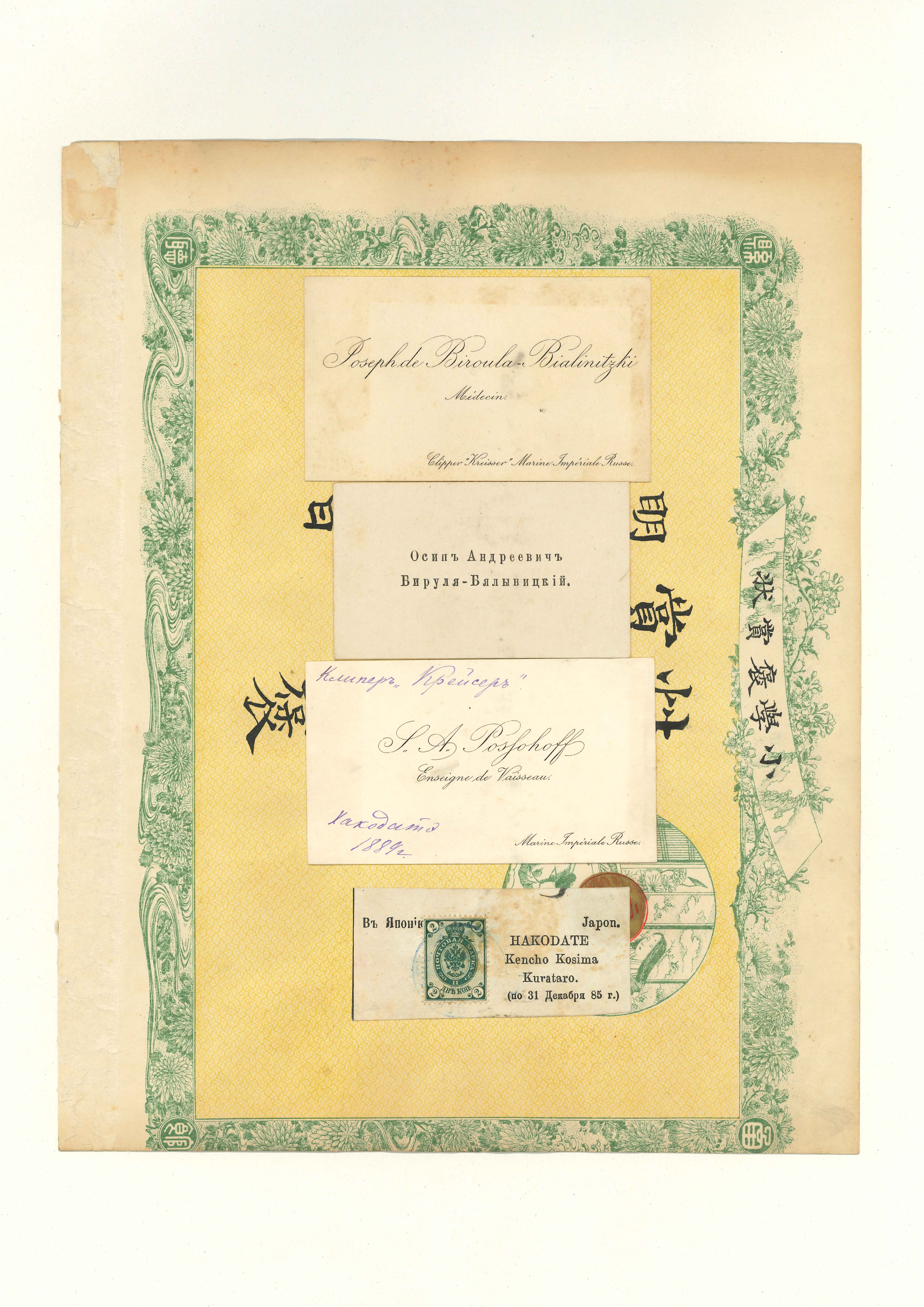 函館県の「小学褒賞状」11枚に,英人・仏人・中国人・日本人などの名刺50枚が分割貼付してある。中にはバチェラーやユースデンの名刺や,ブラキストン商会の名刺なども含まれている。