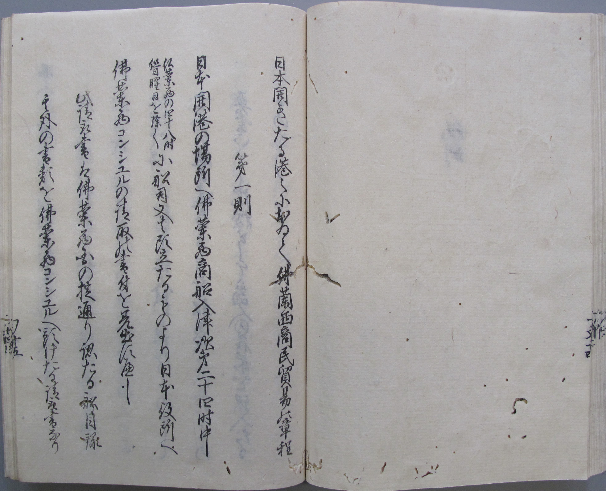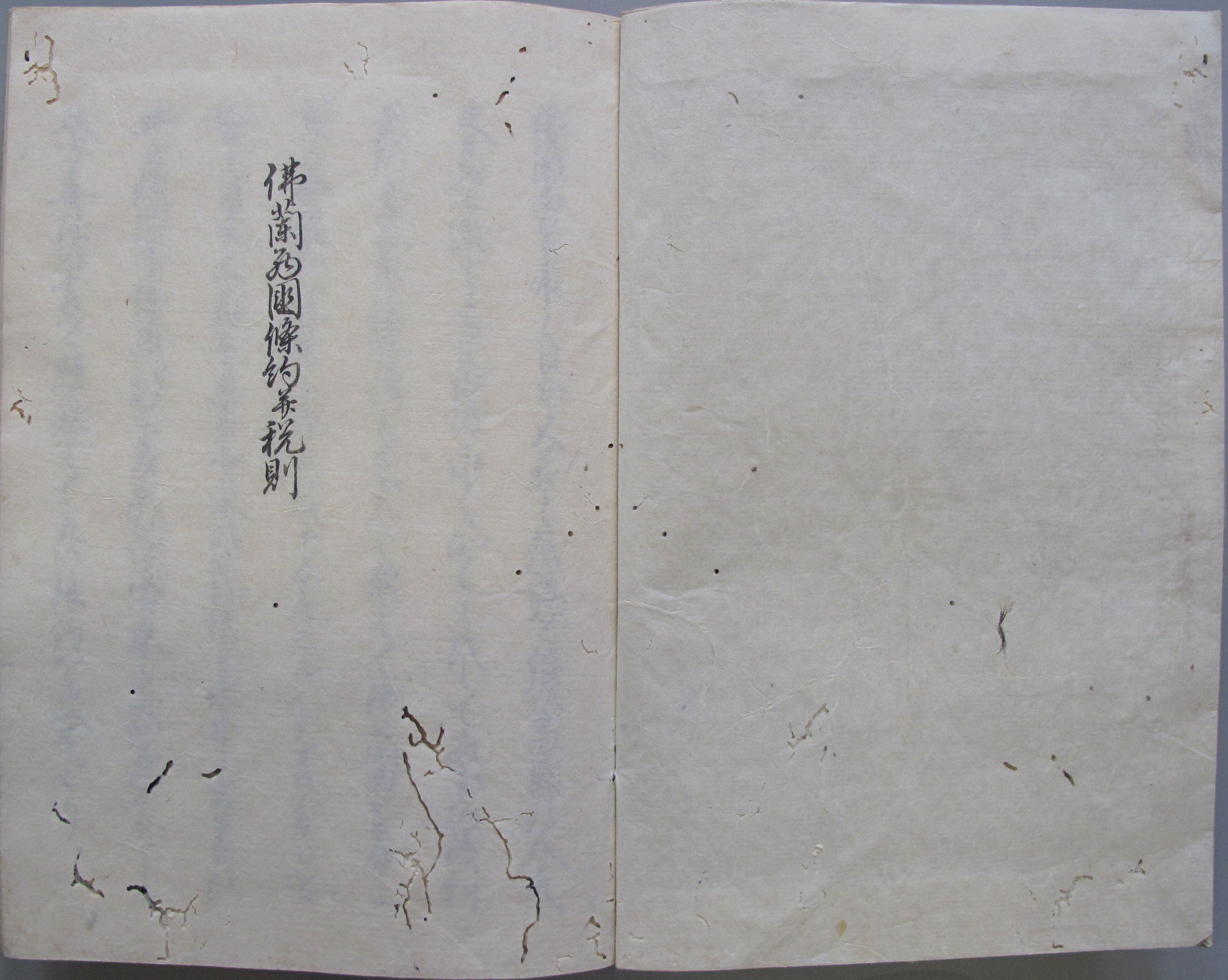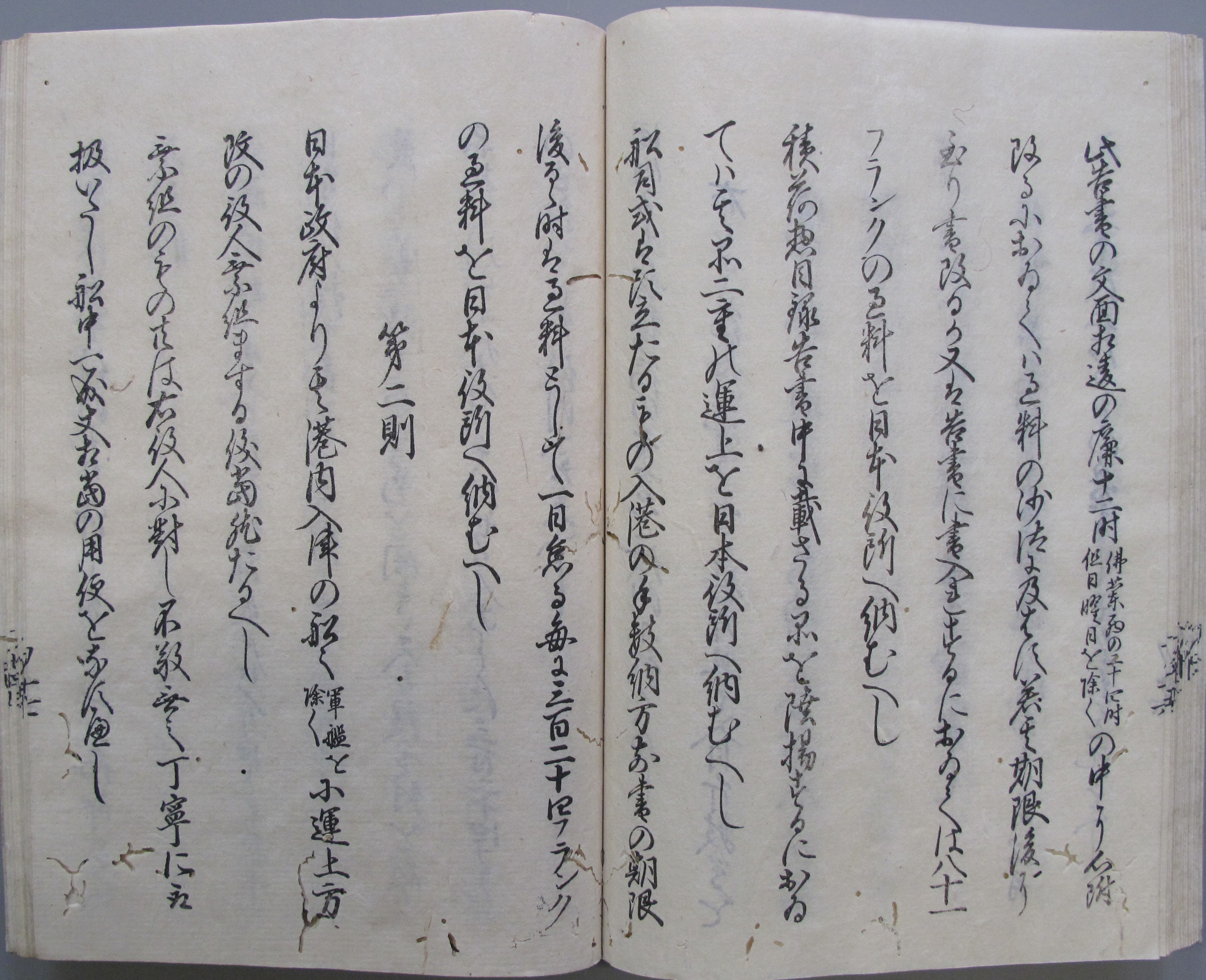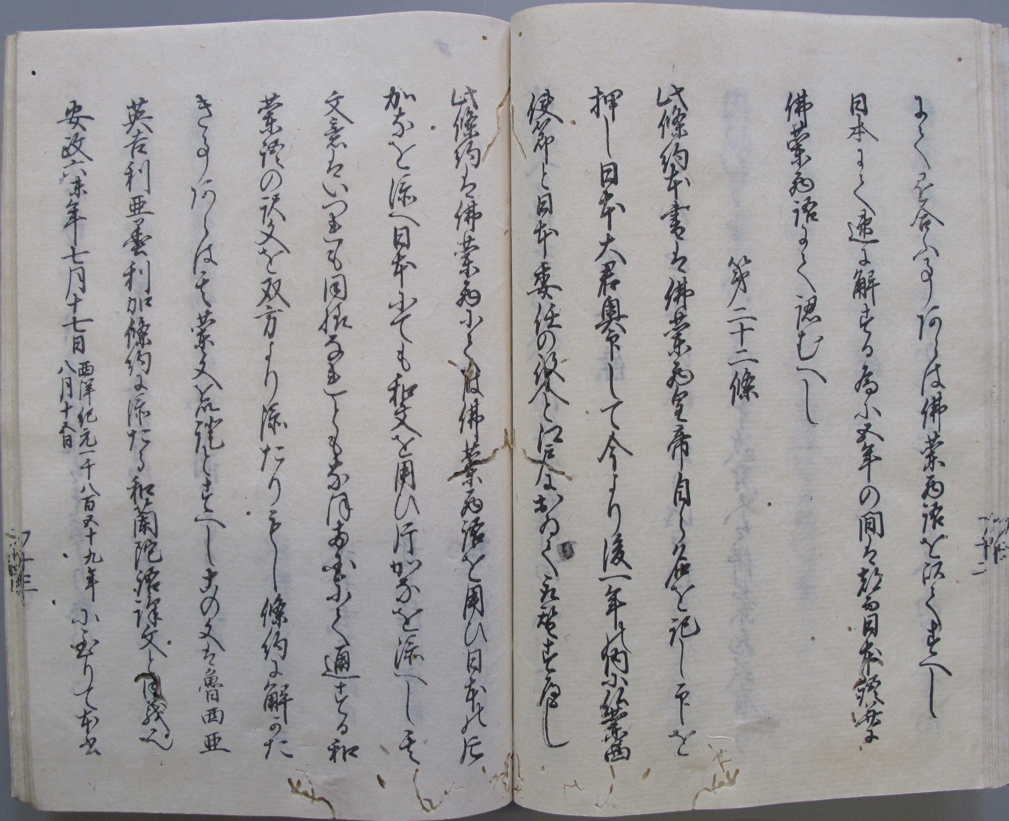 木版本 安政5(1858)年に米・露・仏・英・蘭と通商条約を締結。その条約文などについて書かれています。通商条約の内容は、印刷物として広く流布しました。