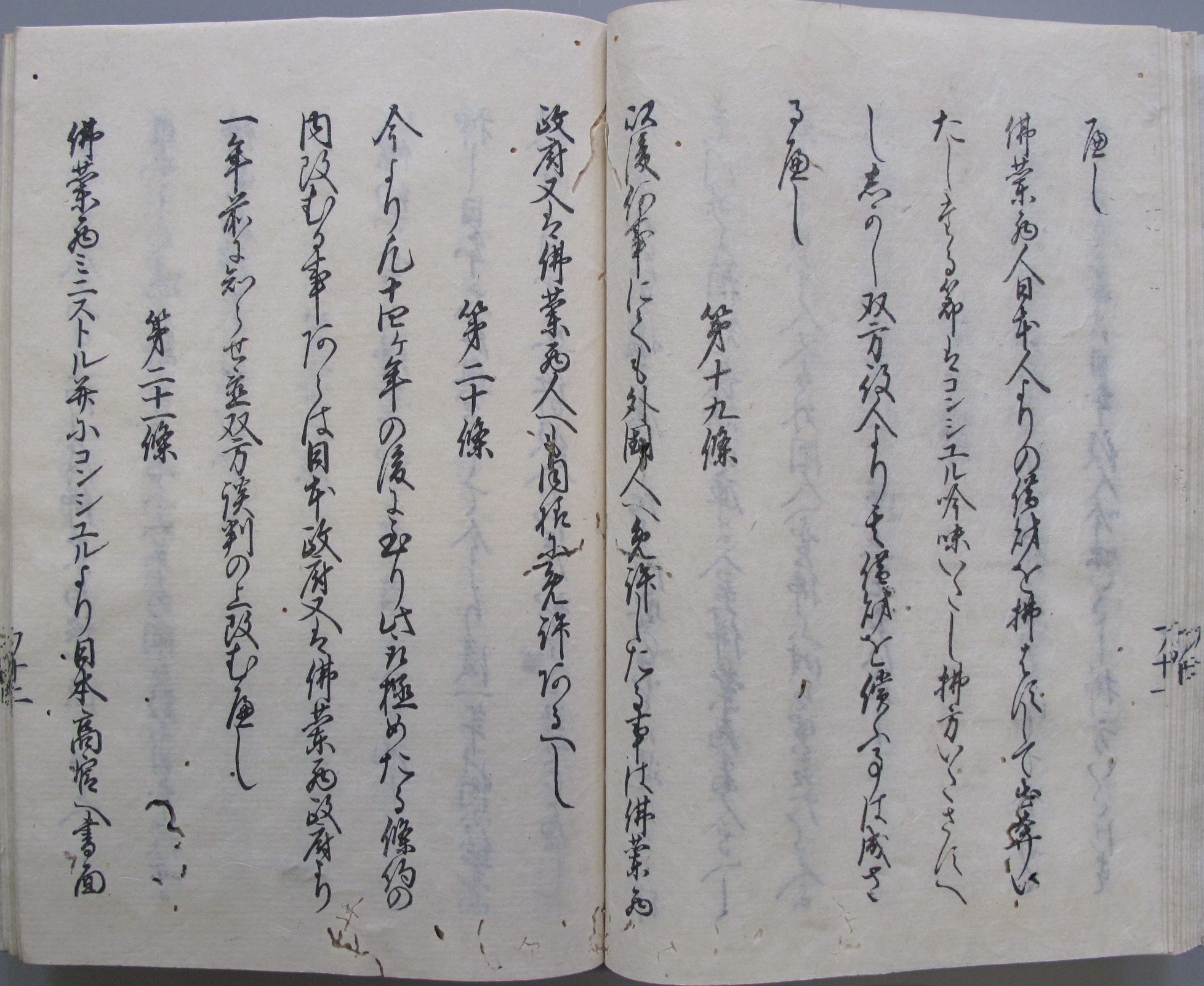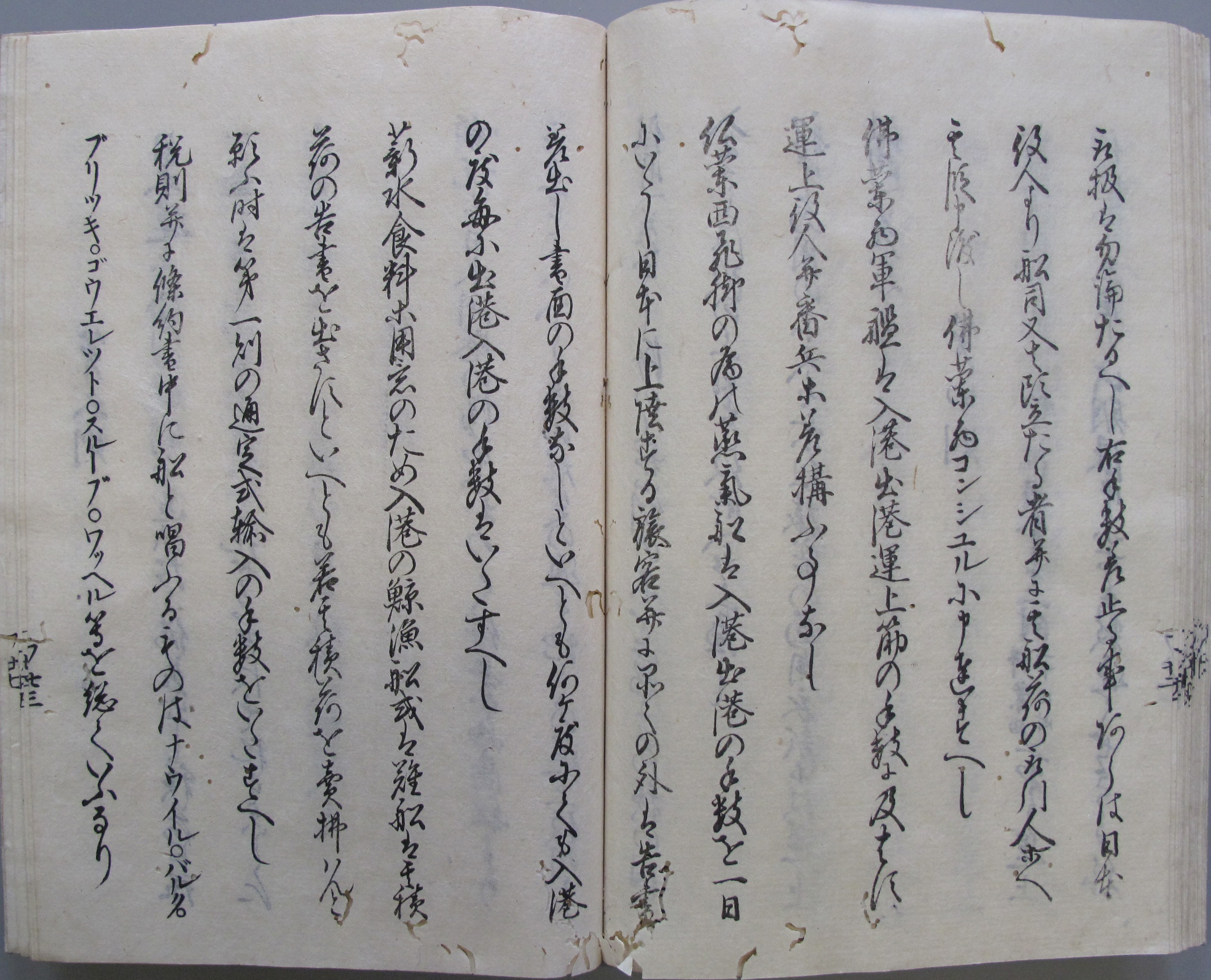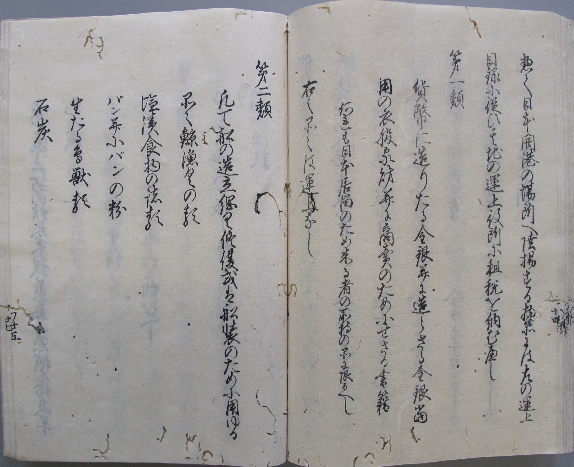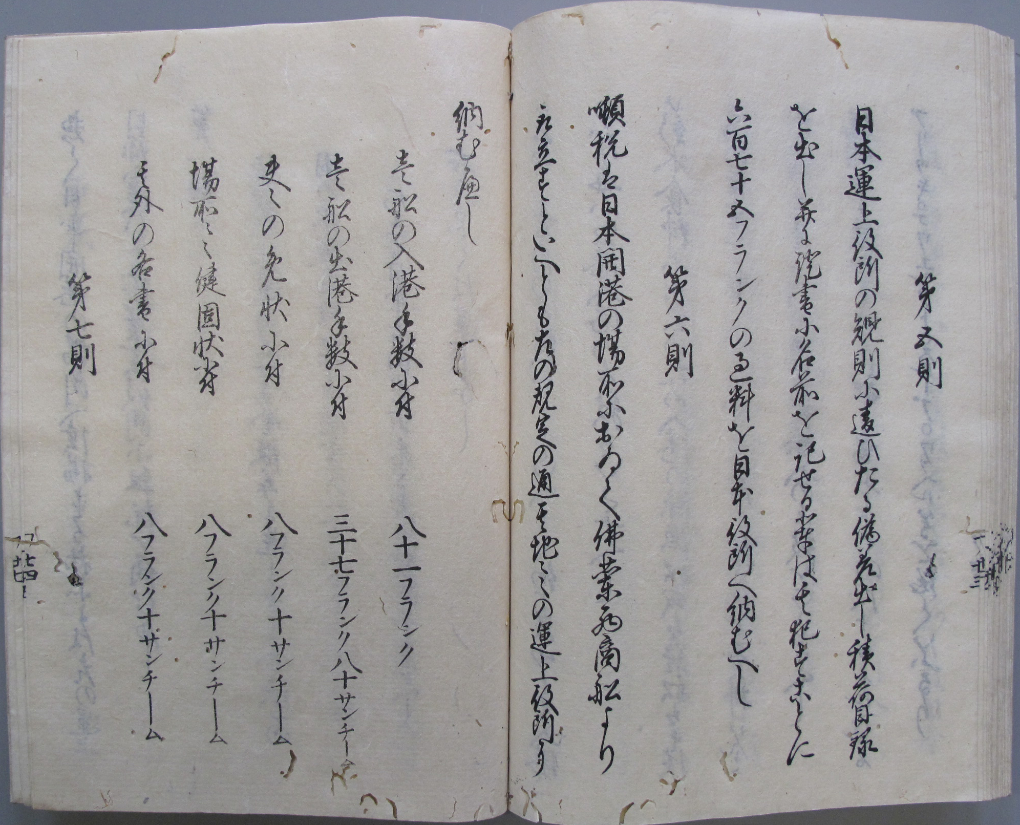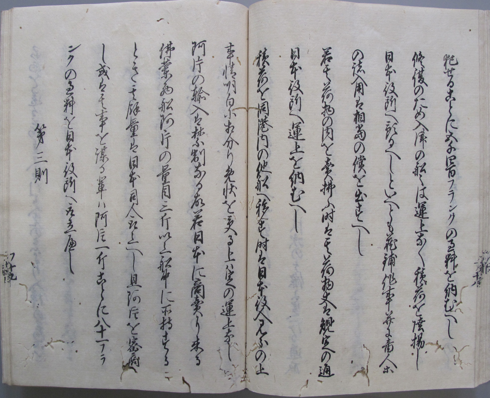 木版本 安政5(1858)年に米・露・仏・英・蘭と通商条約を締結。その条約文などについて書かれています。通商条約の内容は、印刷物として広く流布しました。