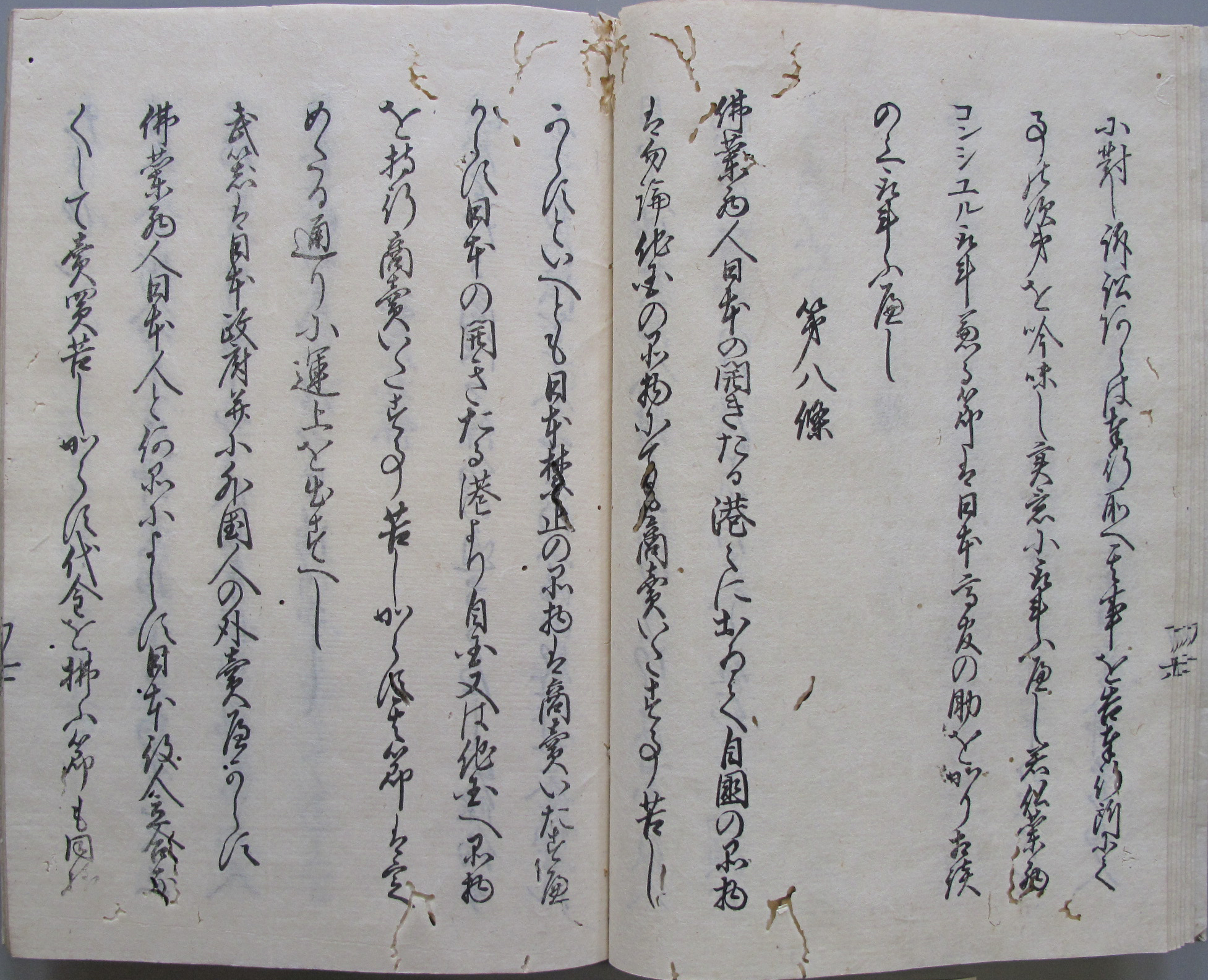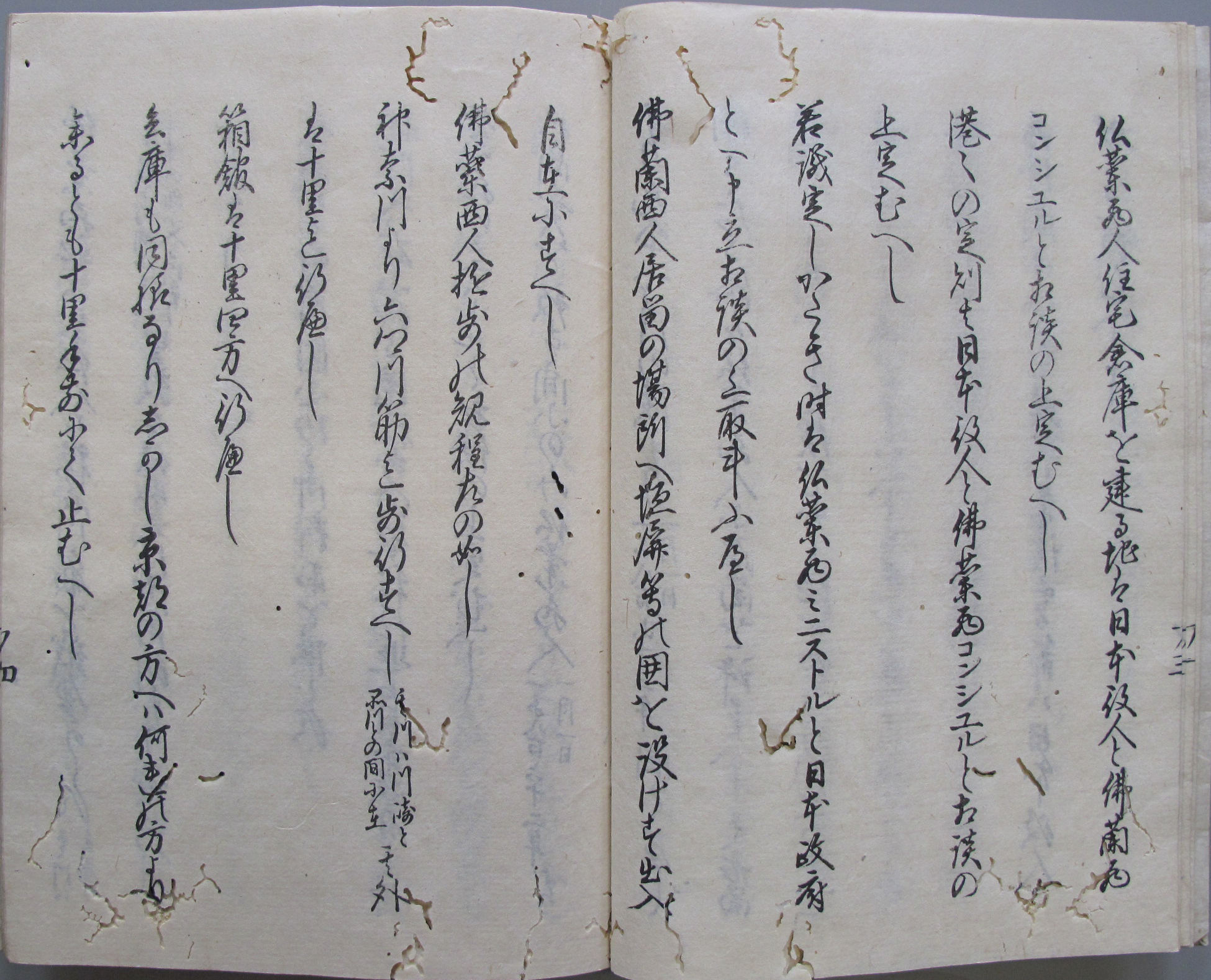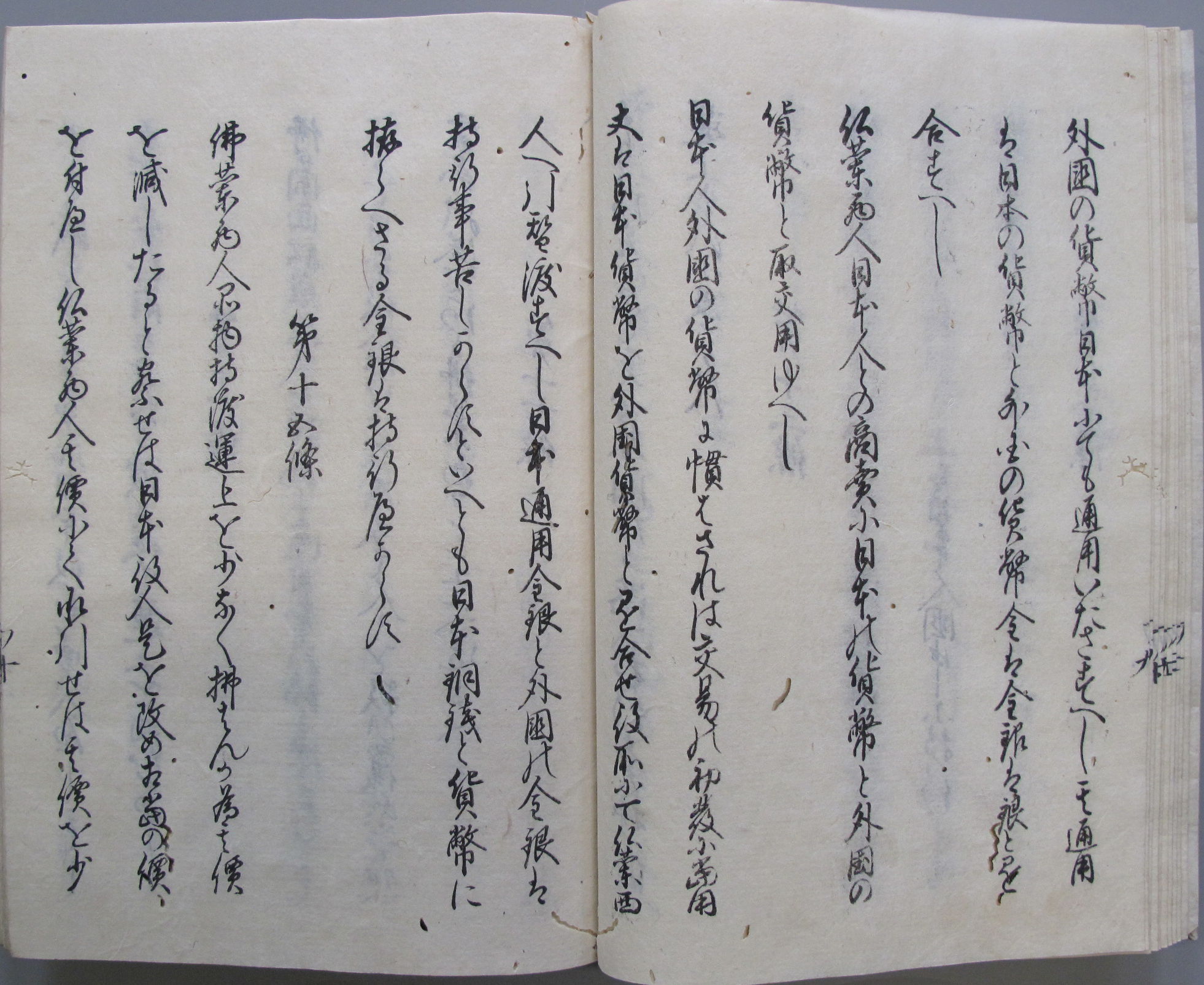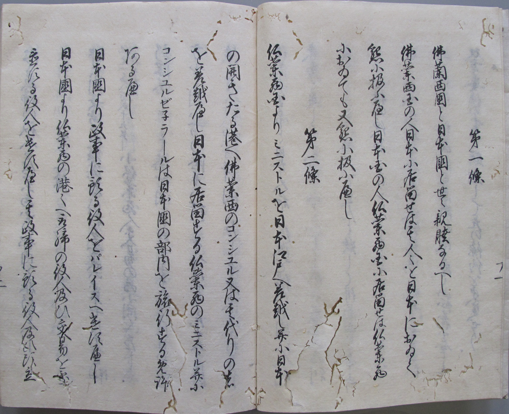 木版本 安政5(1858)年に米・露・仏・英・蘭と通商条約を締結。その条約文などについて書かれています。通商条約の内容は、印刷物として広く流布しました。