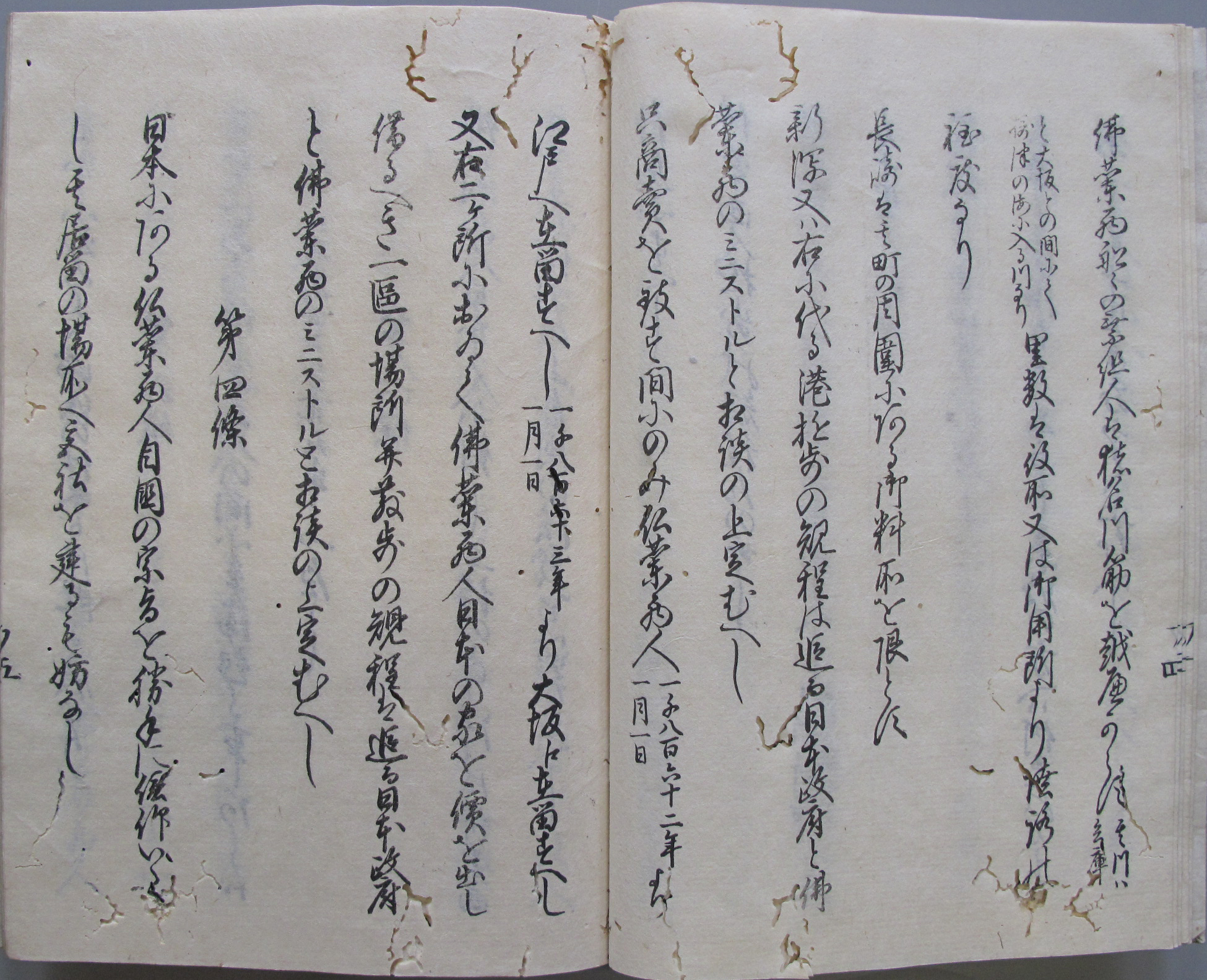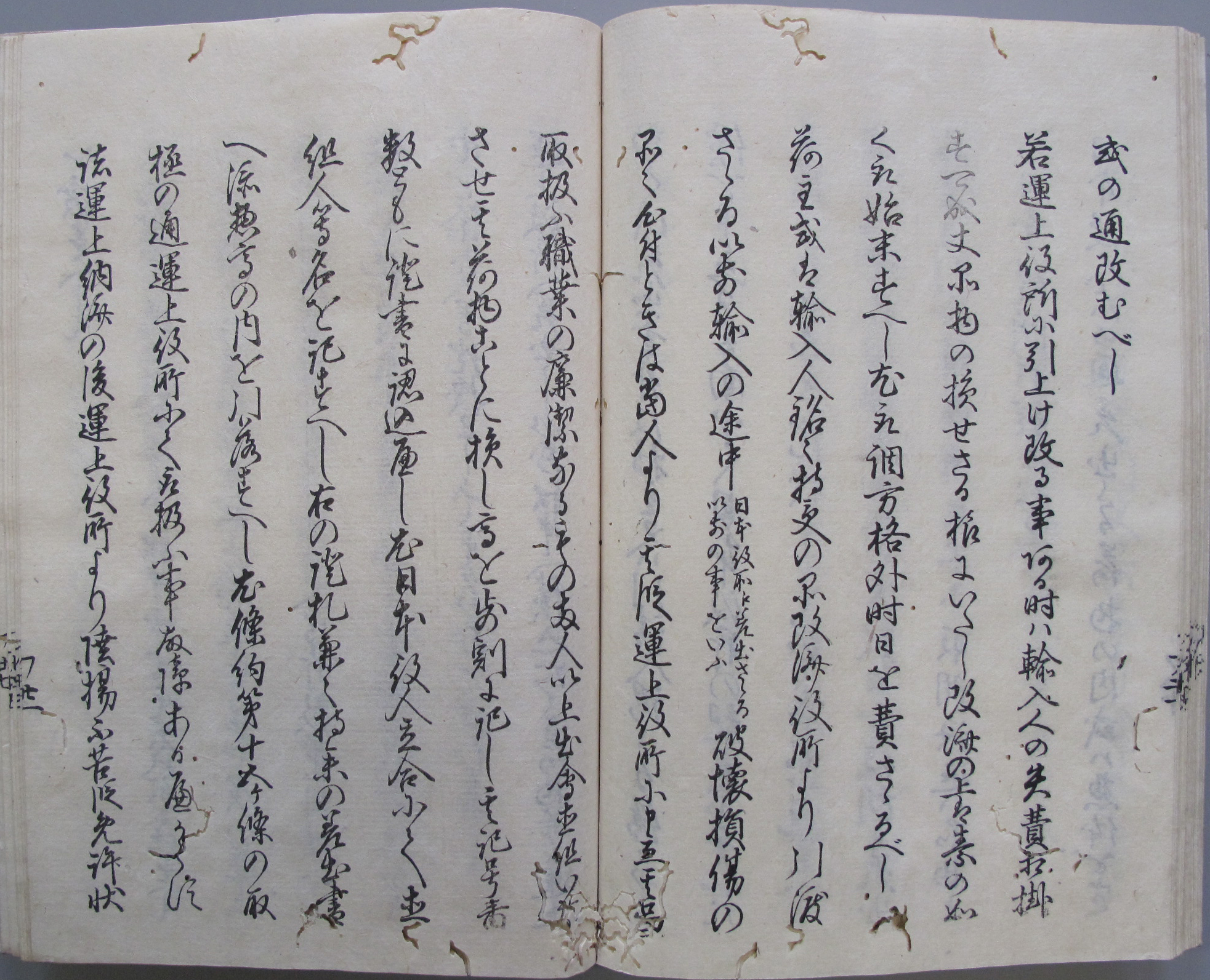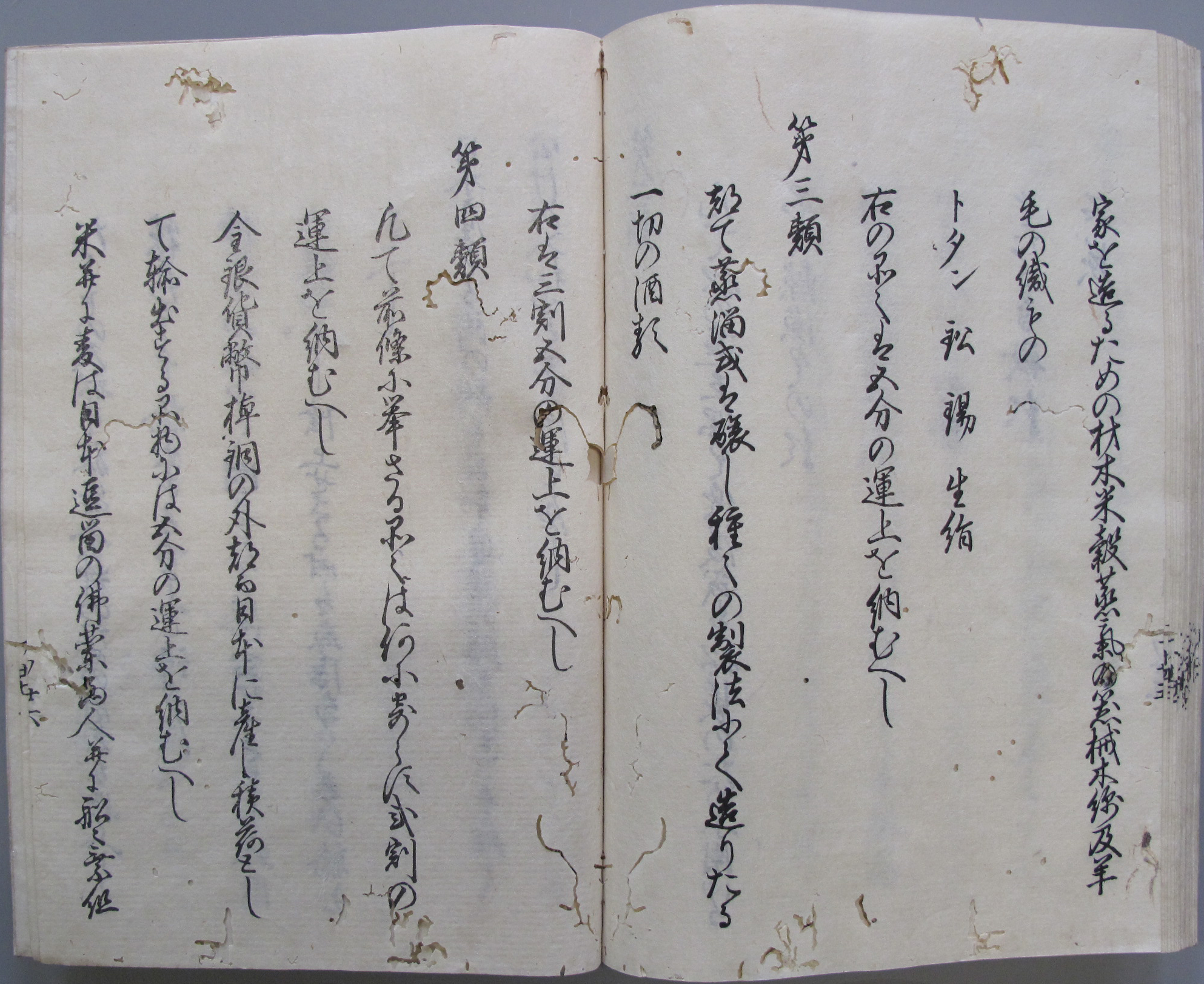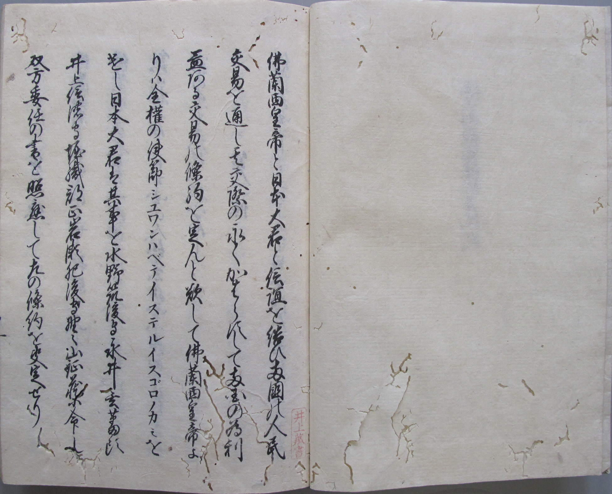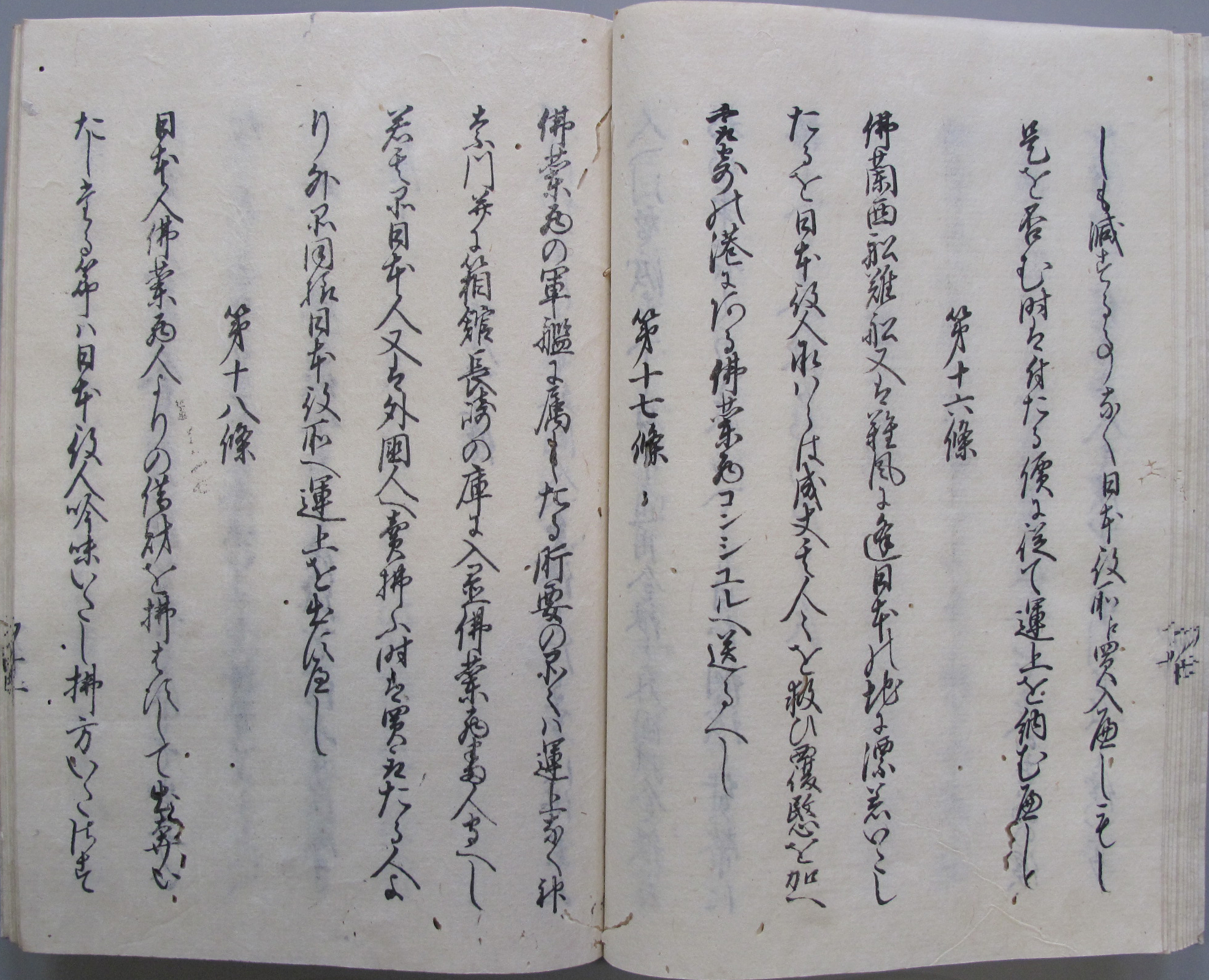 木版本 安政5(1858)年に米・露・仏・英・蘭と通商条約を締結。その条約文などについて書かれています。通商条約の内容は、印刷物として広く流布しました。