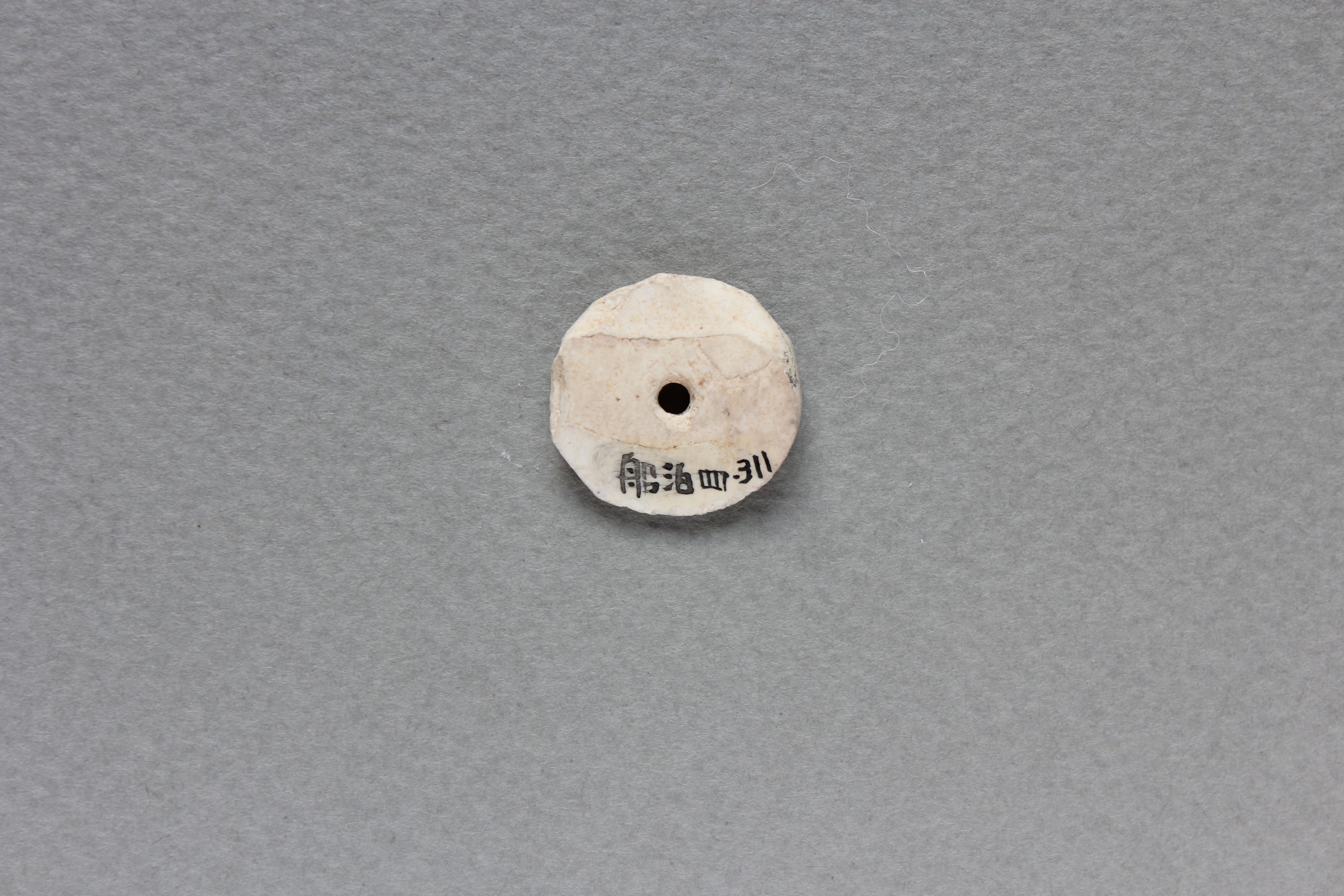 ビノスガイを打ち欠いて、中心部に両側穿孔。周縁を磨いている。