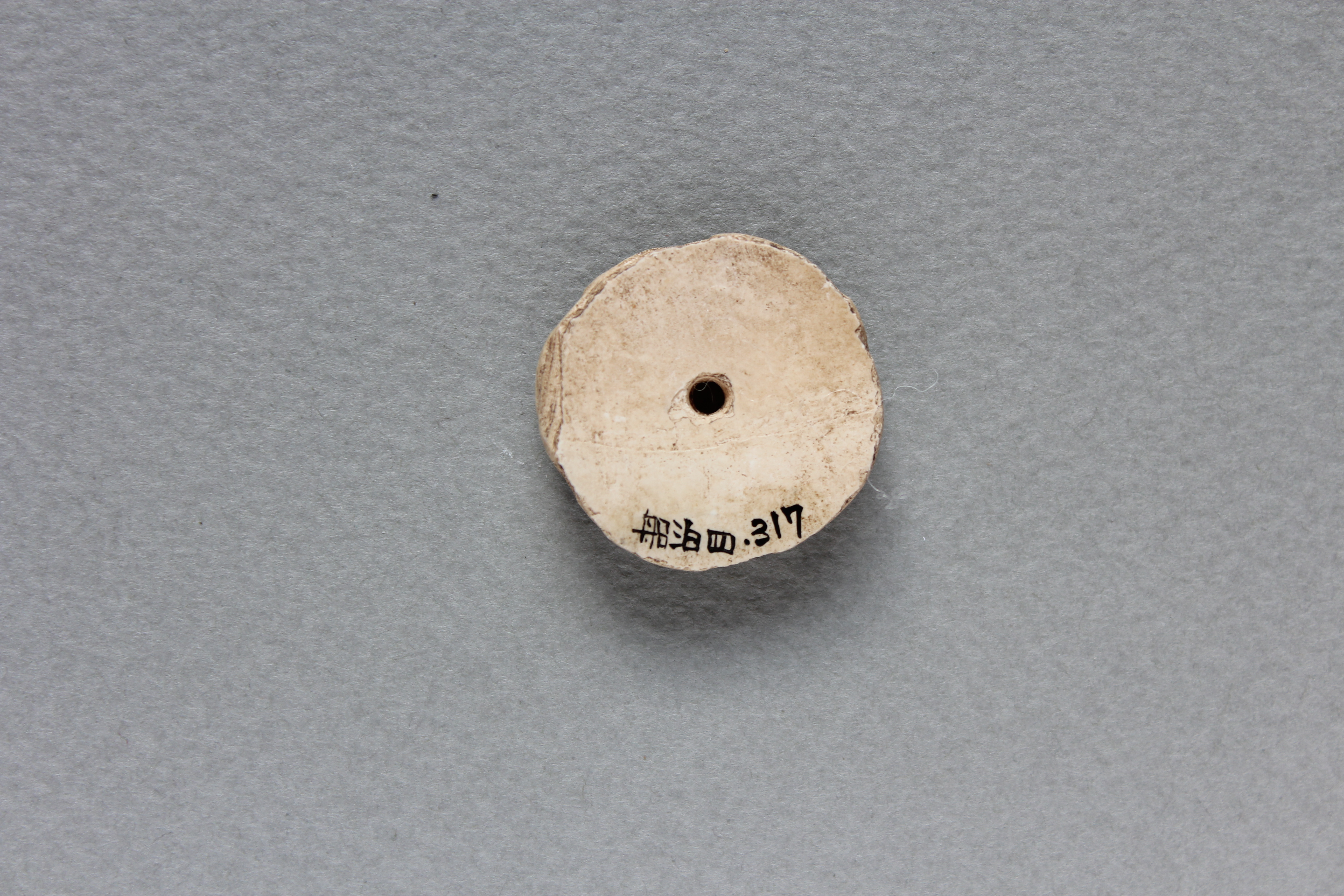 ビノスガイを打ち欠いて、四隅突出させた方形に差し出して四隅に両側穿孔。周縁を磨いている。