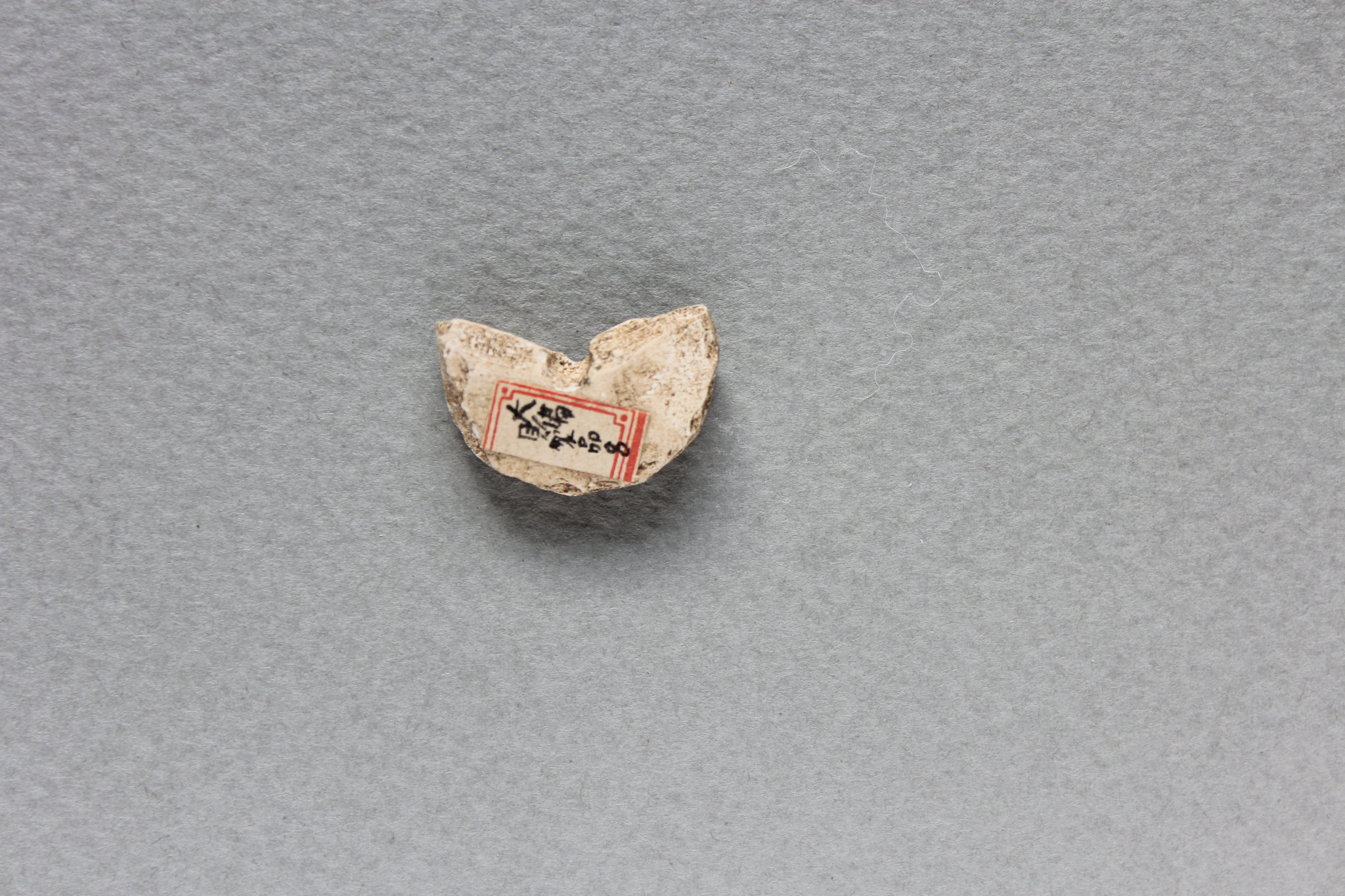 ビノスガイを打ち欠いて、四隅突出させた方形に差し出して四隅に両側穿孔。周縁を磨いている。