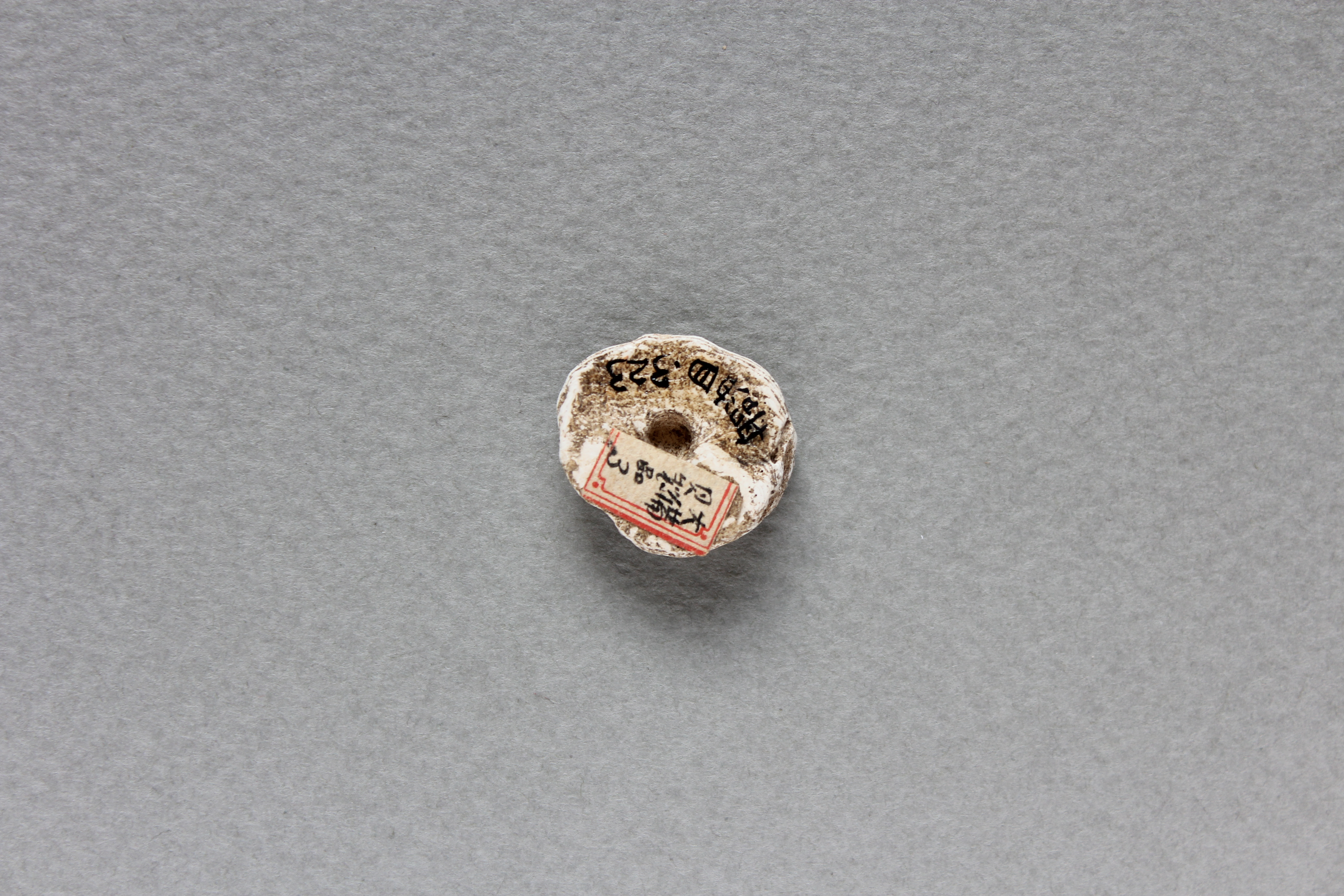 ビノスガイを打ち欠いて、中心部に両側穿孔。周縁を磨いている。