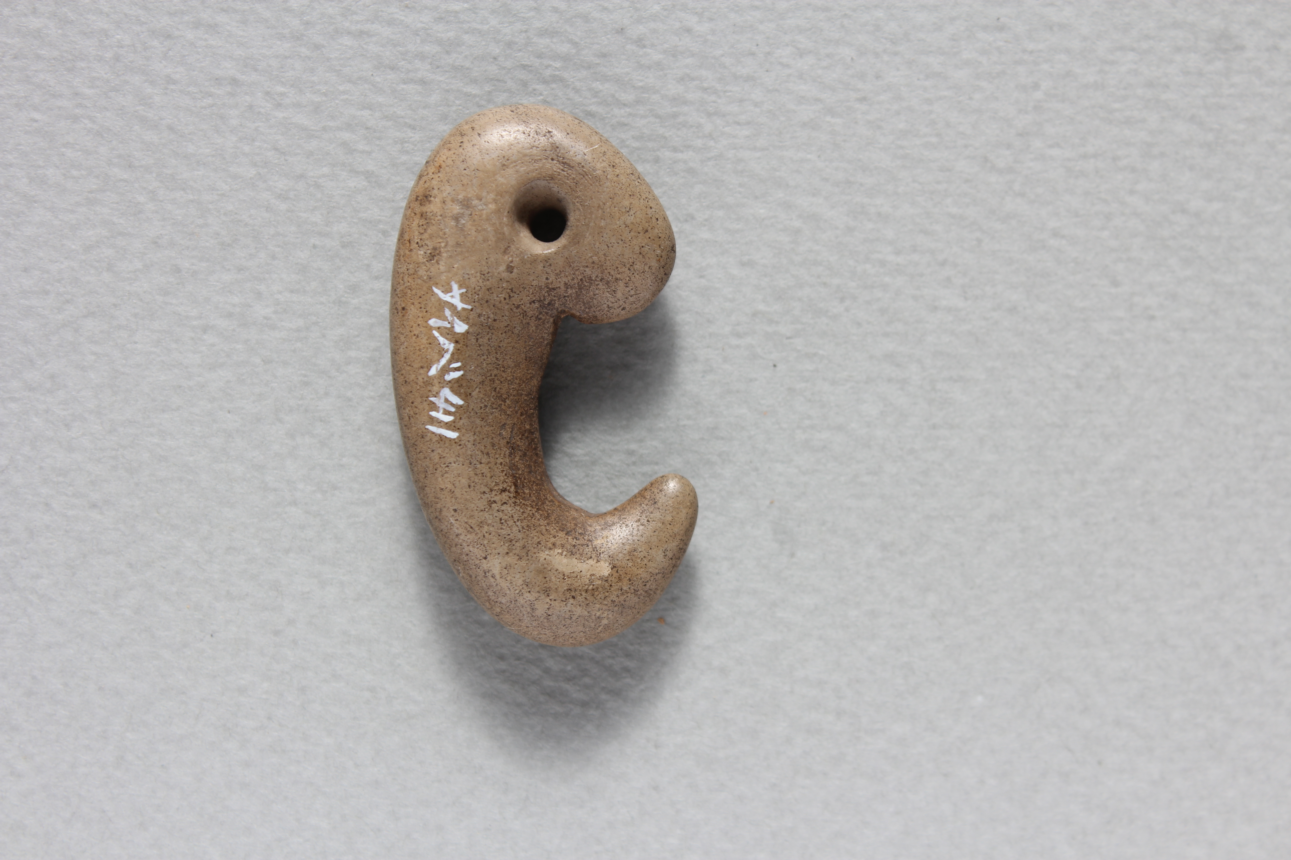 完形。頁岩製の勾玉。頭部は丸く、尾部の先は砂嘴状となる。